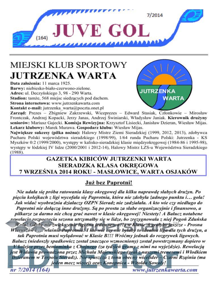 MIEJSKI KLUB SPORTOWY JUTRZENKA WARTA Data założenia: 11 marca 1925. Barwy: niebiesko-biało-czerwono-zielone. JUTRZENKA Adres: ul. Deczyńskiego 3, 98 - 290 Warta. Stadion: tamże, 568 miejsc siedzących pod dachem. WARTA Strona internetowa: www.jutrzenkawarta.com Kontakt e-mail: [email protected] Zarząd: Prezes – Zbigniew Zakrzewski, Wiceprezes – Edward Stasiak, Członkowie – Mirosław Frontczak, Andrzej Kopacki, Jerzy Janas, Andrzej Świniarski, Władysław Janiak. Kierownik drużyny seniorów: Mariusz Gajecki. Komisja Rewizyjna: Krzysztof Lisiecki, Janisław Dzieran, Wiesław Mijas. Lekarz klubowy: Marek Murawa. Gospodarz klubu: Wiesław Mijas. Największe sukcesy (piłka nożna): Halowy Mistrz Ziemi Sieradzkiej (1999, 2012, 2013), zdobywca Pucharu Polski województwa sieradzkiego (1998/99), 1/64 runda Pucharu Polski: Jutrzenka - KS Myszków 0:2 (1999/2000), występy w kalisko-sieradzkiej klasie międzyokręgowej (1984-86 i 1995-98), występy w łódzkiej IV lidze (2000/2001 i 2012-14), Halowy Mistrz LZS-u Województwa Sieradzkiego (1988). GAZETKA KIBICÓW JUTRZENKI WARTA SIERADZKA KLASA OKRĘGOWA 7 WRZEŚNIA 2014 ROKU - MASŁOWICE, WARTA OSJAKÓW Już bez Paprotni! Nie udała się próba ratowania klasy okręgowej dla kilku naprawdę słabych drużyn. Po pięciu kolejkach z ligi wycofała się Paprotnia, która nie zdobyła żadnego punktu i… gola! Jak widać wyobraźnia działaczy OZPN Sieradz nie zadziałała. A kto wie czy niedługo do Paprotni nie dołączą inne drużyny. Są po prostu za słabe organizacyjnie i finansowo, a piłkarze za darmo nie chcą grać nawet w klasie okręgowej! Niestety! A Bałucz notabene rewelacja rozpoczęcia sezonu utrzymałby się w lidze, bo zrezygnowała z niej Pogoń Zduńska TM - Prosna Wola! Gdyby nie zwiększenie ligi (na jeden sezon!?) w Klasie A grałyby jeszcze Wieruszów i … właśnie Paprotnia! I kto wie czy nie byłaby to idealna liga dla tych drużyn, a tak Paprotnia musi wylądować w Klasie B!!! Wróćmy jednak do rozgrywek ligowych. Bałucz (niedoszły spadkowicz został znacząco wzmocniony) został powstrzymany dopiero w V kolejce przez beniaminka z Chojnego (za tydzień gramy z nimi na wyjeździe). Rewelacją jest Widawia prowadzona przez Michała Majewskiego (grał z naszymi trenerami i Włodkiem Dzieranem w Terpolu Sieradz). Nie spuszcza z tonu obecny wicelider – Czarni Rząśnia (ma jeden mecz więcej) oraz Konopnica - Witolda Sowały! PDF Editor nr 7/2014 (164) www.jutrzenkawarta.com KLUB FINANSOWANY I WSPIERANY PRZEZ: GMINA I MIASTO WARTA PAN MAREK MURAWA TM PDF Editor nr 7/2014 (164) www.jutrzenkawarta.com OKIEM KIBICA: Powiedz: Gibraltar Gibraltar większości z nas kojarzy się raczej z językowym łamańcem niż z poważną drużyną piłkarską. A jednak przed dzisiejszym meczem przeważa ostrożny optymizm. Selekcjoner Adam Nawałka stwierdził nawet, że nasz pierwszy przeciwnik w eliminacjach do ME gra na poziomie Litwy, z którą zazwyczaj toczymy zacięte boje o prym w tej części Europy. Czy to sposób na okazanie szacunku do przeciwnika (słabych rywali przecież nie ma!), zasłona dymna a może ewentualne zabezpieczenia na wypadek kłopotów z wynikiem? Pewnie wszystko po trochu. Gibraltar to najmniejszy członek FIFA (mniejszy niż San Marino), mający 600 zarejestrowanych piłkarzy. Dla porównania w Polsce mamy około 657 tysięcy zawodników. Gibraltar w strukturach FIFA jest od 23 maja 2013 roku, my od 1923 roku. Polska w rankingu FIFA sklasyfikowana jest na 69 miejscu, nasz przeciwnik natomiast jeszcze czeka na ujęcie w tej kwalifikacji. W statystykach, rankingach i datach nasza przewaga nie podlega dyskusji. Czy zatem dalej możemy się obawiać dzisiejszego starcia? Oczywiście nie. Jednakże statystyki ostatnich oficjalnych meczów polskiej reprezentacji o stawkę nie napawają optymizmem. Z ponad dwudziestu ostatnich gier o punkty w eliminacjach do kolejnych mistrzostw wygraliśmy zaledwie pięć, z czego cztery z San Marino. Ostatnie trzy punkty w meczu o stawkę zainkasowaliśmy w październiku 2009 roku we Wrocławiu, w starciu ze Słowacją. Nasi reprezentanci nie tylko odwykli od meczów eliminacyjnych do Mistrzostw Europy, ale również mogą już nie pamiętać jak smakuje zwycięstwo w meczu grupy eliminacyjnej. Z obecnego składu reprezentacji zwycięstwo ze Słowacją pamiętać może jedynie Robert Lewandowski (wszedł wtedy z ławki za Ireneusza Jelenia). Od ostatniego poważnego zwycięstwa minie niedługo pięć lat. Dokładnie będzie to miało miejsce w dniu meczu ze Szkocją na Stadionie Narodowym. Zanim jednak dojdzie do tego ważnego spotkania (mamy nadzieję, że właśnie ze Szkotami stoczymy bój o drugie miejsce w grupie), zmierzymy się z nowicjuszami w gronie oficjalnych europejskich reprezentacji. Piłkarze naszej kadry na początku sezonu 2014/2015 – wydają się w dobrej formie. W bramce Wojciech Szczęsny, który na razie wygrywa rywalizację w Arsenalu Londyn z Kolumbijczykiem Davidem Ospiną, w obronie odmieniony Łukasz Piszczek, w pomocy niszczyciel hiszpańskim wirtuozów środka pola – Grzegorz Krychowiak, a w ataku Robert Lewandowski i Arkadiusz Milik – piłkarz bądź co bądź – Ajaxu Amsterdam. Naprzeciwko naszych zawodowców staną dziś amatorzy i półamatorzy z Gibraltaru. Wynik inny niż zwycięstwo naszych reprezentantów nie jest możliwy. Mało tego, jeśli nie strzelimy rywalom co najmniej sześciu czy siedmiu bramek – będzie wstyd. Nie może być w tym przypadku mowy o oszczędzaniu przeciwników. Jak mawia Franciszek Smuda: „jak masz frajera to go duś”. Musimy na początek eliminacji wygrać wyraźnie, robiąc sobie w świetle kamer trening strzelecki przed meczem ze Szkocją. W eliminacjach do Mistrzostw Europy kluczowe będą wszystkie starcia za wyjątkiem meczów z mistrzami świata. To w starciach z Gibraltarem, Szkocją, Irlandią czy Gruzją musimy szukać kompletów punktów. Ważne będą również bramki strzel