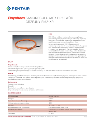 SAMOREGULUJĄCY PRZEWÓD GRZEJNY EM2-XR Opis EM2-XR jest solidnym i wytrzymałym samoregulującym przewodem grzejnym przeznaczonym do łatwego, szybkiego w montażu i efektywnego systemu ogrzewania podjazdów zapobiegającego gromadzeniu się śniegu i lodu. Samoregulujący przewód EM2-XR automatycznie dostosowuje swoją moc do warunków zewnętrznych; większa moc grzewcza jest generowana w niskich temperaturach, a mniejsza moc w wyższych. Przewód może być cięty na dowolne odcinki na placu budowy dając pełną elastyczność podczas montażu. Może być również dostarczany w formie gotowych elementów grzejnych z podłączonym przewodem zasilającym i zamontowanymi zakończeniami, spełniających wymagania naszych klientów (długości przewodów różnią się w zależności od zamówienia). Zalety Projektowanie Dostosowany do każdego kształtu i wielkości podjazdu. Zmienna moc grzewcza spełniająca wymagania projektu. Dowolne długości (przewód cięty na odcinki) pozwalają na dokładny dobór przewodu do wielkości podjazdu. Montaż Przewód cięty na odcinki w miejscu montażu pozwala na dostosowanie się do zmian w projekcie powstałych na placu budowy. Dostępny w odcinkach, jako gotowy element grzewczy, lub produkowany na zamówienie skonfigurowany wg specyfikacji spełniającej wymagania montażowe. Zastosowania Podjazdy i drogi dojazdowe Chodniki Zatoki załadunkowe / Centra dystrybucyjne Drogi kołowania i miejsca postoju samolotów na lotniskach Dane techniczne Moc nominalna: 90 W/m przy 0°C Napięcie: 230 Vac Maks. temperatura ekspozycji: 100°C Minimalna temperatura montażu: -20°C Wymiary: 18,9 mm x 9,5 mm Wymagany wyłącznik nadmiarowy: Charakterystyka C (maks. 50 A) Konstrukcja przewodu: Samoregulujący przewód grzejny, w oplocie i powłoce zewnętrznej. Certyfikaty: CE, VDE THERMAL MANAGEMENT SOLUTIONS PO-RaychemEM2XR-DS-CDE1235-Rev1 01/13 1/3 SAMOREGULUJĄCY PRZEWÓD GRZEJNY EM2-XR Produkty powiązane VIA-DU-20 Programowalny sterownik przeznaczony do ogrzewania ramp, podjazdów i chodników z czujnikami temperatury i wilgotności gruntu oraz czujnikiem temperatury powietrza. VIA-L1 Przewód zasilający odporny na działanie wysokiej temperatury (3 x 6mm²). VIA-CE1 Wodoszczelny zestaw przyłączeniowy i zakończeniowy. VIA-JB2 Skrzynka przyłączeniowa odporna na działanie wysokiej temperatury. Opakowania i nr katalogowe Przewód grzejny EM2-XR jest dostępny jako standardowy przewód, gotowe zestawy, lub jako element grzewczy produkowany na zamówienie: Symbol produktu Nr katalogowy Opis EM2-XR 449561-000 Samoregulujący przewód grzejny EM2-XR-10-17m 1244-001512 Fabrycznie zakończony element grzewczy EM2-XR-18-28m 1244-001513 Fabrycznie zakończony element grzewczy EM2-XR-29-35m 1244-001514 Fabrycznie zakończony element grzewczy EM2-XR-36-45m 1244-001515 Fabrycznie zakończony element grzewczy EM2-XR-46-55m 1244-001516 Fabrycznie zakończony element grzewczy EM2-XR-56-70m 1244-001517 Fabrycznie zakończony element grzewczy EM2-XR-71-85m 1244-001518 Fabrycznie zakończony element grzewczy Przewód grzejny Raychem Viagard 1244-005360 Fabrycznie zakończony element grzewczy, długość przewodu grzejnego i zasilającego wskazana przez klienta.. Przygotowanie podłoża przed montażem Przewody grzejne powinny być układana na stabilnym podłożu. Dla konstrukcji wiszących podłoże może składać się z gotowych płyt, sprężonego lub wylewanego betonu. Przewody grzejne mogą być układane na wszystkich podłożach włącznie z prętami zbrojeniowymi. W przypadku wylewanego betonu należy upewnić się, że powierzchnia jest gładka a wszystkie ostre obiekty zostały usunięte. Rampy na stałych podłożach nie wymagają dodatkowej izolacji termicznej. Dodatkowego przygotowania wymaga montaż czujnika wilgotności i temperatury gruntu. Instrukcja montażu Kompletne instrukcje montażu dostarczane są wraz z produktem, są również dostępne w formie elektronicznej za pośrednictwem Pentair Thermal Management. Proszę pytać o instrukcję montażu, o numerze: INST-159. Specification guideline Specyfikacja doboru produktu dostępna jest na życzenie za pośrednictwem Pentair Thermal Management. Jest również dostępna na stronie internetowej: www.pentair.thermal.com 2/3 PO-RaychemEM2XR-DS-CDE1235-Rev1 01/13 THERMAL MANAGEMENT SOLUTIONS WWW.THERMAL.PENTAIR.COM Polska Tel. +48 22 331 29 50 Fax +48 22 331 29 51 [email protected] All Pentair trademarks and logos are owned by Pentair. All other brand or product names are trademarks or registered marks of their respective owners. Because we are continuously improving our products and services, Pentair reserves the right to change specifications without prior notice. Pentair is an equal opportunity employer. © 2013 Pentair. All Rights Reserved. THERMAL MANAGEMENT SOLUTIONS PO-RaychemEM2XR-DS-CDE1235-Rev1 01/13 3/3