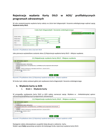 Rejestracja wydania Karty programach zdrowotnych DiLO w AOS/ profilaktycznych W celu zarejestrowania wydania karty należy na Liście kart diagnostyki i leczenia onkologicznego wybrać opcję Wydanie karty DiLO. Rysunek 1 Przykładowe okno Listy kart DiLO Jako pierwsze wyświetlone zostanie okno (1) Rejestracja wydania karty DiLO – Miejsce wydania. Rysunek 2 Przykładowe okno (1) Rejestracji wydania karty DiLO – Miejsce wydania W kroku tym należy wskazać gdzie jest wydawana karta diagnostyki i leczenia onkologicznego. 1. Wydanie karty w AOS I. Krok 1 - Wydanie karty W przypadku wydawania karty DiLO w AOS należy zaznaczyć opcję: Wydana w : Ambulatoryjnej opiece zdrowotnej/profilaktycznych programach zdrowotnych Rysunek 3 Przykładowe okno (1) Rejestracji wydania karty DiLO – Miejsce wydania w AOS Następnie należy obowiązkowo uzupełnić datę decyzji o założeniu karty. Wybór opcji Dalej spowoduje przejście do kolejnego kroku rejestracji wydania karty DiLO. Wybór opcji Anuluj spowoduje anulowanie rejestracji. II. Krok 2 – Dane wydającego oraz dane posiadacza karty W kroku wydanie karty rejestrowane są informacje dotyczące lekarza wydającego kartę oraz pacjenta, dla którego karta jest wydawana. Wprowadzone informacje będą drukowane na Karcie diagnostyki i leczenia onkologicznego wydawanej pacjentowi. Rysunek 4 Przykładowe okno (1) Rejestracji wydania karty DiLO – Wydanie karty w AOS/w ramach PPZ Wszystkie pola oznaczone * (gwiazdką) są polami wymaganymi. AB.1 Lekarz wydający kartę W przypadku, gdy wydanie rejestrowane jest przez lekarza, część Lekarz wydający kartę zostanie uzupełniona na podstawie danych konta dostępowego. W przypadku, gdy wydanie rejestrowane jest przez operatora świadczeniodawcy, uzupełnienie części Lekarz wydający kartę należy rozpocząć od ręcznego wpisania numeru prawa wykonywania zawodu lekarskiego, a następnie skorzystać z opcji lupy. Poniżej przedstawiono możliwości zachowania systemu: W przypadku wpisania prawidłowego numeru NPWZ, imię i nazwisko lekarza zostanie uzupełnione automatycznie. Jeżeli wprowadzony NPWZ nie będzie zgodny z algorytmem budowy, operator zostanie powiadomiony o tym fakcie stosownym komunikatem. W przypadku nieodnalezienia w bazie danego numeru prawa wykonywania zawodu lekarskiego, operatorowi zostanie wyświetlony komunikat informujący, iż w systemie informatycznym OW NFZ nie znaleziono osoby o danym numerze NPWZ. W przypadku odnalezienia wielu wpisów dla danego numeru prawa wykonywania zawodu lekarskiego, operator otrzyma informację, iż w systemie informatycznym OW NFZ dane osoby o danym numerze NPWZ są niejednoznaczne i należy je uzupełnić samodzielnie. Lekarz wskazany w rejestracji wydania karty musi być zarejestrowany w bazie OW NFZ oraz wykazany w potencjale świadczeniodawcy do umowy z NFZ, w ramach której nastąpi sprawozdanie wydania karty DiLO. AC. Informacje o posiadaczu karty W części Informacje o posiadaczu katy należy wprowadzić dane pacjenta, dla którego wydawana jest karta. Pola dostępne do uzupełnienia mogą się dynamicznie zmieniać w zależności od wybranych opcji. Dane osobowe pacjenta [AC.1.] Uzupełnienie informacji dla osoby dorosłej, zdolnej do świadomego wyrażania zgody Rejestracja danych pacjenta w części AC.1. wymaga wprowadzenia: o Nazwiska i imienia pacjenta o Typu identyfikatora, którym posługuje się pacjent: 1. PESEL 2. PIN (Personal Identyfication Number) uzupełniany w przypadku uprawnionych do świadczeń na podstawie przepisów o koordynacji 3. Dowód osobisty – seria i numer 4. Paszport – seria i numer 5. Inny dokument – seria i numer pacjentów Jeśli pacjent jest Polakiem i ma nadany numer PESEL należy wybrać PESEL jako typ identyfikatora o Wskazanie typu identyfikatora 2-5 spowoduje uaktywnienie dodatkowych pól do uzupełnienia (data urodzenia, płeć pacjenta) Wartość identyfikatora – w polu tym należy wpisać identyfikator pacjenta, np.: PESEL Wartość identyfikatora pacjenta w wydanej karcie powinna być zgodna z identyfikatorem pacjenta wykazywanym w komunikacie statystycznym z realizacji umowy z NFZ. o Rejestracja danych adresowych - adres miejsca zamieszkania pacjenta W przypadku, gdy pacjent mieszka poza granicami Polski należy zaznaczyć opcję Pacjent nie posiada adresu zamieszkania na terytorium Polski. Zaznaczenie opcji wymaga podania kodu państwa, w którym mieszka pacjent. W danych adresowych należy uzupełnić pola wymagane: kod pocztowy, miejscowości, ulica (jeśli występuje w adresie), numer domu, numer lokalu (jeśli występuje w adresie). Uzupełnienie pola miejscowość (na terytorium Polski) wymaga wprowadzenia przynajmniej trzech pierwszych znaków nazwy miejscowości i wybrania nazwy z wyświetlanego słownika. Im więcej znaków, tym dokładniej podpowiadany jest słownik. Jeśli nazwa nie zostanie wybrana ze słownika i system nie wykryje jednoznacznej zgodności wprowadzonej nazwy z nazwą pozycji słownikowej, pole zostanie oznaczone jako błędnie uzupełnione. Uzupełnienie informacji dla osoby małoletniej, całkowicie ubezwłasnowolnionej lub niezdolnej do świadomego wyrażania zgody W przypadku osób małoletnich uzupełnienie formularza danych osobowych wymaga zaznaczenia opcji Pacjent jest osobą małoletnią, całkowicie ubezwłasnowolnioną lub niezdolną do świadomego wyrażenia zgody. W efekcie zaznaczenia opcji wymaganą do uzupełnienia będzie część Dane przedstawiciela ustawowego albo opiekuna faktycznego (AC.2.). Dane personalne i adresowe uzupełnia się analogicznie do uzupełniania danych dla osoby dorosłej. Uzupełnienie informacji dla noworodka W przypadku noworodków uzupełniając część AC.1. konieczne jest zaznaczenie opcji: o Pacjent jest osobą małoletnią, całkowicie ubezwłasnowolnioną lub niezdolną do świadomego wyrażenia zgody o Wystawiono noworodkowi W efekcie zaznaczenia opcji dodatkowo wymagane do uzupełnienia będą pola: