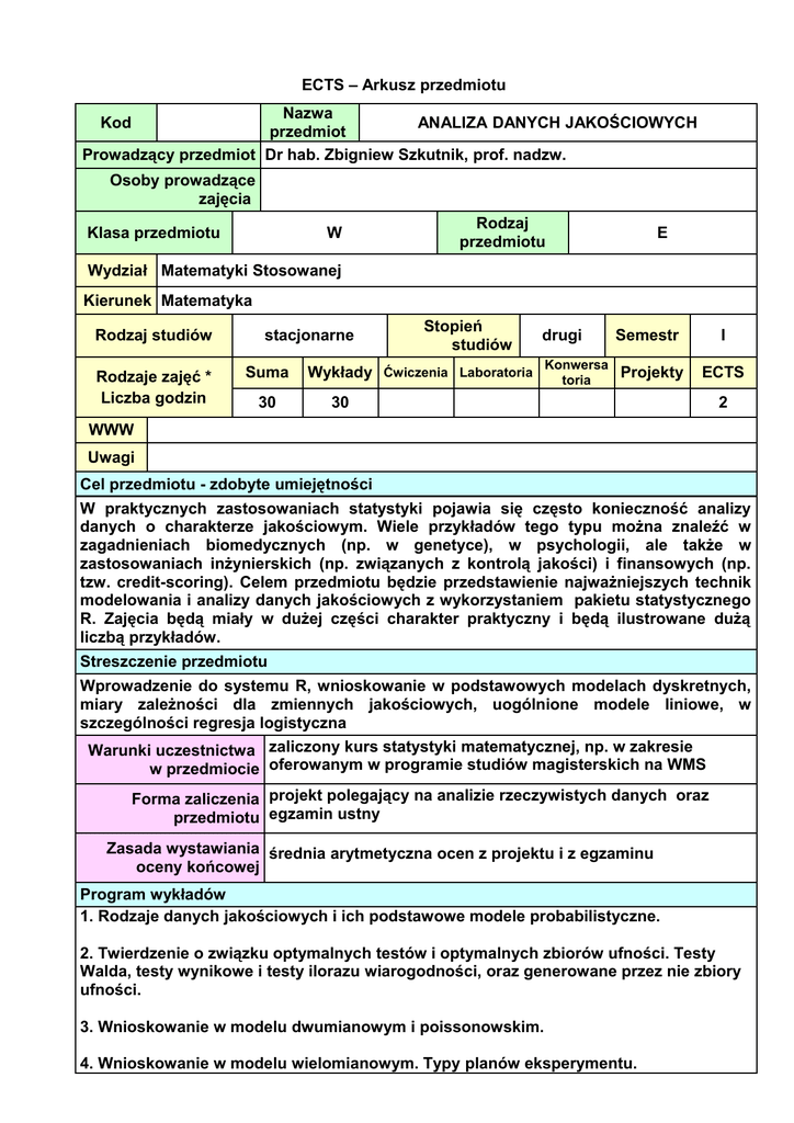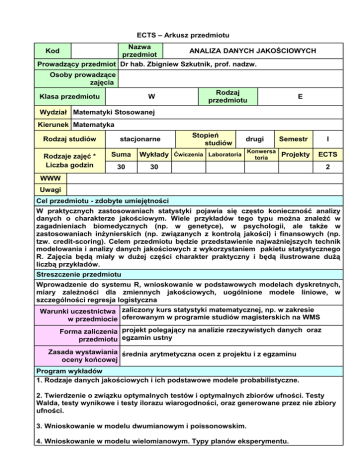 ECTS – Arkusz przedmiotu Nazwa ANALIZA DANYCH JAKOŚCIOWYCH przedmiot u Zbigniew Szkutnik, prof. nadzw. Prowadzący przedmiot Dr hab. Kod Osoby prowadzące zajęcia Klasa przedmiotu W Rodzaj przedmiotu E Wydział Matematyki Stosowanej Kierunek Matematyka Rodzaj studiów Rodzaje zajęć * Liczba godzin stacjonarne Suma 30 Stopień studiów drugi Semestr Konwersa Wykłady Ćwiczenia Laboratoria Projekty toria I ECTS 30 2 WWW Uwagi Cel przedmiotu - zdobyte umiejętności W praktycznych zastosowaniach statystyki pojawia się często konieczność analizy danych o charakterze jakościowym. Wiele przykładów tego typu można znaleźć w zagadnieniach biomedycznych (np. w genetyce), w psychologii, ale także w zastosowaniach inżynierskich (np. związanych z kontrolą jakości) i finansowych (np. tzw. credit-scoring). Celem przedmiotu będzie przedstawienie najważniejszych technik modelowania i analizy danych jakościowych z wykorzystaniem pakietu statystycznego R. Zajęcia będą miały w dużej części charakter praktyczny i będą ilustrowane dużą liczbą przykładów. Streszczenie przedmiotu Wprowadzenie do systemu R, wnioskowanie w podstawowych modelach dyskretnych, miary zależności dla zmiennych jakościowych, uogólnione modele liniowe, w szczególności regresja logistyczna Warunki uczestnictwa zaliczony kurs statystyki matematycznej, np. w zakresie w przedmiocie oferowanym w programie studiów magisterskich na WMS Forma zaliczenia projekt polegający na analizie rzeczywistych danych oraz przedmiotu egzamin ustny Zasada wystawiania średnia arytmetyczna ocen z projektu i z egzaminu oceny końcowej Program wykładów 1. Rodzaje danych jakościowych i ich podstawowe modele probabilistyczne. 2. Twierdzenie o związku optymalnych testów i optymalnych zbiorów ufności. Testy Walda, testy wynikowe i testy ilorazu wiarogodności, oraz generowane przez nie zbiory ufności. 3. Wnioskowanie w modelu dwumianowym i poissonowskim. 4. Wnioskowanie w modelu wielomianowym. Typy planów eksperymentu. 5. Ryzyko względne, ilorazy szans, zmienne ukryte i paradoks Simpsona. 6. Miary zależności dla zmiennych nominalnych: współczynniki Goodmana-Kruskala i Theila. 7. Współczynnik gamma Goodmana-Kruskala zależności dla zmiennych o wartościach uporządkowanych. Test niezależności chi-kwadrat i test ilorazu wiarogodności. 8. Dokładny test Fishera niezależności w tablicach kontyngencji. 9. Uogólnione modele liniowe (GLM): wstęp i przykłady. Dewiancja. 10. Momenty w rodzinach wykładniczych i funkcja wiarogodności w modelach GLM. 11. Metoda największej wiarogodności dla modeli GLM. Algorytm Newtona-Raphsona i algorytm Fishera z interpretacją jako „iteracyjnie ważona metoda najmniejszych kwadratów”. 12. Regresja logistyczna: estymacja, weryfikacja, interpretacja, przykłady. 13. Kodowanie nominalnych zmiennych objaśniających. Kontrasty proste i resztowe. 14. Kontrasty wielomianowe dla zmiennych jakościowych o wartościach uporządkowanych. Modele GLM z funkcją wiążącą typu log-log. Program pozostałych zajęć (ćwiczenia, laboratoria, projekty, seminaria) Bibliografia 1. A.Agresti, Categorical Data Analysis (2nd edition), Wiley, New York, 2002 (Rozdz. 1-7). 2. J.Koronacki, J.Mielniczuk, Statystyka dla studentów kierunków technicznych i przyrodniczych, WNT, Warszawa, 2001 (Rozdz. 6). * Rodzaje zajęć: ćwiczenia – ćwiczenia audytoryjne, lektoraty, zajęcia wf, laboratoria – ćwiczenia laboratoryjne, zajęcia praktyczne, zajęcia terenowe, seminaria – seminaria, konwersatoria, projekty – ćwiczenia projektowe, prace kontrolne i przejściowe