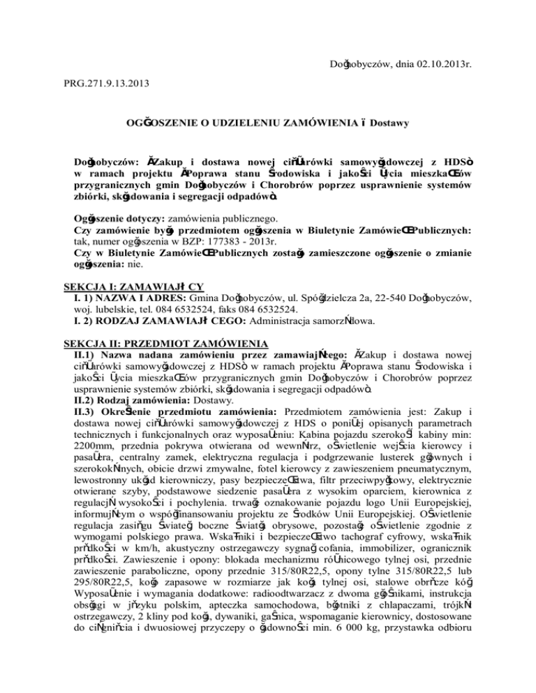 Dołhobyczów, dnia 02.10.2013r. PRG.271.9.13.2013 OGŁOSZENIE O UDZIELENIU ZAMÓWIENIA – Dostawy Dołhobyczów: „Zakup i dostawa nowej ciężarówki samowyładowczej z HDS” w ramach projektu „Poprawa stanu środowiska i jakości życia mieszkańców przygranicznych gmin Dołhobyczów i Chorobrów poprzez usprawnienie systemów zbiórki, składowania i segregacji odpadów”. Ogłoszenie dotyczy: zamówienia publicznego. Czy zamówienie było przedmiotem ogłoszenia w Biuletynie Zamówień Publicznych: tak, numer ogłoszenia w BZP: 177383 - 2013r. Czy w Biuletynie Zamówień Publicznych zostało zamieszczone ogłoszenie o zmianie ogłoszenia: nie. SEKCJA I: ZAMAWIAJĄCY I. 1) NAZWA I ADRES: Gmina Dołhobyczów, ul. Spółdzielcza 2a, 22-540 Dołhobyczów, woj. lubelskie, tel. 084 6532524, faks 084 6532524. I. 2) RODZAJ ZAMAWIAJĄCEGO: Administracja samorządowa. SEKCJA II: PRZEDMIOT ZAMÓWIENIA II.1) Nazwa nadana zamówieniu przez zamawiającego: „Zakup i dostawa nowej ciężarówki samowyładowczej z HDS” w ramach projektu „Poprawa stanu środowiska i jakości życia mieszkańców przygranicznych gmin Dołhobyczów i Chorobrów poprzez usprawnienie systemów zbiórki, składowania i segregacji odpadów”. II.2) Rodzaj zamówienia: Dostawy. II.3) Określenie przedmiotu zamówienia: Przedmiotem zamówienia jest: Zakup i dostawa nowej ciężarówki samowyładowczej z HDS o poniżej opisanych parametrach technicznych i funkcjonalnych oraz wyposażeniu: Kabina pojazdu szerokość kabiny min: 2200mm, przednia pokrywa otwierana od wewnątrz, oświetlenie wejścia kierowcy i pasażera, centralny zamek, elektryczna regulacja i podgrzewanie lusterek głównych i szerokokątnych, obicie drzwi zmywalne, fotel kierowcy z zawieszeniem pneumatycznym, lewostronny układ kierowniczy, pasy bezpieczeństwa, filtr przeciwpyłkowy, elektrycznie otwierane szyby, podstawowe siedzenie pasażera z wysokim oparciem, kierownica z regulacją wysokości i pochylenia. trwałe oznakowanie pojazdu logo Unii Europejskiej, informującym o współfinansowaniu projektu ze środków Unii Europejskiej. Oświetlenie regulacja zasięgu świateł, boczne światła obrysowe, pozostałe oświetlenie zgodnie z wymogami polskiego prawa. Wskaźniki i bezpieczeństwo tachograf cyfrowy, wskaźnik prędkości w km/h, akustyczny ostrzegawczy sygnał cofania, immobilizer, ogranicznik prędkości. Zawieszenie i opony: blokada mechanizmu różnicowego tylnej osi, przednie zawieszenie paraboliczne, opony przednie 315/80R22,5, opony tylne 315/80R22,5 lub 295/80R22,5, koło zapasowe w rozmiarze jak koła tylnej osi, stalowe obręcze kół. Wyposażenie i wymagania dodatkowe: radioodtwarzacz z dwoma głośnikami, instrukcja obsługi w języku polskim, apteczka samochodowa, błotniki z chlapaczami, trójkąt ostrzegawczy, 2 kliny pod koła, dywaniki, gaśnica, wspomaganie kierownicy, dostosowane do ciągnięcia i dwuosiowej przyczepy o ładowności min. 6 000 kg, przystawka odbioru mocy, trwałe oznaczenie logo Unii Europejskiej. Układ napędowy i hamulcowy: moc minimalna silnika - 300KM, emisja spalin Euro 5, napęd na dwie osie, skrzynia biegów manualna, ABS, elektronicznie sterowany układ hamulców tarczowych zapobiegający blokowaniu się kół, hamulce przednie tarczowe, hamulce tylne tarczowe lub bębnowe, zbiornik paliwa min. 350 l. Opis HDS-a oznaczone symbolem CE, wysięg maksymalny min. 6 m, udźwig przy wysięgu 6m min. 2 000 kg, system ostrzegający operatora przed przeciążeniem, sygnalizator procentowego wykorzystania urządzenia, wyświetlacz ciekłokrystaliczny umożliwiający śledzenie parametrów pracy, wyłącznik awaryjny STOP, nogi podporowe wysuwane i opuszczane hydraulicznie, zbiornik oleju min.120 l, poziomice na belkach nóg podporowych. Opis wywrotki wywrotka trójstronna, wysokość burt min. 550mm, długość zewnętrzna skrzyni min. 4500mm, szerokość zewnętrzna skrzyni min. 2400mm, max. 2600mm, ładowność min. 10 000 kg, pompa hydrauliczna, zbiornik oleju, sterowanie z kabiny, plandeka zwijana do przodu, burta tylna demontowalna, z zawiasami górnymi, automatycznie otwierana podczas wywrotu w tył, podłoga, burty i konstrukcja stalowe, malowane, żółte światła obrysowe. Wszystkie urządzenia mają być gotowe do pracy oraz współpracować ze sobą. Oferowany sprzęt należy dostarczyć do siedziby Zamawiającego w terminie umownym. Dodatkowo należy przeszkolić operatora sprzętu. II.4) Wspólny Słownik Zamówień (CPV): 34.14.20.00-4. SEKCJA III: PROCEDURA III.1) TRYB UDZIELENIA ZAMÓWIENIA: Przetarg nieograniczony III.2) INFORMACJE ADMINISTRACYJNE · Zamówienie dotyczy projektu/programu finansowanego ze środków Unii Europejskiej: tak, projekt/program: Zakup finansowany w ramach Programu Współpracy Transgranicznej Polska - Białoruś - Ukraina, Priorytet 2. Poprawa jakości życia, Działanie 2.1. Ochrona środowiska w obszarze przygranicznym. SEKCJA IV: UDZIELENIE ZAMÓWIENIA IV.1) DATA UDZIELENIA ZAMÓWIENIA: 01.10.2013. IV.2) LICZBA OTRZYMANYCH OFERT: 3. IV.3) LICZBA ODRZUCONYCH OFERT: 0. IV.4) NAZWA I ADRES WYKONAWCY, KTÓREMU UDZIELONO ZAMÓWIENIA: · Stal Sp. z o.o, ul. Pomiechowska 49 lok.12, 04-694 Warszawa, kraj/woj. mazowieckie. IV.5) Szacunkowa wartość zamówienia (bez VAT): 402346,48 PLN. IV.6) INFORMACJA O CENIE WYBRANEJ OFERTY ORAZ O OFERTACH Z NAJNIŻSZĄ I NAJWYŻSZĄ CENĄ · Cena wybranej oferty: 555652,50 · Oferta z najniższą ceną: 555652,50 / Oferta z najwyższą ceną: 568242,40 · Waluta: PLN. Ogłoszenie o udzieleniu zamówieniu zostało opublikowane w Biuletynie Zamówień Publicznych dnia 02.10.2013r.- numer ogłoszenia: 201751 – 2013. Wójt Gminy Dołhobyczów mgr inż. Józef Demendecki