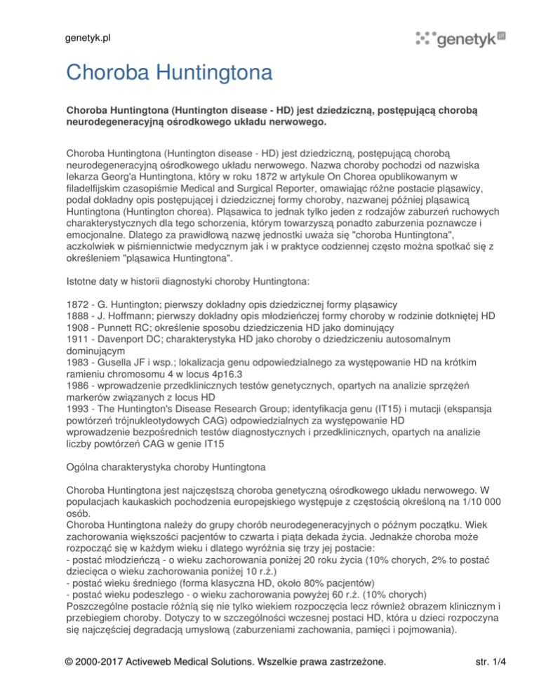 genetyk.pl Choroba Huntingtona Choroba Huntingtona (Huntington disease - HD) jest dziedziczną, postępującą chorobą neurodegeneracyjną ośrodkowego układu nerwowego. Choroba Huntingtona (Huntington disease - HD) jest dziedziczną, postępującą chorobą neurodegeneracyjną ośrodkowego układu nerwowego. Nazwa choroby pochodzi od nazwiska lekarza Georg'a Huntingtona, który w roku 1872 w artykule On Chorea opublikowanym w filadelfijskim czasopiśmie Medical and Surgical Reporter, omawiając różne postacie pląsawicy, podał dokładny opis postępującej i dziedzicznej formy choroby, nazwanej później pląsawicą Huntingtona (Huntington chorea). Pląsawica to jednak tylko jeden z rodzajów zaburzeń ruchowych charakterystycznych dla tego schorzenia, którym towarzyszą ponadto zaburzenia poznawcze i emocjonalne. Dlatego za prawidłową nazwę jednostki uważa się "choroba Huntingtona", aczkolwiek w piśmiennictwie medycznym jak i w praktyce codziennej często można spotkać się z określeniem "pląsawica Huntingtona". Istotne daty w historii diagnostyki choroby Huntingtona: 1872 - G. Huntington; pierwszy dokładny opis dziedzicznej formy pląsawicy 1888 - J. Hoffmann; pierwszy dokładny opis młodzieńczej formy choroby w rodzinie dotkniętej HD 1908 - Punnett RC; określenie sposobu dziedziczenia HD jako dominujący 1911 - Davenport DC; charakterystyka HD jako choroby o dziedziczeniu autosomalnym dominującym 1983 - Gusella JF i wsp.; lokalizacja genu odpowiedzialnego za występowanie HD na krótkim ramieniu chromosomu 4 w locus 4p16.3 1986 - wprowadzenie przedklinicznych testów genetycznych, opartych na analizie sprzężeń markerów związanych z locus HD 1993 - The Huntington's Disease Research Group; identyfikacja genu (IT15) i mutacji (ekspansja powtórzeń trójnukleotydowych CAG) odpowiedzialnych za występowanie HD wprowadzenie bezpośrednich testów diagnostycznych i przedklinicznych, opartych na analizie liczby powtórzeń CAG w genie IT15 Ogólna charakterystyka choroby Huntingtona Choroba Huntingtona jest najczęstszą choroba genetyczną ośrodkowego układu nerwowego. W populacjach kaukaskich pochodzenia europejskiego występuje z częstością określoną na 1/10 000 osób. Choroba Huntingtona należy do grupy chorób neurodegeneracyjnych o późnym początku. Wiek zachorowania większości pacjentów to czwarta i piąta dekada życia. Jednakże choroba może rozpocząć się w każdym wieku i dlatego wyróżnia się trzy jej postacie: - postać młodzieńczą - o wieku zachorowania poniżej 20 roku życia (10% chorych, 2% to postać dziecięca o wieku zachorowania poniżej 10 r.ż.) - postać wieku średniego (forma klasyczna HD, około 80% pacjentów) - postać wieku podeszłego - o wieku zachorowania powyżej 60 r.ż. (10% chorych) Poszczególne postacie różnią się nie tylko wiekiem rozpoczęcia lecz również obrazem klinicznym i przebiegiem choroby. Dotyczy to w szczególności wczesnej postaci HD, która u dzieci rozpoczyna się najczęściej degradacją umysłową (zaburzeniami zachowania, pamięci i pojmowania). © 2000-2017 Activeweb Medical Solutions. Wszelkie prawa zastrzeżone. str. 1/4 genetyk.pl Zaburzenia ruchowe u tych chorych pojawiają się zazwyczaj z kilkuletnim opóźnieniem i jest to głównie sztywność pozapiramidowa z ogólnym spowolnieniem ruchowym (pląsawica występuje u niemal wszystkich chorych z tej grupy, lecz ma postać łagodną i szybko zastępowana jest sztywnością mięśni). U młodych pacjentów często występują także napady padaczkowe (30-50% chorych), trudne do kontrolowania dostępnymi lekami. Ta grupa chorych charakteryzuje się ostrzejszym przebiegiem choroby a zgon pacjentów następuje średnio w przeciągu 10 lat od momentu wystąpienia pierwszych objawów. Klasyczna postać HD charakteryzuje się klinicznie postępującym upośledzeniem funkcji poznawczych, zaburzeniami ruchowymi i objawami neuropsychiatrycznymi. Badania przeprowadzone dla grupy ponad 1200 chorych i członków ich rodzin wykazały, że pierwszym objawem najczęściej są ruchy mimowolne, po których dopiero występują objawy emocjonalne a w następnej kolejności nieprawidłowości behawioralne. Znane są jednak przypadki gdy choroba rozpoczyna się zmianami osobowości, które występują znacznie wcześniej niż objawy neurologiczne. Zaburzenia ruchowe w HD dotyczą zarówno ruchów mimowolnych jaki i dowolnych. Pląsawica czyli ruchy mimowolne, początkowo ograniczone są do grup mięsni, później prowadzą do stałego niepokoju ruchowego z zaburzeniami chodu. Problemy z ruchami dowolnymi wyrażają się w postaci bradykinezji, co prowadzi między innymi do zaburzeń mowy (mowa bełkotliwa, zamazana). W późniejszych stadiach choroby dochodzi do problemów z przełykaniem, co jest przyczyną znacznej utraty wagi. Objawy psychiatryczne i zaburzenia funkcji poznawczych wydają się być w przebiegu HD niezależne od siebie. Otępienie tak charakterystyczne dla HD polega na pogorszeniu pamięci, spowolnieniu procesów myślowych, osłabieniu zdolności przetwarzania nabytych wiadomości i, co uważane jest za główny objaw upośledzenia czynności poznawczych, zaburzeniu funkcji wykonawczych. Wśród objawów psychiatrycznych dominuje depresja (ok. 40% chorych). Inne dobrze udokumentowane objawy behawioralne obejmują apatię, lęk, drażliwość, przymus wykonywania niektórych czynności, manię. Bardzo często u pacjentów występuje mechanizm obronny wypierania choroby, pomimo jej widocznych objawów. Za większość objawów klinicznych choroby odpowiada wybiórczy zanik neuronów, głównie w prążkowiu i innych strukturach zwojów podstawy [Ryc. nr 1] prowadząc do zaburzenia funkcjonowania pętli podstawno-wzgórzowo-korowych związanych zarówno z funkcjami ruchowymi jak i procesami myślowymi. Choroba Huntingtona jest chorobą postępującą prowadzącą do inwalidyzacji chorego a następnie jego śmierci, w przeciągu 1