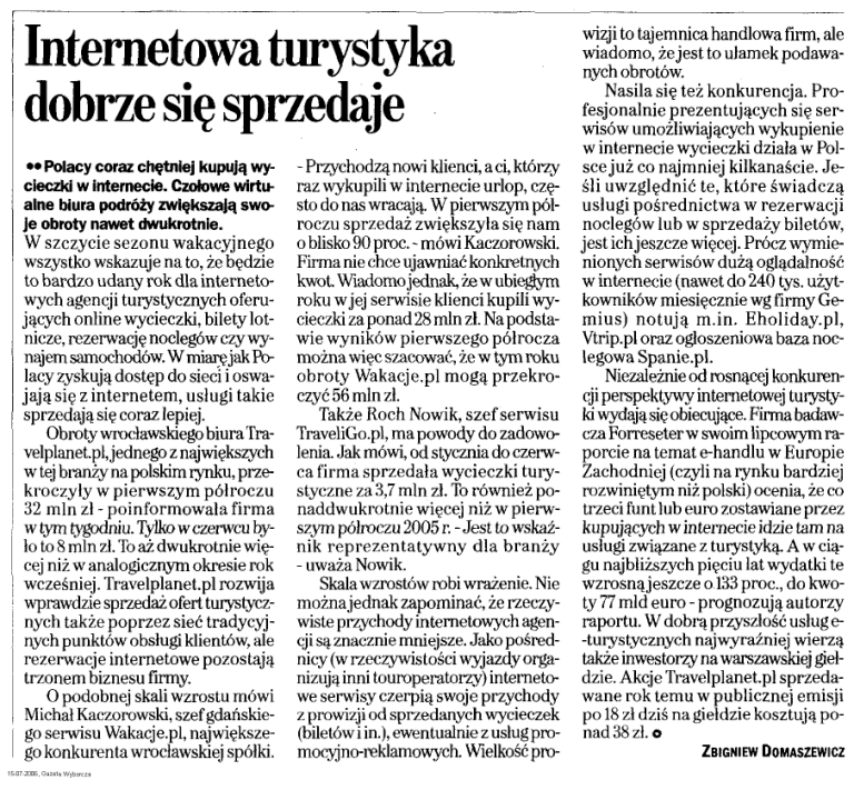 hiternetowa turystyka dobrze się sprzedaje - Przychodzą nowi klienci, a ci, którzy raz wykupili w internecie urlop, często do nas wracają. W pierwszym półroczu sprzedaż zwiększyła się nam W szczycie sezonu wakacyjnego o blisko 90 proc. - mówi Kaczorowski. wszystko wskazuje na to, że będzie Firma nie chce ujawniać konkretnych to bardzo udany rok dla interneto- kwot. Wiadomo jednak, żewubiegrym wych agencji turystycznych oferu- roku w jej serwisie klienci kupili wyjących online wycieczki, bilety lot- cieczki za ponad 28 min zł. Na podstanicze, rezerwację noclegów czy wy- wie wyników pierwszego półrocza najem samochodów. W miarę jak Po- można więc szacować, że w tym roku lacy zyskują dostęp do sieci i oswa- obroty Wakacje.pl mogą przekrojają się z internetem, usługi takie czyć 56 min zł. sprzedają się coraz lepiej. Także Roch Nowik, szef serwisu Obroty wrocławskiego biura Tra- TraveliGo.pl, ma powody do zadowovelplanet.pl, jednego z największych lenia. Jak mówi, od stycznia do czerww tej branży na polskim rynku, prze- ca firma sprzedała wycieczki turykroczyły w pierwszym półroczu styczne za 3,7 min zł. To również po32 min zł - poinformowała firma naddwukrotnie więcej niż w pierww tym tygodniu. Tylko w czerwcu by- szym półroczu 2005 r. - Jest to wskaźło to 8 min zł. To aż dwukrotnie wię- nik reprezentatywny dla branży cej niż w analogicznym okresie rok - uważa Nowik. wcześniej. Travelplanet.pl rozwija Skala wzrostów robi wrażenie. Nie wprawdzie sprzedaż ofert turystycz- można jednak zapominać, że rzeczynych także poprzez sieć tradycyj- wiste przychody internetowych agennych punktów obsługi klientów, ale cji są znacznie mniejsze. Jako pośredrezerwacje internetowe pozostają nicy (w rzeczywistości wyjazdy organizują inni touroperatorzy) internetotrzonem biznesu firmy. O podobnej skali wzrostu mówi we serwisy czerpią swoje przychody Michał Kaczorowski, szef gdańskie- z prowizji od sprzedanych wycieczek go serwisu Wakacje.pl, największe- (biletów i in.), ewentualnie z usług progo konkurenta wrocławskiej spółki. mocyjno-reklamowych. Wielkość pro** Polacy coraz chętniej kupują wycieczki w internecie. Czołowe wirtualne biura podróży zwiększają swoje obroty nawet dwukrotnie. wizji to tajemnica handlowa firm, ale wiadomo, że jest to ułamek podawanych obrotów. Nasila się też konkurencja. Profesjonalnie prezentujących się serwisów umożliwiających wykupienie w internecie wycieczki działa w Polsce już co najmniej kilkanaście. Jeśli uwzględnić te, które świadczą usługi pośrednictwa w rezerwacji noclegów lub w sprzedaży biletów, jest ich jeszcze więcej. Prócz wymienionych serwisów dużą oglądalność w internecie (nawet do 240 tyś. użytkowników miesięcznie wg firmy Gemius) notują m.in. Eholiday.pl, Vtrip.pl oraz ogłoszeniowa baza noclegowa Spanie.pl. Niezależnie od rosnącej konkurencji perspektywy internetowej turystyki wydają się obiecujące. Firma badawcza Forreseter w swoim lipcowym raporcie na temat e-handlu w Europie Zachodniej (czyli na rynku bardziej rozwiniętym niż polski) ocenia, że co trzeci funt lub euro zostawiane przez kupujących w internecie idzie tam na usługi związane z turystyką. A w ciągu najbliższych pięciu lat wydatki te wzrosnąjeszcze o 133 proc., do kwoty 77 mld euro - prognozują autorzy raportu. W dobrą przyszłość usług e-turystycznych najwyraźniej wierzą także inwestorzy na warszawskiej giełdzie. Akcje Travelplanet.pl sprzedawane rok temu w publicznej emisji po 18 zł dziś na giełdzie kosztują ponad 38 zł. o ZBIGNIEW DOMASZEWICZ