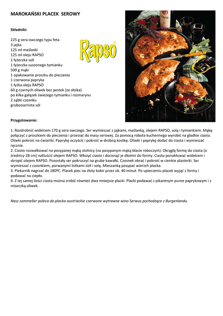 MAROKAŃSKI PLACEK SEROWY Składniki: 225 g sera owczego typu feta 3 jajka 125 ml maślanki 125 ml oleju RAPSO 1 łyżeczka soli 1 łyżeczka suszonego tymianku 500 g mąki 1 opakowanie proszku do pieczenia 1 czerwona papryka 1 łyżka oleju RAPSO 60 g czarnych oliwek bez pestek (ze słoika) po kilka gałązek świeżego tymianku i rozmarynu 2 ząbki czosnku gruboziarnista sól Przygotowanie: 1. Rozdrobnić widelcem 170 g sera owczego. Ser wymieszać z jajkami, maślanką, olejem RAPSO, solą i tymiankiem. Mąkę połączyć z proszkiem do pieczenia i przesiać do masy serowej. Za pomocą robota kuchennego wyrobić na gładkie ciasto. Oliwki pokroić na ćwiartki. Paprykę oczyścić i pokroić w drobną kostkę. Oliwki i paprykę dodać do ciasta i wymieszać ręcznie. 2. Ciasto rozwałkować na posypanej mąką stolnicy (na posypanym mąką blacie roboczym). Okrągłą formę do ciasta (o średnicy 28 cm) natłuścić olejem RAPSO. Włożyć ciasto i docisnąć je dłońmi do formy. Ciasto ponakłuwać widelcem i skropić olejem RAPSO. Pozostały ser pokruszyć na grube kawałki. Czosnek obrać i pokroić w cienkie plasterki. Ser wymieszać z czosnkiem, porwanymi listkami ziół i solą. Mieszanką posypać wierzch placka. 3. Piekarnik nagrzać do 180ºC. Placek piec na złoty kolor przez ok. 40 minut. Po upieczeniu placek wyjąć z formy i podawać na ciepło. 4. Z tej samej ilości ciasta można zrobić również dwa mniejsze placki. Placki podawać z pikantnym puree paprykowym i z miseczką oliwek. Nasz sommelier poleca do placka austriackie czerwone wytrawne wino Serwus pochodzące z Burgenlandu.