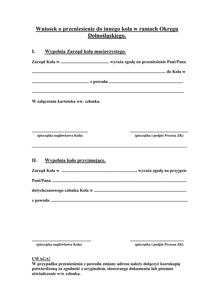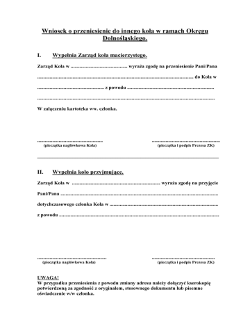 Wniosek o przeniesienie do innego koła w ramach Okręgu Dolnośląskiego. I. Wypełnia Zarząd koła macierzystego. Zarząd Koła w ............................................. wyraża zgodę na przeniesienie Pani/Pana ............................................................................................................................ do Koła w ..................................................... z powodu ..................................................................... ............................................................................................................................................. W załączeniu kartoteka ww. członka. .................................................... ...................................................... (pieczątka nagłówkowa Koła) (pieczątka i podpis Prezesa ZK) ________________________________________________________________________ II. Wypełnia koło przyjmujące. Zarząd Koła w ...................................................................... wyraża zgodę na przyjęcie Pani/Pana ............................................................................................................................. dotychczasowego członka Koła w ...................................................................................... z powodu ............................................................................................................................... ....................................................... (pieczątka nagłówkowa Koła) .................................................. (pieczątka i podpis Prezesa ZK) UWAGA! W przypadku przeniesienia z powodu zmiany adresu należy dołączyć kserokopię potwierdzoną za zgodność z oryginałem, stosownego dokumentu lub pisemne oświadczenie w/w członka.