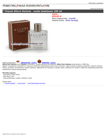 Informacje o produkcie Utworzono 03-03-2017 * Chanel Allure Homme - woda toaletowa 100 ml Cena : 459,00 zł Stan magazynowy : wysoki Średnia ocena : brak recenzji Rodzina zapachowa: ORIENTALNE - męskie, DRZEWNE - męskie Allure Pour Homme marki Chanel to orientalno - drzewne perfumy dla mężczyzn. Allure Pour Homme został wydany w 1999 roku. Zapach z prawdziwym charakterem i charyzmą. Doskonale zbalansowana górna nuta cytrusowa z ciepłą nutą serca opartą o przyprawy i zapachy drzewne. Świeży, zmysłowy, wyrafinowany i bardzo seksowny. Odpowiedni dla mężczyzn w każdym wieku. Zdobywca FiFi Award w 1999 roku (najbardziej prestiżowe wyróżnienie w branży perfumeryjnej). Piramida zapachu: - Nuta głowy: fasola Tonka - Nuta serca: cedr - Nuta podstawowa: czystek, wetiweria, skóra Zobacz także : Chanel [męskie] Linia Chanel Wygenerowano w programie www.oscGold.com Linia Chanel Allure Homme
