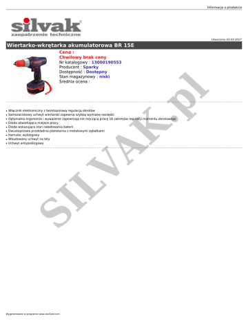 Informacje o produkcie Utworzono 03-03-2017 Wiertarko-wkrętarka akumulatorowa BR 15E Cena : Chwilowy brak ceny ● ● ● ● ● ● ● ● Włącznik elektroniczny z bezstopniową regulacją obrotów Samozaciskowy uchwyt wiertarski zapewnia szybką wymianę narzędzi Optymalna ergonomia i wyważenie zapewniają nie męczącą pracę 16 zakresów regulacji momentu obrotowego Dioda oświetlająca miejsce pracy Dioda wskazująca stan naładowania baterii Dwustopniowa przekładnia planetarna z metalowymi zębatkami Hamulec wybiegowy Wbudowany uchwyt na bity Uchwyt antypoślizgowy SI LV ● AK .p l Nr katalogowy : 13000190553 Producent : Sparky Dostępność : Dostępny Stan magazynowy : niski Średnia ocena : Wygenerowano w programie www.oscGold.com