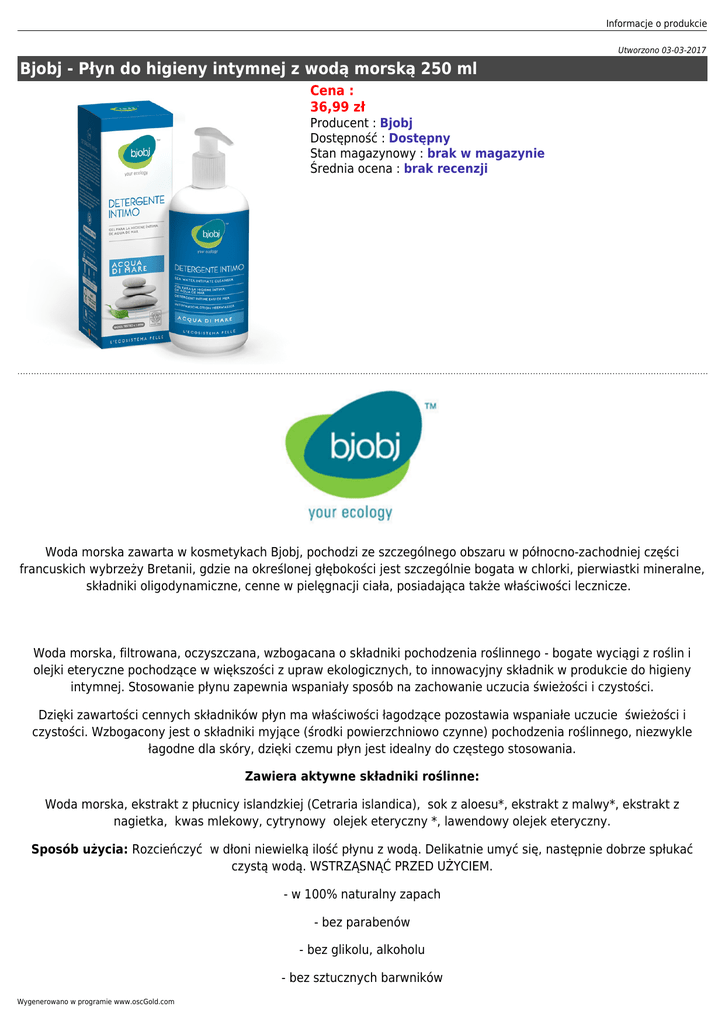 Informacje o produkcie Utworzono 03-03-2017 Bjobj - Płyn do higieny intymnej z wodą morską 250 ml Cena : 36,99 zł Producent : Bjobj Dostępność : Dostępny Stan magazynowy : brak w magazynie Średnia ocena : brak recenzji Woda morska zawarta w kosmetykach Bjobj, pochodzi ze szczególnego obszaru w północno-zachodniej części francuskich wybrzeży Bretanii, gdzie na określonej głębokości jest szczególnie bogata w chlorki, pierwiastki mineralne, składniki oligodynamiczne, cenne w pielęgnacji ciała, posiadająca także właściwości lecznicze. Woda morska, filtrowana, oczyszczana, wzbogacana o składniki pochodzenia roślinnego - bogate wyciągi z roślin i olejki eteryczne pochodzące w większości z upraw ekologicznych, to innowacyjny składnik w produkcie do higieny intymnej. Stosowanie płynu zapewnia wspaniały sposób na zachowanie uczucia świeżości i czystości. Dzięki zawartości cennych składników płyn ma właściwości łagodzące pozostawia wspaniałe uczucie świeżości i czystości. Wzbogacony jest o składniki myjące (środki powierzchniowo czynne) pochodzenia roślinnego, niezwykle łagodne dla skóry, dzięki czemu płyn jest idealny do częstego stosowania. Zawiera aktywne składniki roślinne: Woda morska, ekstrakt z płucnicy islandzkiej (Cetraria islandica), sok z aloesu*, ekstrakt z malwy*, ekstrakt z nagietka, kwas mlekowy, cytrynowy olejek eteryczny *, lawendowy olejek eteryczny. Sposób użycia: Rozcieńczyć w dłoni niewielką ilość płynu z wodą. Delikatnie umyć się, następnie dobrze spłukać czystą wodą. WSTRZĄSNĄĆ PRZED UŻYCIEM. - w 100% naturalny zapach - bez parabenów - bez glikolu, alkoholu - bez sztucznych barwników Wygenerowano w programie www.oscGold.com - bez silikonu, aluminium - bez Phenoxyethanolu - bez PEG i SLS - bez składników GMO - fizjologiczne pH - hypoalergiczny Warunki przechowywania: Płyn zawiera aktywne składniki roślinne, zalecane jest przechowywanie produktu w temperaturze między 10 a 28 ºC. Płyn należy zużyć w okresie 6 miesięcy od otwarcia. Składniki: aqua (water), maris aqua, cocamidopropyl betaine, sodium lauroyl sarcosinate, sodium olivamphoacetate, sodium lauroyl glutamate, cetraria islandica extract, *aloe barbadensis gel, *malva sylvestris extract, *calendula officinalis extract, sodium cocoyl hydrolyzed wheat protein, glycerin, lactic acid, *citrus medica limonum oil, *lavandula hybrida oil, limonene, citral, geraniol, linalool, coumarin, sodium benzoate, benzyl alcohol, potassium sorbate, ascorbic acid. * Wszystkie składniki oznaczone gwiazdką pochodzą z certyfikowanych ekologicznych upraw