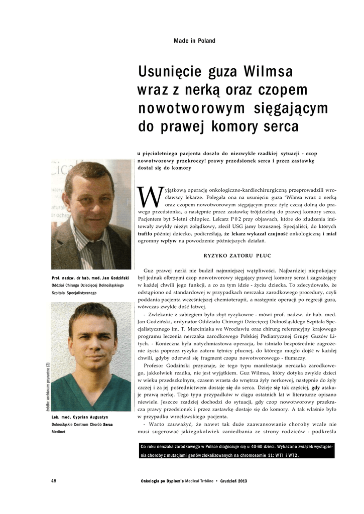 Made in Poland Usunięcie guza Wilmsa wraz z nerką oraz czopem nowotworowym sięgającym do prawej komory serca u pięcioletniego pacjenta doszło do niezwykle rzadkiej sytuacji - czop nowotworowy przekroczy! prawy przedsionek serca i przez zastawkę dostał się do komory W yjątkową operację onkologiczno-kardiochirurgiczną przeprowadzili wro cławscy lekarze. Polegała ona na usunięciu guza "Wilmsa wraz z nerką oraz czopem nowotworowym sięgającym przez żyłę czczą dolną do pra wego przedsionka, a następnie przez zastawkę trójdzielną do prawej komory serca. Pacjentem byt 5-letni chłopiec. Lelcarz P 0 2 przy objawach, które do złudzenia imi towały zwykły nieżyt żołądkowy, zlecił USG jamy brzusznej. Specjaliści, do których trafiło później dziecko, podicreśłają, że lekarz wykazał czujność onkologiczną i miał ogromny wpływ na powodzenie późniejszych działań. R Y Z Y K O ZATORU P Ł U C Prof. nadzw. dr hab. m e d . J a n Godziński Oddziai Chirurgu Dziecięcej Dolnośląskiego Szpitala Specjalistycznego Guz prawej nerki nie budził najmniejszej wątpliwości. Najbardziej niepokojący był jednak olbrzymi czop nowotworowy sięgający prawej komory serca i zagrażający w każdej chwili jego funkcji, a co za tym idzie - życiu dziecka. To zdecydowało, że odstąpiono od standardowej w przypadkach nerczaka zarodkowego procedury, czyli poddania pacjenta wcześniejszej chemioterapii, a następnie operacji po regresji guza, wówczas zwykle dość łatwej. - Zwlekanie z zabiegiem było zbyt ryzykowne - mówi prof. nadzw. dr hab. med. Jan Godziński, ordynator Oddziału Chirurgii Dziecięcej Dolnośląsłdego Szpitala Spe cjalistycznego im. T. Marciniaka we Wrocławiu oraz chirurg referencyjny krajowego programu leczenia nerczaka zarodkowego Polskiej Pediatrycznej Grupy Guzów Li tych. - Konieczna była natychmiastowa operacja, bo istniało bezpośrednie zagroże nie życia poprzez ryzyko zatoru tętnicy płucnej, do którego mogło dojść w każdej chwili, gdyby oderwał się fragment czopu nowotworowego - tłumaczy. Lek. m e d . C y p r i a n A u g u s t y n Dolnośląskie Centrum Chorób Serca Medinet Profesor Godziński przyznaje, że tego typu manifestacja nerczaka zarodkowe go, jakkolwiek rzadka, nie jest wyjątkiem. Guz Wilmsa, który dotyka zwykle dzieci w wieku przedszkolnym, czasem wrasta do wnętrza żyły nerkowej, następnie do żyły czczej i za jej pośrednictwem dostaje się do serca. Dzieje się tak częściej, gdy ataku je prawą nerkę. Tego typu przypadków w ciągu ostatnich lat w literaturze opisano niewiele. Jeszcze rzadziej dochodzi do sytuacji, gdy czop nowotworowy przekra cza prawy przedsionek i przez zastawkę dostaje się do komory. A tak właśnie było w przypadku wrocławskiego pacjenta. - Warto zauważyć, że nawet tak duże zaawansowanie choroby wcale nie musi sugerować jakiegokolwiek zaniedbania ze strony rodziców - podkreśla Co roku nerczaka zarodkowego w Polsce diagnozuje się u 40-60 dzieci. Wykazano związek wystąpie nia choroby z mutacjami genów zlokalizowanych na chromosomie 11: W T l i W T 2 . 48 Onkologia po Dyplomie Medical Trrbiine • Grudzień 2013 Made in Poland prof. Godziński. - Guz Wilmsa potrafi szybko podwo ić objętość, nawet w ciągu tygodnia, nie zawsze dając specyficzne objawy. U naszego pacjenta przez kilka dni utrzymywały się ból brzucha i podwyższona tempera tura ciała. OPRACOWANIE CZYNNOŚCI K R O K P O K R O K U Z uwagi na konieczność operacji z użyciem krążenia pozaustrojowego, odbyła się ona w Dolnośląskim Centrum Chorób Serca Medinet. Trwała 4,5 godziny. twarta klatka piersiowa i otwierany brzuch. W zabiegu uczestniczył ośmioosobowy zespół, a operowali chirurg dziecięcy i chirurg onkolog prof. nadzw. dr hab. med. Jan Godziński oraz kardiochirurg dziecięcy z Medinetu, lek. med. Cyprian Augustyn. Stając do stołu operacyjnego, lekarze mieli wprawdzie precyzyjny plan za biegu, ale musieli liczyć się z wieloma niewiadomymi. Trud no było np. przewidzieć, czy czop nowotworowy nie wrósł w ściany naczyń, co powodowałoby dodatkową trudność przy jego usunięciu. Pewne było natomiast, że nie uda się usunąć guza, oszczędzając nerkę lub choćby jej część - za sadnicze naczynia nerkowe były zajęte przez nowotwór. Konieczny był rozległy dostęp operacyjny - bo w jednym polu musiały się znaleźć: serce, żyła czcza i nerkowa oraz sama nerka. Dziecko musiało być operowane w krążeniu pozaustrojowym. Problemem był fakt, iż guz zamykał świa tło żyły czczej dolnej. W tej sytuacji możliwe było założenie kaniuli żylnej tylko do żyły czczej górnej. Niestety, wiąza ło się to ze zmniejszeniem rzutu minutowego krwi przez maszynę płuco-serce. W celu zapewnienia maksymalnej ochrony narządów (głównie mózgu), temperaturę ciała pa cjenta obniżono do 28°C. [suwanie czopu nowotworowego z przedsionka i komory. - Mieliśmy pełną świadomość, jak ryzykowna jest sama operacja - mówi lek. med. Cyprian Augustyn. - Fragment skrzepliny mógł się urwać nawet podczas najmniejszych manipulacji na sercu i dużych naczyniach. Żeby usunąć bezpiecznie czop, musieliśmy zatrzymać serce. Plan zakładał rozpoczęcie zabiegu od otwarcia klatki pier siowej i wyjęcia czopu ze skrzepliną z serca. Ten element przebiegł bez problemów. Następnym krokiem miało być usunięcie czopu z żyły czczej. Na tym etapie rozlegle, sze rokim poprzecznym cięciem, otwarto brzuch. Operatorom zależało, żeby czas zatrzymania serca był jak najkrótszy, więc wkrótce po otwarciu brzucha serce zaczęło bić. Wtedy moż na było założyć poniżej żyły nerkowej drugą kaniulę żylną, żeby uzyskać większy spływ krwi, a co za tym idzie - należny rzut minutowy. Wówczas też zaczęto wygrzewać pacjenta. - Hipotermia jest bronią obosieczną - tłumaczy Cyprian Augustyn. - Z jednej strony zwalnia metabolizm, chroniąc komórki organizmu,