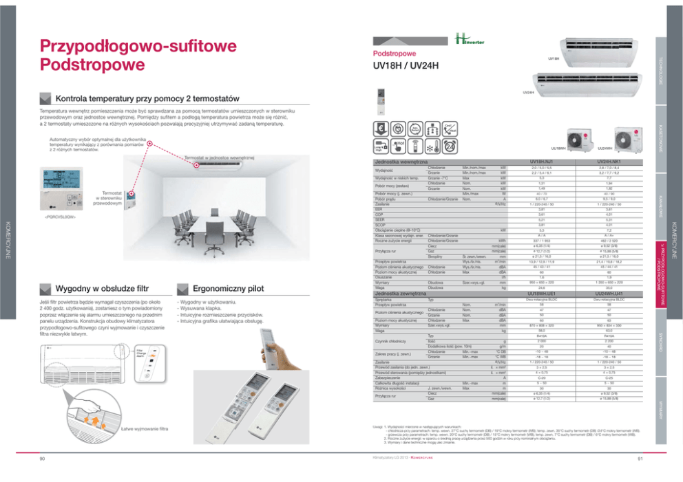 Inverter Podstropowe TECHNOLOGIE Przypodłogowo-sufitowe Podstropowe UV18H UV18H / UV24H UV24H Kontrola temperatury przy pomocy 2 termostatów Automatyczny wybór optymalnej dla użytkownika temperatury wynikający z porównania pomiarów z 2 różnych termostatów. UU18WH Termostat w jednostce wewnętrznej Jednostka wewnętrzna Wydajność Wydajność w niskich temp. Pobór mocy (zestaw) <PQRCVSL0QW> Wygodny w obsłudze filtr - Wygodny w użytkowaniu. - Wysuwana klapka. - Intuicyjne rozmieszczenie przycisków. - Intuicyjna grafika ułatwiająca obsługę. Chłodzenie Chłodzenie Obudowa Obudowa Śr. zewn./wewn. Wys./śr./nis. Wys./śr./nis. Max Szer.×wys.×gł. kWh mm(cale) mm(cale) mm m3/min dBA dBA l/h mm kg Jednostka zewnętrzna Sprężarka Przepływ powietrza Poziom ciśnienia akustycznego Poziom mocy akustycznej Wymiary Waga Czynnik chłodniczy Filter Change Alarm Chłodzenie/Grzanie Chłodzenie/Grzanie Ciecz Gaz Skropliny Zakres pracy (j. zewn.) Typ Chłodzenie Grzanie Chłodzenie Szer.×wys.×gł. Nom. Nom. Nom. Max Typ Ilość Dodatkowa ilość (pow. 10m) Chłodzenie Min.~max Grzanie Min.~max Zasilanie Przewód zasilania (do jedn. zewn.) Przewód sterowania (pomiędzy jednostkami) Zabezpieczenie Całkowita długość instalacji Różnica wysokości J. zewn./wewn. Ciecz Przyłącza rur Gaz Min.~max Max m3/min dBA dBA dBA mm kg g g/m °C DB °C WB ø/V/Hz il. × mm² il. × mm² A m m mm(cale) mm(cale) UV24H.NK1 2,0 / 5,0 / 5,5 2,8 / 7,0 / 8,4 2,2 / 5,4 / 6,1 3,2 / 7,7 / 9,2 5,3 7,7 1,31 1,94 1,49 1,92 40 / 70 40 / 90 6,0 / 6,7 9,5 / 9,0 1 / 220-240 / 50 1 / 220-240 / 50 3,81 3,61 3,61 4,01 5,21 5,31 3,81 4,01 5,3 7,2 A/A A / A+ 337 / 1 953 462 / 2 520 ø 6,35 (1/4) ø 9,52 (3/8) ø 12,7 (1/2) ø 15,88 (5/8) ø 21,5 / 16,0 ø 21,5 / 16,0 13,9 / 12,9 / 11,9 21,4 / 19,8 / 18,2 45 / 43 / 41 45 / 44 / 41 60 60 1,6 1,9 950 × 650 × 220 1 350 × 650 × 220 24,6 35,0 UU18WH.UE1 UU24WH.U41 Dwu-rotacyjna BLDC Dwu-rotacyjna BLDC 58 58 47 47 50 50 60 63 870 × 808 × 320 950 × 834 × 330 58,0 63,0 R410A R410A 2 000 2 200 20 40 -10 ~ 48 -10 ~ 48 -18 ~ 18 -18 ~ 18 1 / 220-240 / 50 1 / 220-240 / 50 3 × 2,5 3 × 2,5 4 × 0,75 4 × 0,75 C-20 C-25 5 ~ 50 5 ~ 50 30 SYNCHRO Jeśli filtr powietrza będzie wymagał czyszczenia (po około 2 400 godz. użytkowania), zostaniesz o tym powiadomiony poprzez włączenie się alarmu umieszczonego na przednim panelu urządzenia. Konstrukcja obudowy klimatyzatora przypodłogowo-sufitowego czyni wyjmowanie i czyszczenie filtra niezwykle łatwym. Ergonomiczny pilot Przepływ powietrza Poziom ciśnienia akustycznego Poziom mocy akustycznej Osuszanie Wymiary Waga kW UV18H.NJ1 ќ PRZYPODŁOGOWO-SUFITOWE / PODSTROPOWE KOMERCYJNE Przyłącza rur Chłodzenie/Grzanie kW kW kW kW kW W A ø/V/Hz 30 ø 6,35 (1/4) ø 9,52 (3/8) ø 12,7 (1/2) ø 15,88 (5/8) WYMIARY Łatwe wyjmowanie filtra 90 Uwagi: 1. Wydajności mierzone w następujących warunkach: - chłodnicza przy parametrach: temp. wewn. 27°C suchy termometr (DB) / 19°C mokry termometr (WB); temp. zewn. 35°C suchy termometr (DB) /24°C mokry termometr (WB). - grzewcza przy parametrach: temp. wewn. 20°C suchy termometr (DB) / 15°C mokry termometr (WB); temp. zewn. 7°C suchy termometr (DB) / 6°C mokry termometr (WB). 2. Roczne zużycie energii: w oparciu o średnią pracę urządzenia przez 500 godzin w roku przy nominalnym obciążeniu. 3. Wymiary i dane techniczne mogą ulec zmianie. Klimatyzatory LG 2013 · K O M E R C Y J N E 91 KOMERCYJNE Pobór mocy (j. zewn.) Pobór prądu Zasilanie EER COP SEER SCOP Obciążenie cieplne (@-10°C) Klasa sezonowej wydajn. ener. Roczne zużycie energii Min./nom./max Min./nom./max Max Nom. Nom. Min./max Nom. UU24WH KANAŁOWE Termostat w sterowniku przewodowym Chłodzenie Grzanie Grzanie -7°C Chłodzenie Grzanie KASETONOWE Temperatura wewnętrz pomieszczenia może być sprawdzana za pomocą termostatów umieszczonych w sterowniku przewodowym oraz jednostce wewnętrznej. Pomiędzy sufitem a podłogą temperatura powietrza może się różnić, a 2 termostaty umieszczone na różnych wysokościach pozwalają precyzyjniej utrzymywać zadaną temperaturę.