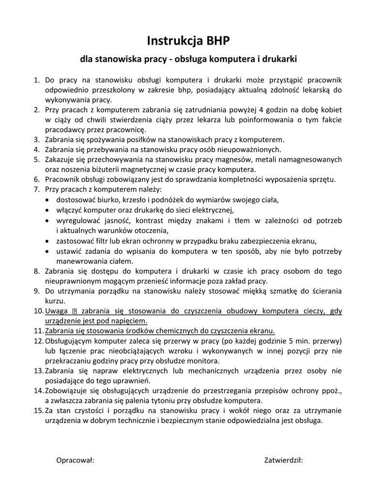Instrukcja BHP dla stanowiska pracy - obsługa komputera i drukarki 1. Do pracy na stanowisku obsługi komputera i drukarki może przystąpid pracownik odpowiednio przeszkolony w zakresie bhp, posiadający aktualną zdolnośd lekarską do wykonywania pracy. 2. Przy pracach z komputerem zabrania się zatrudniania powyżej 4 godzin na dobę kobiet w ciąży od chwili stwierdzenia ciąży przez lekarza lub poinformowania o tym fakcie pracodawcy przez pracownicę. 3. Zabrania się spożywania posiłków na stanowiskach pracy z komputerem. 4. Zabrania się przebywania na stanowisku pracy osób nieupoważnionych. 5. Zakazuje się przechowywania na stanowisku pracy magnesów, metali namagnesowanych oraz noszenia biżuterii magnetycznej w czasie pracy komputera. 6. Pracownik obsługi zobowiązany jest do sprawdzania kompletności wyposażenia sprzętu. 7. Przy pracach z komputerem należy: dostosowad biurko, krzesło i podnóżek do wymiarów swojego ciała, włączyd komputer oraz drukarkę do sieci elektrycznej, wyregulowad jasnośd, kontrast między znakami i tłem w zależności od potrzeb i aktualnych warunków otoczenia, zastosowad filtr lub ekran ochronny w przypadku braku zabezpieczenia ekranu, ustawid zadania do wpisania do komputera w ten sposób, aby nie było potrzeby manewrowania ciałem. 8. Zabrania się dostępu do komputera i drukarki w czasie ich pracy osobom do tego nieuprawnionym mogącym przenieśd informacje poza zakład pracy. 9. Do utrzymania porządku na stanowisku należy stosowad miękką szmatkę do ścierania kurzu. 10. Uwaga zabrania się stosowania do czyszczenia obudowy komputera cieczy, gdy urządzenie jest pod napięciem. 11. Zabrania się stosowania środków chemicznych do czyszczenia ekranu. 12. Obsługującym komputer zaleca się przerwy w pracy (po każdej godzinie 5 min. przerwy) lub łączenie prac nieobciążających wzroku i wykonywanych w innej pozycji przy nie przekraczaniu godziny pracy przy obsłudze monitora. 13. Zabrania się napraw elektrycznych lub mechanicznych urządzenia przez osoby nie posiadające do tego uprawnieo. 14. Zobowiązuje się obsługujących urządzenie do przestrzegania przepisów ochrony ppoż., a zwłaszcza zabrania się palenia tytoniu przy obsłudze komputera. 15. Za stan czystości i porządku na stanowisku pracy i wokół niego oraz za utrzymanie urządzenia w dobrym technicznie i bezpiecznym stanie odpowiedzialna jest obsługa. Opracował: Zatwierdził: