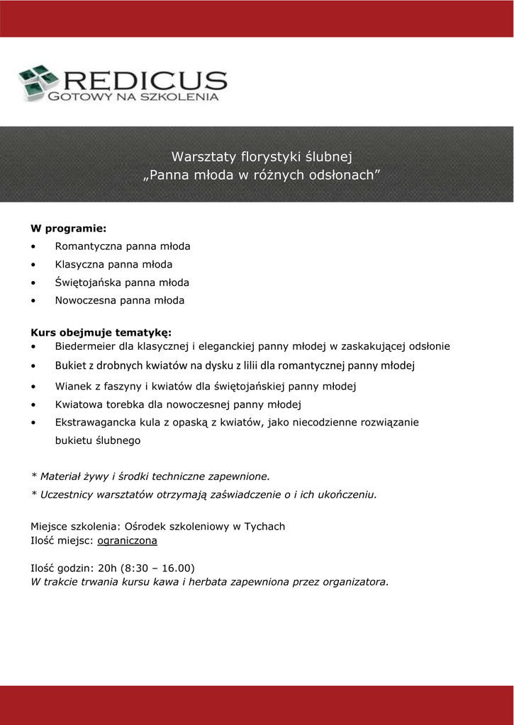 Warsztaty florystyki ślubnej KADRY I PŁACE „Panna młoda w różnych odsłonach” W programie: • Romantyczna panna młoda • Klasyczna panna młoda • Świętojańska panna młoda • Nowoczesna panna młoda Kurs obejmuje tematykę: • Biedermeier dla klasycznej i eleganckiej panny młodej w zaskakującej odsłonie • Bukiet z drobnych kwiatów na dysku z lilii dla romantycznej panny młodej • Wianek z faszyny i kwiatów dla świętojańskiej panny młodej • Kwiatowa torebka dla nowoczesnej panny młodej • Ekstrawagancka kula z opaską z kwiatów, jako niecodzienne rozwiązanie bukietu ślubnego * Materiał żywy i środki techniczne zapewnione. * Uczestnicy warsztatów otrzymają zaświadczenie o i ich ukończeniu. Miejsce szkolenia: Ośrodek szkoleniowy w Tychach Ilość miejsc: ograniczona Ilość godzin: 20h (8:30 – 16.00) W trakcie trwania kursu kawa i herbata zapewniona przez organizatora.
