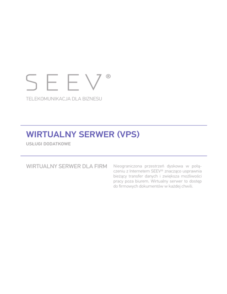 ® TELEKOMUNIKACJA DLA BIZNESU WIRTUALNY SERWER (VPS) USŁUGI DODATKOWE WIRTUALNY SERWER DLA FIRM Nieograniczona przestrzeń dyskowa w połączeniu z Internetem SEEV® znacząco usprawnia bieżący transfer danych i zwiększa możliwości pracy poza biurem. Wirtualny serwer to dostęp do firmowych dokumentów w każdej chwili. ® TELEKOMUNIKACJA DLA BIZNESU WIRTUALNY SERWER USŁUGI DODATKOWE SZCZEGÓŁY USŁUGI DEDYKOWANA PRZESTRZEŃ WIRTUALNEGO DYSKU SEEV udostępnia sprzęt dostosowany do wymagań firmy i gwarantuje pulę zasobów przypisaną tylko do niej. Firma nie dzieli jej z nikim innym. W standardowej ofercie SEEV umożliwia tworzenie serwerów do 8Gb RAM, 150Gb przestrzeni, do 4 procesorów na maszynę oraz tzw. ticki zegara. Firma posiada również wyłączny dostęp do serwera przez shell lub RDP. ELASTYCZNE WARUNKI SEEV umożliwia dostosowanie miesięcznego limitu transferu danych do potrzeb i sytuacji firmy. Dlatego Klient ma dostęp do rozwiązania limitowanego lub nielimitowanego oraz kilku form rozliczenia. Dodatkowo SEEV oferuje system Wirtualnej Maszyny z opcją zainstalowania dowolnego systemu operacyjnego i panelu administracyjnego. WYDAJNOŚĆ OPARTA NA NAJLEPSZYCH ROZWIĄZANIACH Wirtualny Serwer SEEV oparty jest na sieci światłowodowej o przepustowości 10Gbps. Firma może ustalić przepływność połączenia z serwerem na poziomie Nx10Mbps. Dla zachowania najwyższej jakości wykorzystywane są rozwiązania takich marek jak VMWare, Supermicro, Intel, Allied Telesis, HP, APC. BEZPIECZEŃSTWO VPS Praca serwera jest stale monitorowana, dzięki czemu reakcja na niespodziewane awarie jest natychmiastowa. Rozwiązaniem zwiększającym bezpieczeństwo jest także zdalny reboot serwera oraz możliwość tworzenia automatycznego backup’u danych. GWARANCJE SLA DLA VIRTUAL PRIVATE SERVER - Dostepnosc systemów bez protekcji * : 99,90% w trybie rocznym - Dostepnosc systemów w pełni redundantnych (2N) : 99,98% w trybie rocznym - Czas reakcji : 30 min - Dostęp do urządzeń : po uprzednim kontakcie - Kary umowne : 200% opłat za każdy okres awarii, po przekroczeniu gwarancji dostępności PONADTO - Statystyki transferu - Reverse DNS - PHP 5 / ASP .NET - Dodatkowe adresy IP