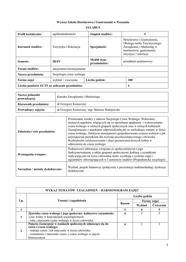 Wyższa Szkoła Hotelarstwa i Gastronomii w Poznaniu SYLABUS ogólnoakademicki Profil kształcenia: Stopień studiów: II Kierunek studiów: Turystyka i Rekreacja Specjalność: Hotelarstwo i Gastronomia, Obsługa ruchu Turystycznego, Zarządzanie i Marketing w hotelarstwie, gastronomii, turystyce i rekreacji Semestr: III/IV Moduł (typ) przedmiotów: przedmiot podstawowy Forma studiów: stacjonarne/niestacjonarne Nazwa przedmiotu: Socjologia czasu wolnego Forma zajęć wykład + ćwiczenia Liczba godzin: 100 Liczba punktów ECTS za zaliczenie przedmiotu: Nazwa jednostki prowadzącej: Katedra Zarządzania i Marketingu Kierownik przedmiotu: dr Grzegorz Konieczny Prowadzący zajęcia: dr Grzegorz Konieczny, mgr Mateusz Radojewski 4 Założenia i cele przedmiotu: Przekazanie wiedzy z zakresu Socjologii Czasu Wolnego. Wskazanie istotnych aspektów wiążących się ze sposobami spędzania i wykorzystania czasu wolnego w różnych grupach społecznych oraz w różnych kulturach. Zaznajomienie z aspektami odpowiedzialnymi za zachodzące zmiany w ilości czasu wolnego. Zdobycie umiejętności gospodarowania czasem wolnym z jak największym pożytkiem dla rozwoju psychosomatycznego człowieka. Rozbudzenie zainteresowania i chęci poznawania nowych kultur w odniesieniu do czasu wolnego. Wymagania wstępne: Podstawowe informacje związane ze społeczeństwem i jego funkcjonowaniem, a także grupami społecznymi, kulturą i czynnikami wpływającymi na życie człowieka, które wynikają z systemu zajęć i egzaminów obowiązujących w I semestrze studiów (Propedeutyka socjologii). Narzędzia / metody dydaktyczne: Wykład, projekt badawczy (połączony z prezentacja multimedialną), dyskusja dydaktyczna WYKAZ TEMATÓW I ZAGADNIEŃ – HARMONOGRAM ZAJĘĆ Liczba godzin Lp. Tematy i zagadnienia Razem 1 1 2 2 Zjawisko czasu wolnego i jego społeczno- kulturowe rozumienie: -czas wolny w koncepcjach socjologicznych - rola i znaczenie czasu wolnego w życiu człowieka Pojęcia i koncepcje w naukach społecznych odnoszące się do czasu i czasu wolnego: - rodzaje czasu i ich znaczenie w życiu człowieka - rozumienie i znaczenie czasu i czasu wolnego w ujęciu historycznym 3 4 4 Formy zajęć Wykład Ćwiczenia 4 5 2 2 2 2 1 3 4 - socjologiczne koncepcje związane z czasem i czasem wolnym Czas wolny jako element kapitału społecznego: - pojęcie i rodzaje kapitału społecznego Wpływ kapitału społecznego na funkcjonowanie w czasie wolnym Globalizacja a czas wolny: - plusy i minusy globalizacji - czynniki wpływające na czas wolny - wpływ globalizacji na uniwersalizację wzorów spędzania czasu wolnego w wybranych grupach społecznych 3 1.5 1.5 3 1.5 1.5 5 Turystyka jako forma kultury masowej: - czym jest kultura masowa - wpływ kultury masowej na turystykę i czas wolny 3 1.5 1.5 6 Turystyka jako dialog kultur: - co to jest dialog kultur - jak wpływa na czas wolny na świecie - turystyka w różnorodnych wymiarach kulturowych Społeczno – kulturowa rola mediów w kreowaniu czasu wolnego młodego pokolenia: - czym są media - jak media wpływają na młode pokolenie - wpływ mediów na zachowania w czasie wolnym u młodych ludzi Turystyka jako technika oddziaływań wychowawczych: - turystyka weekendowa jako forma aktywizacji ruchowej dzieci i młodzieży Czas wolny we współczesnej rodzinie: - modele rodziny a czas wolny - zmiany w czasie wolnym w rodzinie na przestrzeni lat Czas wolny w kulturze islamu, buddyjskiej, chrześcijańskiej 3 1.5 1.5 3 1.5 1.5 4 2 2 4 2 2 6 3 3 Możliwości zagospodarowania czasu wolnego dzieci i młodzieży ze środowisk wiejskich oraz miejskich: - społeczeństwa wiejskie - społeczeństwa miejskie - porównanie Rola instytucji i organizacji społecznych w zagospodarowaniu czasu wolnego: - dzieci i młodzieży - osób starszych Rola stowarzyszeń i organizacji społecznych w zagospodarowaniu czasu wolnego w wybranej grupie społecznej 4 2 2 3 1.5 1.5 3 1.5 1.5 14 Wpływ dążeń niepodległościowych na rozwój turystyki międzynarodowej 3 1.5 1.5 15 Znane i nowe problemy czasu wolnego 3 1.5 1.5 16 Zainteresowania hobbystyczne młodzieży 3 1.5 1.5 17 Budżet czasu wolnego: - tworzenie i dostosowywanie budżetu czasu wolnego do wybranych grup społecznych 4 2 2 60/30 30/15 30/15 7 8 9 10 11 12 13 Razem 2 Symbol efektów kształcenia 1 2 3 Opis zamierzonych efektów kształcenia Po zaliczeniu zajęć student: Odniesienie do efektów kształcenia dla kierunku W zakresie wiedzy Posiada rozszerzoną wiedzę w zakresie terminologii związanej z kierunkiem turystyki i rekreacji Potrafi analizować i ocenić zjawiska społeczne zachodzące w sferze czasu wolnego, podczas obsługi ruchu turystycznego oraz w obszarach gastronomii W zakresie umiejętności Potrafi określić i dokonać oceny zjawisk społecznych oraz wykazuje otwartość na multikulturowość K_W01 K_W06 K_U04 4 Potrafi sformułować plan działań odpowiadający potrzebom konsumenta, klienta i gościa K_U07 5 Posiada umiejętności kierowania i realizowania zajęć rekreacyjnych, sportowych i zdrowotnych w pracy z różnymi grupami społecznymi K_U14 6 Forma zajęć: - Wykłady: W zakresie kompetencji personalnych i społecznych Jest aktywny w uczestnictwie w pracach grupy przyjmując różne role Zamierzone efekty kształcenia - Definiowanie i analizowanie podstawowych pojęć związanych z socjologią czasu wolnego - Ukazywanie podstawowych zachowań ludzi w czasie wolnym oraz czynników na nie wpływających - Prezentowanie swoich obserwacji na temat czasu wolnego przed grupą - Analizowanie czasu wolnego w różnych grupach społecznych oraz w różnych kulturach - Budowanie budżetu czasu wolnego dostosowanego do wybranej grupy społecznej - Współpracowanie w grupach oraz prezentowanie efektów swojej pracy na forum całej grupy K_K03 Metody / formy oceny - Egzamin pisemny, ocenianie ciągłe 3 - Ćwiczenia: - Projekt i ćwiczenia praktyczne, ocenianie ciągłe - j.w. Sposób sprawdzenia osiągni