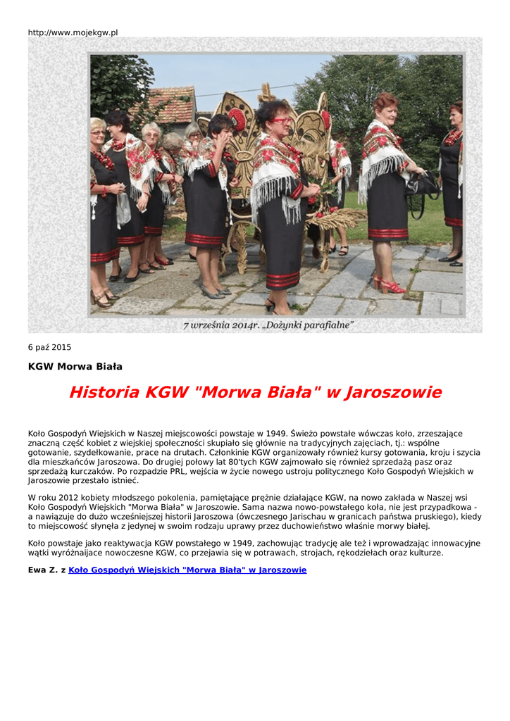 http://www.mojekgw.pl 6 paź 2015 KGW Morwa Biała Historia KGW "Morwa Biała" w Jaroszowie Koło Gospodyń Wiejskich w Naszej miejscowości powstaje w 1949. Świeżo powstałe wówczas koło, zrzeszające znaczną część kobiet z wiejskiej społeczności skupiało się głównie na tradycyjnych zajęciach, tj.: wspólne gotowanie, szydełkowanie, prace na drutach. Członkinie KGW organizowały również kursy gotowania, kroju i szycia dla mieszkańców Jaroszowa. Do drugiej połowy lat 80'tych KGW zajmowało się również sprzedażą pasz oraz sprzedażą kurczaków. Po rozpadzie PRL, wejścia w życie nowego ustroju politycznego Koło Gospodyń Wiejskich w Jaroszowie przestało istnieć. W roku 2012 kobiety młodszego pokolenia, pamiętające prężnie działające KGW, na nowo zakłada w Naszej wsi Koło Gospodyń Wiejskich "Morwa Biała" w Jaroszowie. Sama nazwa nowo-powstałego koła, nie jest przypadkowa a nawiązuje do dużo wcześniejszej historii Jaroszowa (ówczesnego Jarischau w granicach państwa pruskiego), kiedy to miejscowość słynęła z jedynej w swoim rodzaju uprawy przez duchowieństwo właśnie morwy białej. Koło powstaje jako reaktywacja KGW powstałego w 1949, zachowując tradycję ale też i wprowadzając innowacyjne wątki wyróżnaijace nowoczesne KGW, co przejawia się w potrawach, strojach, rękodziełach oraz kulturze. Ewa Z. z Koło Gospodyń Wiejskich "Morwa Biała" w Jaroszowie