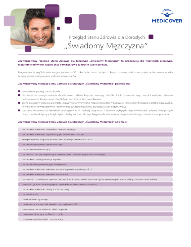 Przegląd Stanu Zdrowia dla Dorosłych „Świadomy Mężczyzna” Zaawansowany Przegląd Stanu Zdrowia dla Mężczyzn „Świadomy Mężczyzna” to propozycja dla wszystkich mężczyzn, niezależnie od wieku, którzy chcą kompleksowo zadbać o swoje zdrowie. Program ten szczególnie polecany jest panom po 35. roku życia, zwłaszcza tym, u których istnieje zwiększone ryzyko zachorowania na raka ze względu na występowanie rodzinne nowotworów. Zaawansowany Przegląd Stanu Zdrowia dla Mężczyzn „Świadomy Mężczyzna” pozwala na: kompleksową ocenę stanu zdrowia możliwość wczesnego wykrycia chorób serca i układu krążenia, cukrzycy, chorób układu krwiotwórczego, nerek i wątroby, zaburzeń funkcjonowania tarczycy oraz chorób tego narządu, w tym nowotworów ocenę prostaty w kierunku przerostu i nowotworu, wykrywanie nieprawidłowości w budowie i funkcji jamy brzusznej i układu moczowego, w tym zmian nowotworowych i torbieli oraz zakażeń organizmu przebiegających bezobjawowo uzyskanie rekomendacji lekarskich dotyczących m.in.: dalszej diagnostyki i leczenia wykrytych nieprawidłowości, zaleceń dietetycznych i innych zmian dotyczących stylu życia, niezbędnych w celu zapobiegania chorobom oraz utrzymania dobrego zdrowia i samopoczucia Zaawansowany Przegląd Stanu Zdrowia dla Mężczyzn „Świadomy Mężczyzna” obejmuje: badania krwi w kierunku chorób krwi i stanów zapalnych badania krwi w kierunku czynników ryzyka chorób serca i naczyń EKG spoczynkowe diagnozujące zaburzenia rytmu i przewodnictwa serca badanie laboratoryjne w kierunku cukrzycy badania hormonalne tarczycy badanie USG tarczycy diagnozujące zapalenie, wole i nowotwory gruczołu tarczowego badania krwi oceniające funkcje wątroby badania laboratoryjne oceniające funkcje nerek badanie krwi w kierunku zakażenia wirusami zapalenia wątroby typu B i C badanie krwi w kierunku zakażenia wirusem HIV badanie USG pozwalające rozpoznać nieprawidłowości w budowie i funkcji narządów wewnętrznych, w tym zmiany nowotworowe i torbiele ocenę USG gruczołu krokowego przez powłoki brzuszne w kierunku przerostu badania krwi w kierunku raka gruczołu krokowego badanie lekarskie pomiar ciśnienia tętniczego pomiar wzrostu, masy ciała, obwodu pasa, wyliczenie BMI ocenę ryzyka cukrzycy i chorób układu krążenia poradnictwo dotyczące profilaktyki chorób omówienie wyników badań i rekomendacje