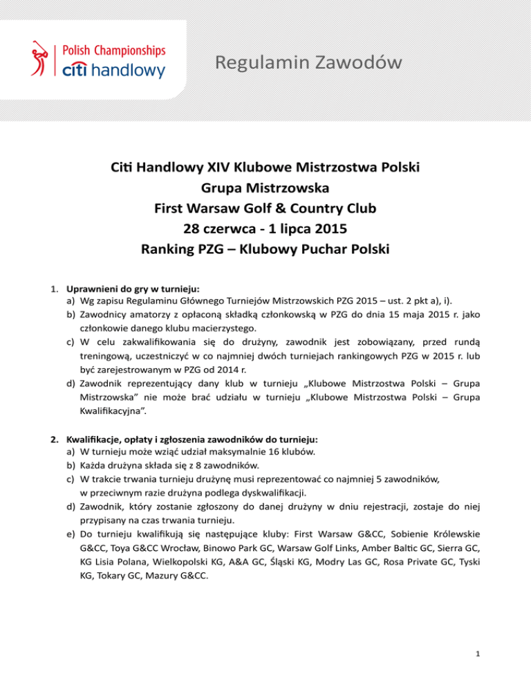 Regulamin Zawodów Ci# Handlowy XIV Klubowe Mistrzostwa Polski Grupa Mistrzowska First Warsaw Golf & Country Club 28 czerwca -‐ 1 lipca 2015 Ranking PZG – Klubowy Puchar Polski 1. Uprawnieni do gry w turnieju: a) Wg zapisu Regulaminu Głównego Turniejów Mistrzowskich PZG 2015 – ust. 2 pkt a), i). b) Zawodnicy amatorzy z opłaconą składką członkowską w PZG do dnia 15 maja 2015 r. jako członkowie danego klubu macierzystego. c) W celu zakwalifikowania się do drużyny, zawodnik jest zobowiązany, przed rundą treningową, uczestniczyć w co najmniej dwóch turniejach rankingowych PZG w 2015 r. lub być zarejestrowanym w PZG od 2014 r. d) Zawodnik reprezentujący dany klub w turnieju „Klubowe Mistrzostwa Polski – Grupa Mistrzowska” nie może brać udziału w turnieju „Klubowe Mistrzostwa Polski – Grupa Kwalifikacyjna”. 2. Kwalifikacje, opłaty i zgłoszenia zawodników do turnieju: a) W turnieju może wziąć udział maksymalnie 16 klubów. b) Każda drużyna składa się z 8 zawodników. c) W trakcie trwania turnieju drużynę musi reprezentować co najmniej 5 zawodników, w przeciwnym razie drużyna podlega dyskwalifikacji. d) Zawodnik, który zostanie zgłoszony do danej drużyny w dniu rejestracji, zostaje do niej przypisany na czas trwania turnieju. e) Do turnieju kwalifikują się następujące kluby: First Warsaw G&CC, Sobienie Królewskie G&CC, Toya G&CC Wrocław, Binowo Park GC, Warsaw Golf Links, Amber Bal^c GC, Sierra GC, KG Lisia Polana, Wielkopolski KG, A&A GC, Śląski KG, Modry Las GC, Rosa Private GC, Tyski KG, Tokary GC, Mazury G&CC. 1 Regulamin Zawodów f) W przypadku niezgłoszenia się do turnieju wszystkich drużyn wymienionych w – ust. 2 pkt e) niniejszego regulaminu, lista klubów zostanie skompletowana uwzględniając kluby z listy rezerwowej, wg kolejności zajętych miejsc w Klubowych Mistrzostwach Polski – Grupa Kwalifikacyjna 2014, od miejsca 4-‐ego w górę z tym zastrzeżeniem, że nie mogą być to kluby, mające już swoją reprezentację w Grupie Mistrzowskiej. g) Zgłoszenia przyjmowane są na stronie www.polishchampionships.pl do 11 czerwca 2015 r. h) Potwierdzeniem udziału klubów w zw. z – ust. 2 pkt e) jest wniesienie opłaty wpisowej na rachunek Polskiego Związku Golfa oraz zgłoszenie składu drużyn na adres [email protected] do 11 czerwca 2015 r. Kapitan drużyny ma prawo do zmiany 2 osób ze zgłoszonego składu drużyny, do godz. 15:00 dnia treningowego. i) Opłata wpisowa za drużynę wynosi 3360 zł. j) Rachunek wpłat: Nazwa rachunku: Polskie Związek Golfa Bank: Al. Jerozolimskie 65/79 00-‐697 Warszawa PKO S.A. IBAN -‐ PL31 1240 1066 1111 0010 3000 0684 Nr rachunku: SWIFT -‐ PKOPPLPW Opis wpłaty: „Nazwa Klubu” – opłata wpisowa za Klubowe Mistrzostwa Polski Grupa Mistrzowska k) Lista zakwalifikowanych klubów ogłoszona będzie na stronie www.polishchampionships.pl na 3 dni przed datą rozpoczęcia turnieju. 3. Kapitan drużyny: a) Funkcję tą może pełnić wyłącznie członek danego klubu lub członek PGA Polska. b) Każdego dnia wyznacza skład 7-‐osobowej drużyny. c) Decyduje o kolejności startu poszczególnych zawodników w grze pojedynczej oraz o składach drużyn w grze podwójnej II, III i IV dnia turnieju. Kapitan drużyny zobowiązany jest przekazać do Biura Zawodów, nie dłużej niż 30 min od ogłoszenia wyników, zaklejonej koperty zawierającej kolejność startów zawodników w meczach pojedynczych i skład drużyn podwójnych w następnym dniu turniejowym. d) Wyznacza osoby, które będą reprezentować drużynę w przypadku rozgrywania dogrywki. 2 Regulamin Zawodów 4. Format turnieju; tees, klasyfikacje: a) Turniej 4-‐dniowy: • Kolejność listy startowej na dzień 1 jest tworzona według zajętych miejsc w roku 2014. Znajdować się na niej będzie nazwa klubu a Kapitan drużyny do godz. 15:00 27 czerwca 2015 r. musi zdecydować o kolejności startów zawodników. • dzień 1 – stroke play brulo. Każda drużyna może wystawić do gry maksymalnie 7 zawodników. Do łącznego wyniku drużyny zalicza się sumę 5-‐ciu najlepszych wyników indywidualnych stroke play brulo. Na podstawie łącznego wyniku, drużyny zostaną podzielone na 2 grupy po 8 drużyn wg kolejności zajętych miejsc. W przypadku remisów o wyższym miejscu drużyny decyduje procedura opisana w Regulaminie Głównym Turniejów Mistrzowskich PZG 2015 – ust. 13 pkt d). W poszczególnych grupach drużyny grają o miejsca od 1 do 8; od 9 do 16. • dzień 2 – match play brulo w grupach według schematu znajdującego się w załączniku nr 1. Każdy mecz składa się z jednego pojedynku foursome match play, jednego pojedynku fourball match play, oraz z trzech pojedynków indywidualnych single match play. W razie braku rozstrzygnięcia pojedynku po rozegraniu 18 dołków zostaje wpisany wynik 0,5 punktu dla każdej z drużyn. W przypadku uzyskania przez drużyny jednakowej liczby punktów zostanie rozegrana dogrywka. Kapitanowie drużyn wyznaczają 2 osoby, które będą reprezentować drużynę w formacie foursome match play, w systemie „nagłej śmierci” na dołkach wyznaczonych przez Komitet Turnieju. Jeżeli wynik meczu jest już przesądzony, pozostali gracze z tych drużyn muszą przerwać grę i niezwłocznie opuścić pole. Uwaga: Nie będzie możliwe rozgrywanie meczów pojedynczych i podwójnych przez tych samych zawodników. • dzień 3 – match play brulo w grupach według schematu znajdującego się w załączniku nr 1. Wszystkie pojedynki rozgrywane są w takim samym formacie jak w dniu 2. • dzień 4 – match play brulo w grupach według schematu znajdującego się w załączniku nr 1. Wszystkie pojedynki rozgrywane są w takim samym formacie jak w dniu 2. b) Wynik każdego zakończonego meczu musi być przekazany do Biura Zawodów przez zwycięzcę niezwłocznie po jego zakończeniu pod rygorem kary dyskwalifikacji. 3 Regulamin Zawodów c) Poddawanie meczu -‐ drużyna p