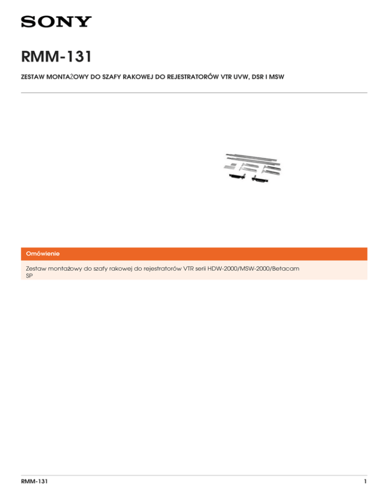 RMM-131 ZESTAW MONTAŻOWY DO SZAFY RAKOWEJ DO REJESTRATORÓW VTR UVW, DSR I MSW Omówienie Zestaw montażowy do szafy rakowej do rejestratorów VTR serii HDW-2000/MSW-2000/Betacam SP RMM-131 1 Zgodne produkty Rejestratory VTR 1/2 cala HDW-M2000P Digital recorder and player DVW-2000P Rejestrator studyjny Digital Betacam obsługujący taśmy ½-calowe HDW-M2100P HDCAM player with CineAlta 24P record feature and multi-format playback DVW-M2000P Rejestrator studyjny Digital Betacam obsługujący taśmy ½-calowe i odtwarzający materiały Betacam, Betacam SP, Betacam SX i MPEG IMX MSW-A2000P/1 Rejestrator cyfrowy MPEG IMX™ z kompresją danych MPEG-2 z szybkością 50 Mb/s, obsługą taśm ½calowych i gniazdem karty pamięci Memory Stick HDW-1800 Rejestrator HDCAM z funkcją nagrywania CineAlta 24P i opcjonalnym konwerterem 720/50P MSW-M2000P/1 Cyfrowy rejestrator MPEG IMX™ z kompresją danych MPEG-2 50 Mb/s, systemem przesuwu taśm ½” i gniazdem kart pamięci Memory Stick HDW-2000 HDCAM recorder/player MSW-M2100P/1 Cyfrowy odtwarzacz multimedialny MPEG IMX™z kompresją danych MPEG-2 50 Mb/s, systemem przesuwu taśm ½” i gniazdem kart pamięci Memory Stick HDW-D1800 Rejestrator HDCAM z funkcją zapisu CineAlta 24P i moż liwością odtwarzania kaset MPEG IMX i Digital Betacam HDW-D2000 HDCAM recorder/player with Digital Betacam and MPEG IMX playback Serwery AV PWS-4500 Wieloportowy rejestrator audiowizualny 4K/HD do sieci IP © 2016 Sony Corporation. Wszystkie prawa zastrzeżone. Zabrania się reprodukcji całości lub fragmentów niniejszej publikacji bez pisemnego zezwolenia. Cechy i dane techniczne mogą ulec zmianie. Waga i wymiary są podane w przybliżeniu. Wszystkie znaki towarowe stanowią własność odpowiednich właścicieli. RMM-131 2