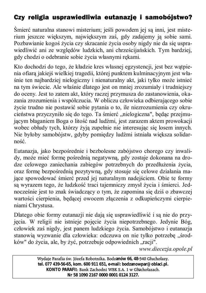 Czy religia usprawiedliwia eutanazję i samobójstwo? Śmierć naturalna stanowi misterium; jeśli powodem jej są inni, jest misterium jeszcze większym, największym zaś, gdy zadajemy ją sobie sami. Pozbawianie kogoś życia czy skracanie życia osoby nigdy nie da się usprawiedliwić ani ze względów ludzkich, ani chrześcijańskich. Tym bardziej, gdy chodzi o odebranie sobie życia własnymi rękami. Kto dochodzi do tego, że kładzie kres własnej egzystencji, jest bez wątpienia ofiarą jakiejś wielkiej tragedii, której punktem kulminacyjnym jest właśnie ten najbardziej nielogiczny i nienaturalny akt, jaki tylko może istnieć na tym świecie. Ale właśnie dlatego jest on mniej zrozumiały i trudniejszy do oceny. Jest to zatem akt, który raczej przymusza do zastanowienia, okazania zrozumienia i współczucia. W obliczu człowieka odbierającego sobie życie trudno nie postawić sobie pytania o to, ile niezrozumienia czy okrucieństwa przyczyniło się do tego. Ta śmierć „nielogiczna", będąc przejmującym błaganiem Boga o litość nad ludźmi, jest zarazem aktem prowokacji wobec obłudy tych, którzy żyją zupełnie nie interesując się losem innych. Nie byłoby samobójstw, gdyby pomiędzy ludźmi istniała większa solidarność. Eutanazja, jako bezpośrednie i bezbolesne zabójstwo chorego czy inwalidy, może mieć formę pośrednią negatywną, gdy zostaje dokonana na drodze celowego zaniechania zabiegów potrzebnych do przedłużenia życia, oraz formę bezpośrednią pozytywną, gdy stosuje się celowe działania mające spowodować śmierć przed jej naturalnym nadejściem. Obie te formy są wyrazem tego, że ludzkość traci tajemniczy zmysł życia i śmierci. Jednocześnie jest to znak świadczący o tym, że zapomina się dziś o zbawczej wartości cierpienia, będącej owocem złączenia z odkupieńczymi cierpieniami Chrystusa. Dlatego obie formy eutanazji nie dają się usprawiedliwić i są nie do przyjęcia. W religii nie istnieje pojęcie życia niepotrzebnego. Jedynie Bóg, człowiek zaś nigdy, jest panem ludzkiego życia. Samobójstwo i eutanazja stanowią wyzwanie dla człowieka: odczuwa on nie tylko potrzebę „środków" do życia, ale, by żyć, potrzebuje odpowiednich „racji". www.diecezja.opole.pl Wydaje Parafia św. Józefa Robotnika, Bodzanów 66, 48-340 Głuchołazy, tel. 077 439-56-65, kom. 600 911 651, e-mail: [email protected]. KONTO PARAFII: Bank Zachodni WBK S.A. 1 w Głuchołazach. Nr 58 1090 2167 0000 0001 0124 3127. U JÓZEFA TYGODNIK PARAFIALNY Parafia św. Józefa Robotnika w Bodzanowie Duszpasterstwo Misjonarzy Oblatów Maryi Niepokalanej www.parafia.bodzanow.oblaci.pl I NIEDZIELA WIELKIEGO POSTU: 01.03.2009 Nr 8 (286) ISSN 1731-5565 KANCELARIA PARAFIALNA czynna we wtorki, g. 15.00 – 17.00, soboty g. 11.00 – 13.00. BIBLIOTEKA CARITAS czynna we wtorki g. 15.00 – 17.00. SŁOWO NA NIEDZIELĘ Wartość silnej woli Na skałę pada u tych, którzy, gdy usłyszą, z radością przyjmują słowo, lecz nie mają korzenia: wierzą do czasu, a w chwili pokusy odstępują. (Łk 8,13) Brak silnej woli. Niektórzy przyjmują łaskę wiary i nawet się z nią liczą tak długo, jak długo się nią cieszą. Kiedy trzeba za nią zapłacić, dokonać wyboru między nią, a innymi wartościami, porzucają łaskę i sięgają po to, co łatwe, lub to, co sprawia im więcej przyjemności. Tu Jezus odsłania wartość silnej woli. W Jego szkole jej doskonalenie jest sprawą ważną. Ziarno zaczęło kiełkować, nawet wyrosło, ale nie miało szans, aby wydać owoce. Odpowiedzialność człowieka za nieustanne doskonalenie silnej woli spoczywa na nim do końca życia. Można mieć lat osiemdziesiąt i jeszcze należy świadomie doskonalić siłę swej woli, czyli czynić to, co człowiek chce, a nie to, co mu się zechce. To jest odpowiedzialność za głębię wiary. Bóg nie ocenia drzewa po pięknej koronie, ale po mocy i zdrowiu korzenia. Ono zawsze ma możliwość odrodzenia, jeśli korzeń jest zdrowy i głęboko zapuszczony w ziemię. Siła woli decyduje o wytrwałości i wierności. Nieoceniony wymiar wychowania współczesnego pokolenia! Stąd tak wielu ludzi traci wiarę. Stąd wielu ludziom naszego pokolenia brak silnej woli. Mimo że pielęgnowali łaskę wiary przez kilka, a nawet kilkanaście lat, w obliczu życiowych trudności nie dostrzegają w niej siły do pokonania i porzucają wiarę. ks. Edward Staniek Wróćmy do Ewangelii KATECHIZM W PYTANIACH I ODPOWIEDZIACH Co to znaczy, że Bóg jest wszechmocny? To oznacza, że „dla Boga nie ma nic niemożliwego” (Łk 1,37). Czy jedynie Bóg wszechmogący jest Stwórcą? Jest nim wraz z Synem i Duchem Świętym. Jakkolwiek dzieło stworzenia jest w sposób szczególny przypisywane Ojcu, jednak prawdą wiary jest również, iż Ojciec, Syn i Duch Święty są jedyną i niepodzielną zasadą stworzenia. Co dokładnie oznacza „stworzyć”? „Stworzyć” oznacza ukształtować i dać byt temu co go wcale nie miało, to znaczy wezwać do istnienia wychodząc z niczego. W jakim celu Bóg stworzył świat? Bóg stworzył świat, by objawić swoją chwałę i nią się podzielić. By Jego stworzenia miały uczestnictwo w Jego prawdzie, w Jego dobroci, w Jego pięknie: oto chwała, dla której Bóg je stworzył. www.diecezja.opole.pl Gloria24.pl poleca Benedykt XVI Myśli o Słowie Bożym eSPe 2008 Nieznajomość Pisma Świętego jest nieznajomością Chrystusa. św. Hieronim Jak żyć Słowem, słuchać Go, modlić się nim i głosić Je? Na te pytania pomagają odpowiedzieć słowa Benedykta XVI, wypowiedziane do wiernych podczas okolicznościowych przemówień, homilii i katechez, zebrane w proponowanej książce pt. „Myśli o Słowie Bożym”. Papież niejednokrotnie przywołuje refleksje Ojców Kościoła – m .in. św. Hieronima i św. Augustyna, którzy są świadectwem żywej tradycji Kościoła budowanej przez wieki w oparciu o lekturę Biblii. Ponad sto myśli o S