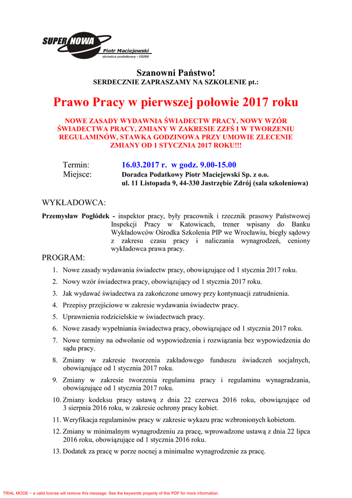 Szanowni Państwo! SERDECZNIE ZAPRASZAMY NA SZKOLENIE pt.: Prawo Pracy w pierwszej połowie 2017 roku NOWE ZASADY WYDAWNIA ŚWIADECTW PRACY, NOWY WZÓR ŚWIADECTWA PRACY, ZMIANY W ZAKRESIE ZZFŚ I W TWORZENIU REGULAMINÓW, STAWKA GODZINOWA PRZY UMOWIE ZLECENIE ZMIANY OD 1 STYCZNIA 2017 ROKU!!! Termin: Miejsce: 16.03.2017 r. w godz. 9.00-15.00 Doradca Podatkowy Piotr Maciejewski Sp. z o.o. ul. 11 Listopada 9, 44-330 Jastrzębie Zdrój (sala szkoleniowa) WYKŁADOWCA: Przemysław Pogłódek - inspektor pracy, były pracownik i rzecznik prasowy Państwowej Inspekcji Pracy w Katowicach, trener wpisany do Banku Wykładowców Ośrodka Szkolenia PIP we Wrocławiu, biegły sądowy z zakresu czasu pracy i naliczania wynagrodzeń, ceniony wykładowca prawa pracy. PROGRAM: 1. Nowe zasady wydawania świadectw pracy, obowiązujące od 1 stycznia 2017 roku. 2. Nowy wzór świadectwa pracy, obowiązujący od 1 stycznia 2017 roku. 3. Jak wydawać świadectwa za zakończone umowy przy kontynuacji zatrudnienia. 4. Przepisy przejściowe w zakresie wydawania świadectw pracy. 5. Uprawnienia rodzicielskie w świadectwach pracy. 6. Nowe zasady wypełniania świadectwa pracy, obowiązujące od 1 stycznia 2017 roku. 7. Nowe terminy na odwołanie od wypowiedzenia i rozwiązania bez wypowiedzenia do sądu pracy. 8. Zmiany w zakresie tworzenia zakładowego funduszu świadczeń socjalnych, obowiązujące od 1 stycznia 2017 roku. 9. Zmiany w zakresie tworzenia regulaminu pracy i regulaminu wynagradzania, obowiązujące od 1 stycznia 2017 roku. 10. Zmiany kodeksu pracy ustawą z dnia 22 czerwca 2016 roku, obowiązujące od 3 sierpnia 2016 roku, w zakresie ochrony pracy kobiet. 11. Weryfikacja regulaminów pracy w zakresie wykazu prac wzbronionych kobietom. 12. Zmiany w minimalnym wynagrodzeniu za pracę, wprowadzone ustawą z dnia 22 lipca 2016 roku, obowiązujące od 1 stycznia 2016 roku. 13. Dodatek za pracę w porze nocnej a minimalne wynagrodzenie za pracę. TRIAL MODE − a valid license will remove this message. See the keywords property of this PDF for more information. 14. Nowe minimalne wynagrodzenie za pracę. 15. Minimalne wynagrodzenie godzinowe przy umowie zlecenie. 16. Ustalanie wynagrodzenia przy umowach zlecenia. 17. Formułowanie zapisów w umowach zlecenia. 18. Działalność gospodarcza a stawka godzinowa. 19. Termin wypłaty przy umowie zlecenia. 20. Nowe zasady udzielania urlopów wychowawczych. 21. Urlopy macierzyńskie i rodzicielskie po zmianach. 22. Wypełnianie wniosków związanych z rodzicielstwem. 23. Zasady wykorzystywania opieki nad dzieckiem do lat 14. 24. Opieka udzielana na dni lub na godziny, wg wniosku pracownika. 25. Opieka nad dzieckiem przy zmianie wymiaru czasu pracy. 26. Nowe zasady zwalniania pracownika z obowiązku świadczenia pracy w okresie wypowiedzenia. 27. Kontrola ZUS w zakresie należności z tytułu podróży służbowych, kiedy można płacić dietę, a kiedy należy dokonać zmiany miejsca wykonywania pracy. 28. Dokumenty, jakich może żądać pracodawca od pracownika oraz od osoby ubiegającej się o zatrudnienie. 29. Ustalanie podstawy do wypłaty wynagrodzenia i dodatku za godziny nadliczbowe. 30. Termin wypłaty normalnego wynagrodzenia i dodatków za godziny nadliczbowe. AGENDA: 8.45 - 9.00 rejestracja uczestników szkolenia 9.00 - 10.30 wykład 10.30 - 10.45 przerwa kawowa 10.45 - 12.15 wykład 12.15 - 13.00 przerwa (kawa, herbata, poczęstunek) 13.00 - 15.00 wykład, pytania i odpowiedzi KOSZT SZKOLENIA: • 250 zł + VAT 23% • 230 zł + VAT 23% za każdą następną osobę z tej samej instytucji WSZYSTKIM UCZESTNIKOM SZKOLENIA ZAPEWNIAMY MATERIAŁY SZKOLENIOWE I CATERING. TRIAL MODE − a valid license will remove this message. See the keywords property of this PDF for more information. WARUNKI UCZESTNICTWA: Szkolenie odbędzie się pod warunkiem zgłoszenia odpowiedniej liczby uczestników. Zgłoszenie na szkolenie musi zostać potwierdzone przesłaniem karty uczestnictwa (fax: 32 7500022, mail: [email protected]). Ilość miejsc jest ograniczona – o uczestnictwie decyduje kolejność zgłoszeń. Brak pisemnej rezygnacji ze szkolenia do 3 dni przed terminem jest równoznaczny z obciążeniem Państwa należnością za szkolenie. Wpłaty należy dokonać najpóźniej na 3 dni przed szkoleniem w tytule przelewu podając nazwę szkolenia. ING Bank Śląski S.A. w Jastrzębiu Zdroju NR RACHUNKU: 85 1050 1605 1000 0022 4813 2181 Dodatkowych informacji udzielają: Monika Nazarewicz tel. 32 476 36 13 wew. 202 Magdalena Buturla tel. 32 476 36 13 wew. 203 Organizator szkolenia: Doradca Podatkowy Piotr Maciejewski Sp. z o.o. TRIAL MODE − a valid license will remove this message. See the keywords property of this PDF for more information.