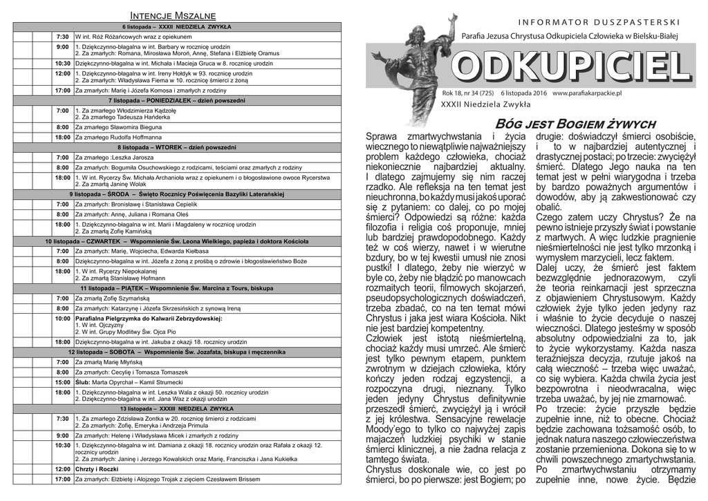 Intencje Mszalne 6 listopada – XXXII NIEDZIELA ZWYKŁA 7:30 W int. Róż Różańcowych wraz z opiekunem 9:00 1. Dziękczynno-błagalna w int. Barbary w rocznicę urodzin 2. Za zmarłych: Romana, Mirosława Moroń, Annę, Stefana i Elżbietę Oramus I N F O R M AT O R D U S Z PA S T E R S K I Parafia Jezusa Chrystusa Odkupiciela Człowieka w Bielsku-Białej 10:30 Dziękczynno-błagalna w int. Michała i Macieja Gruca w 8. rocznicę urodzin 12:00 1. Dziękczynno-błagalna w int. Ireny Hołdyk w 93. rocznicę urodzin 2. Za zmarłych: Władysława Fiema w 10. rocznicę śmierci z żoną 17:00 Za zmarłych: Marię i Józefa Komosa i zmarłych z rodziny 7 listopada – PONIEDZIAŁEK – dzień powszedni 7:00 1. Za zmarłego Włodzimierza Kądzołę 2. Za zmarłego Tadeusza Hańderka 8:00 Za zmarłego Sławomira Bieguna 18:00 Za zmarłego Rudolfa Hoffmanna 8 listopada – WTOREK – dzień powszedni 7:00 Za zmarłego :Leszka Jarosza 8:00 Za zmarłych: Bogumiła Osuchowskiego z rodzicami, teściami oraz zmarłych z rodziny 18:00 1. W int. Rycerzy Św. Michała Archanioła wraz z opiekunem i o błogosławione owoce Rycerstwa 2. Za zmarłą Janinę Wolak 9 listopada – ŚRODA – Święto Rocznicy Poświęcenia Bazyliki Laterańskiej 7:00 Za zmarłych: Bronisławę i Stanisława Cepielik 8:00 Za zmarłych: Annę, Juliana i Romana Oleś 18:00 1. Dziękczynno-błagalna w int. Marii i Magdaleny w rocznicę urodzin 2. Za zmarłą Zofię Kamińską 10 listopada – CZWARTEK – Wspomnienie Św. Leona Wielkiego, papieża i doktora Kościoła 7:00 Za zmarłych: Marię, Wojciecha, Edwarda Kiełbasa 8:00 Dziękczynno-błagalna w int. Józefa z żoną z prośbą o zdrowie i błogosławieństwo Boże 18:00 1. W int. Rycerzy Niepokalanej 2. Za zmarłą Stanisławę Hofmann 11 listopada – PIĄTEK – Wspomnienie Św. Marcina z Tours, biskupa 7:00 Za zmarłą Zofię Szymańską 8:00 Za zmarłych: Katarzynę i Józefa Skrzesińskich z synową Ireną 10:00 Parafialna Pielgrzymka do Kalwarii Zebrzydowskiej: 1. W int. Ojczyzny 2. W int. Grupy Modlitwy Św. Ojca Pio 18:00 Dziękczynno-błagalna w int. Jakuba z okazji 18. rocznicy urodzin 12 listopada – SOBOTA – Wspomnienie Św. Jozafata, biskupa i męczennika 7:00 Za zmarłą Marię Młyńską 8:00 Za zmarłych: Cecylię i Tomasza Tomaszek 15:00 Ślub: Marta Opyrchał – Kamil Strumecki 18:00 1. Dziękczynno-błagalna w int. Leszka Wala z okazji 50. rocznicy urodzin 2. Dziękczynno-błagalna w int. Jana Waz z okazji urodzin 13 listopada – XXXIII NIEDZIELA ZWYKŁA 7:30 1. Za zmarłego Zdzisława Zontka w 20. rocznicę śmierci z rodzicami 2. Za zmarłych: Zofię, Emeryka i Andrzeja Primula 9:00 Za zmarłych: Helenę i Władysława Micek i zmarłych z rodziny 10:30 1. Dziękczynno-błagalna w int. Damiana z okazji 18. rocznicy urodzin oraz Rafała z okazji 12. rocznicy urodzin 2. Za zmarłych: Janinę i Jerzego Kowalskich oraz Marię, Franciszka i Jana Kukiełka 12:00 Chrzty i Roczki 17:00 Za zmarłych: Elżbietę i Alojzego Trojak z zięciem Czesławem Brissem Rok 18, nr 34 (725) 2016 (609) www.parafiakarpackie.pl Rok 18,6 listopada nr 24 22 czerw- XXXII Niedziela Zwykła XII Niedziela Zwykła Bóg jest Bogiem żywych Sprawa zmartwychwstania i życia wiecznego to niewątpliwie najważniejszy problem każdego człowieka, chociaż niekoniecznie najbardziej aktualny. I dlatego zajmujemy się nim raczej rzadko. Ale refleksja na ten temat jest nieuchronna, bo każdy musi jakoś uporać się z pytaniem: co dalej, co po mojej śmierci? Odpowiedzi są różne: każda filozofia i religia coś proponuje, mniej lub bardziej prawdopodobnego. Każdy też w coś wierzy, nawet i w wierutne bzdury, bo w tej kwestii umusł nie znosi pustki! I dlatego, żeby nie wierzyć w byle co, żeby nie błądzić po manowcach rozmaitych teorii, filmowych skojarzeń, pseudopsychologicznych doświadczeń, trzeba zbadać, co na ten temat mówi Chrystus i jaka jest wiara Kościoła. Nikt nie jest bardziej kompetentny. Człowiek jest istotą nieśmiertelną, chociaż każdy musi umrzeć. Ale śmierć jest tylko pewnym etapem, punktem zwrotnym w dziejach człowieka, który kończy jeden rodzaj egzystencji, a rozpoczyna drugi, nieznany. Tylko jeden jedyny Chrystus definitywnie przeszedł śmierć, zwyciężył ją i wrócił z jej królestwa. Sensacyjne rewelacje Moody’ego to tylko co najwyżej zapis majaczeń ludzkiej psychiki w stanie śmierci klinicznej, a nie żadna relacja z tamtego świata. Chrystus doskonale wie, co jest po śmierci, bo po pierwsze: jest Bogiem; po drugie: doświadczył śmierci osobiście, i to w najbardziej autentycznej i drastycznej postaci; po trzecie: zwyciężył śmierć. Dlatego Jego nauka na ten temat jest w pełni wiarygodna i trzeba by bardzo poważnych argumentów i dowodów, aby ją zakwestionować czy obalić. Czego zatem uczy Chrystus? Że na pewno istnieje przyszły świat i powstanie z martwych. A więc ludzkie pragnienie nieśmiertelności nie jest tylko mrzonką i wymysłem marzycieli, lecz faktem. Dalej uczy, że śmierć jest faktem bezwzględnie jednorazowym, czyli że teoria reinkarnacji jest sprzeczna z objawieniem Chrystusowym. Każdy człowiek żyje tylko jeden jedyny raz i właśnie to życie decyduje o naszej wieczności. Dlatego jesteśmy w sposób absolutny odpowiedzialni za to, jak to życie wykorzystamy. Każda nasza teraźniejsza decyzja, rzutuje jakoś na całą wieczność – trzeba więc uważać, co się wybiera. Każda chwila życia jest bezpowrotna i nieodwracalna, więc trzeba uważać, by jej nie zmarnować. Po trzecie: życie przyszłe będzie zupełnie inne, niż to obecne. Chociaż będzie zachowana tożsamość osób, to jednak natura naszego człowieczeństwa zostanie przemieniona. Dokona się to w chwili powszechnego zmartychwstania. Po zmartwychwstaniu otrzymamy zupełnie inne, nowe życie. Będzie ono całkowicie wolne od doczesnych ograniczeń, trosk, ułomności. Miłość odzyska swój pełny, duchowy kształt i