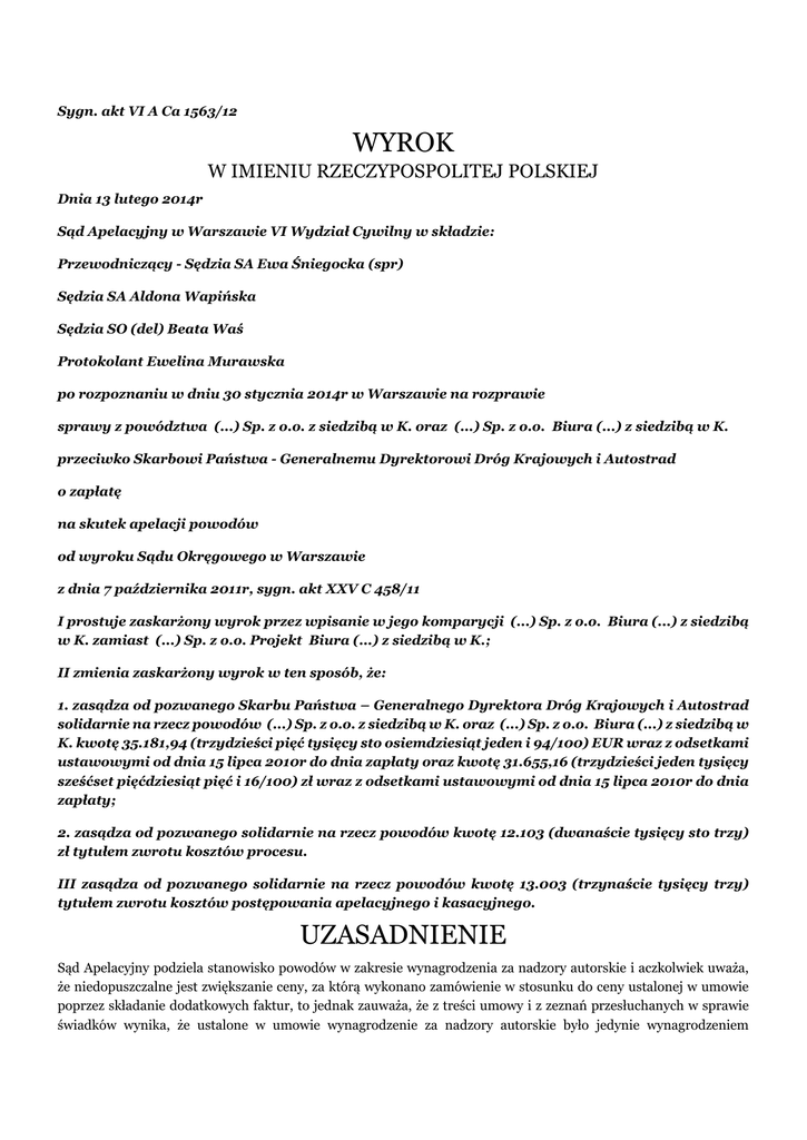 Sygn. akt VI A Ca 1563/12 WYROK W IMIENIU RZECZYPOSPOLITEJ POLSKIEJ Dnia 13 lutego 2014r Sąd Apelacyjny w Warszawie VI Wydział Cywilny w składzie: Przewodniczący - Sędzia SA Ewa Śniegocka (spr) Sędzia SA Aldona Wapińska Sędzia SO (del) Beata Waś Protokolant Ewelina Murawska po rozpoznaniu w dniu 30 stycznia 2014r w Warszawie na rozprawie sprawy z powództwa (...) Sp. z o.o. z siedzibą w K. oraz (...) Sp. z o.o. Biura (...) z siedzibą w K. przeciwko Skarbowi Państwa - Generalnemu Dyrektorowi Dróg Krajowych i Autostrad o zapłatę na skutek apelacji powodów od wyroku Sądu Okręgowego w Warszawie z dnia 7 października 2011r, sygn. akt XXV C 458/11 I prostuje zaskarżony wyrok przez wpisanie w jego komparycji (...) Sp. z o.o. Biura (...) z siedzibą w K. zamiast (...) Sp. z o.o. Projekt Biura (...) z siedzibą w K.; II zmienia zaskarżony wyrok w ten sposób, że: 1. zasądza od pozwanego Skarbu Państwa – Generalnego Dyrektora Dróg Krajowych i Autostrad solidarnie na rzecz powodów (...) Sp. z o.o. z siedzibą w K. oraz (...) Sp. z o.o. Biura (...) z siedzibą w K. kwotę 35.181,94 (trzydzieści pięć tysięcy sto osiemdziesiąt jeden i 94/100) EUR wraz z odsetkami ustawowymi od dnia 15 lipca 2010r do dnia zapłaty oraz kwotę 31.655,16 (trzydzieści jeden tysięcy sześćset pięćdziesiąt pięć i 16/100) zł wraz z odsetkami ustawowymi od dnia 15 lipca 2010r do dnia zapłaty; 2. zasądza od pozwanego solidarnie na rzecz powodów kwotę 12.103 (dwanaście tysięcy sto trzy) zł tytułem zwrotu kosztów procesu. III zasądza od pozwanego solidarnie na rzecz powodów kwotę 13.003 (trzynaście tysięcy trzy) tytułem zwrotu kosztów postępowania apelacyjnego i kasacyjnego. UZASADNIENIE Sąd Apelacyjny podziela stanowisko powodów w zakresie wynagrodzenia za nadzory autorskie i aczkolwiek uważa, że niedopuszczalne jest zwiększanie ceny, za którą wykonano zamówienie w stosunku do ceny ustalonej w umowie poprzez składanie dodatkowych faktur, to jednak zauważa, że z treści umowy i z zeznań przesłuchanych w sprawie świadków wynika, że ustalone w umowie wynagrodzenie za nadzory autorskie było jedynie wynagrodzeniem wstępnym, które mogło ulec zmianie. W każdym miejscu, w którym mowa jest o wynagrodzeniu za nadzory autorskie określa się jedynie „wstępne” wynagrodzenie. Świadczy to o tym, że strony od początku uważały, że to wynagrodzenie może ulec zmianie, tak, jak to jest zapisane w art. 15.4. Okazało się, że 1600 pobytów „branżowych zespołów projektantów” jest ilością wyraźnie niedoszacowaną, więc wynagrodzenie powodów powinno być większe - w związku z wyraźnie większą ilością nadzorów autorskich. Stałe było tylko wynagrodzenie za 1600 pobytów branżowych zespołów projektantów, co należy rozumieć w ten sposób, że cena zawarta w umowie opiewała na 1600 pobytów zespołów projektantów jednej branży, np. branży drogowej. Wykładnia pojęcia „branżowy zespół projektantów” jest oczywista i nie wymaga powoływania dowodu z opinii biegłego językoznawcy. Strona powodowa uzyskiwała miesięczne wynagrodzenie w wysokości 1/1600 kwoty 644.813,92 EUR brutto (art.15.4 umowy). Takie wynagrodzenie przysługiwało jej za 1600 pobytów 2 projektantów branży drogowej i 2 projektantów branży mostowej - obowiązek zapewnienia tego rodzaju nadzoru wynikał z art 5 ust 7 umowy. Oprócz tego służyło jej wynagrodzenie na każdorazowy pobyt projektantów, którego potrzebę zgłaszał zamawiający, pobyt wykraczający ponad 1600 ustalone w umowie oraz wynagrodzenie za każdorazowy pobyt projektantów branży drogowej i mostowej wykraczający ponad 1600 ustalone w umowie. Według powodów każdy projektant musi mieć zapłacone za swój przyjazd. Taka właśnie była interpretacja umowy przez powodów, którzy nie po raz pierwszy zawierali umowę z pozwanym. Powodowie uważają, że „pobyt branżowego zespołu projektantów” oznacza pobyt każdej branży osobno, więc pobyt 2 projektantów branży drogowej i 2 projektantów branży mostowej to są (według powodów) 2 pobyty, tymczasem pozwany uznał, że pobyt „branżowego zespołu projektantów” oznacza każdorazowy pobyt projektantów na budowie (nawet kilku branż), czyli faktycznie każdy pobyt zespołu projektantów, także z wielu branż. Definicja „branżowego zespołu projektantów” nie może być inna niż przyjmowana przez powodów-oznacza zespół projektantów jednej branży, nie zaś tak, jak według interpretacji pozwanego-zespół projektantów kilku branż, tylu, ilu było danego dnia potrzebnych na budowie. Rację mają w tym względzie powodowie. Sąd Apelacyjny nie podziela interpretacji umowy (jej zapisów dotyczących nadzorów autorskich) pozwanego zawartej w piśmie k-121. Nie można zakładać, tak, jak czyni to pozwany w tymże piśmie, że personel „w zakresie pozostałych branż” powinien być zapewniony przez wykonawcę w ramach ceny ryczałtowej rozliczanej dniówkowo, gdyż nie wynika to z treści umowy. Nie wolno też przyjmować, że pobyt zespołu branży np. elektrycznej to są „inne czynności składające się na pełnienie nadzoru autorskiego”, bowiem ani oferta ani też umowa stron o tym nie mówią. Należy uznać, że autorem umowy była strona pozwana, ona bowiem sformułowała wszystkie jej warunki - poza ostateczną ceną. Powodowie dokonywali jedynie wyliczeń. Pozwany przekazał powodom projekt umowy zawierający wszystkie - poza ceną - jej zapisy, które później znalazły się w ostatecznie podpisanej przez strony umowie, w szczególności zapis z art. 15.4 mówiący o założeniu 1600 całodziennych pobytów branżowych zespołów projektantów. Umowa była zawierana na podstawie oferty powodów, ale oferta ta nie mogła być sprzeczną z siwz - w związku z tym pozwany przygotował swój projekt, który przekazywał podmiotom uczestniczącym w przetargu. Nie było więc powodu, by zwra