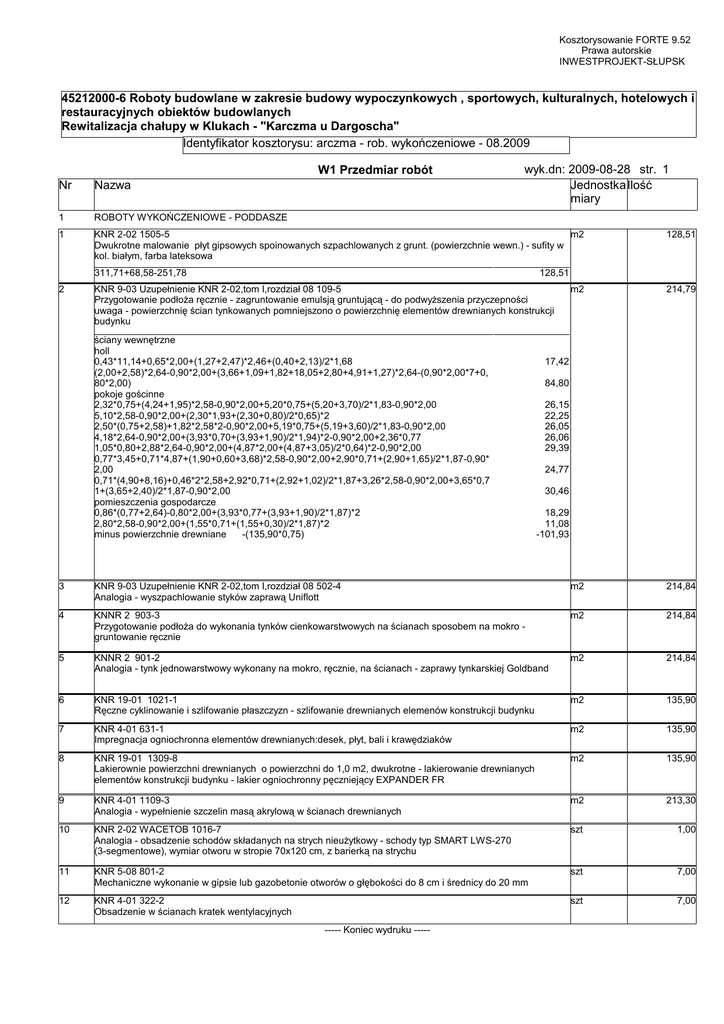 Kosztorysowanie FORTE 9.52 Prawa autorskie INWESTPROJEKT-SŁUPSK 45212000-6 Roboty budowlane w zakresie budowy wypoczynkowych , sportowych, kulturalnych, hotelowych i restauracyjnych obiektów budowlanych Rewitalizacja chałupy w Klukach - "Karczma u Dargoscha" Identyfikator kosztorysu: arczma - rob. wykończeniowe - 08.2009 W1 Przedmiar robót wyk.dn: 2009-08-28 str. 1 Jednostka Ilość miary Nr Nazwa 1 ROBOTY WYKOŃCZENIOWE - PODDASZE 1 KNR 2-02 1505-5 m2 Dwukrotne malowanie płyt gipsowych spoinowanych szpachlowanych z grunt. (powierzchnie wewn.) - sufity w kol. białym, farba lateksowa 311,71+68,58-251,78 2 128,51 128,51 KNR 9-03 Uzupełnienie KNR 2-02,tom I,rozdział 08 109-5 Przygotowanie podłoŜa ręcznie - zagruntowanie emulsją gruntującą - do podwyŜszenia przyczepności uwaga - powierzchnię ścian tynkowanych pomniejszono o powierzchnię elementów drewnianych konstrukcji budynku ściany wewnętrzne holl 0,43*11,14+0,65*2,00+(1,27+2,47)*2,46+(0,40+2,13)/2*1,68 (2,00+2,58)*2,64-0,90*2,00+(3,66+1,09+1,82+18,05+2,80+4,91+1,27)*2,64-(0,90*2,00*7+0, 80*2,00) pokoje gościnne 2,32*0,75+(4,24+1,95)*2,58-0,90*2,00+5,20*0,75+(5,20+3,70)/2*1,83-0,90*2,00 5,10*2,58-0,90*2,00+(2,30*1,93+(2,30+0,80)/2*0,65)*2 2,50*(0,75+2,58)+1,82*2,58*2-0,90*2,00+5,19*0,75+(5,19+3,60)/2*1,83-0,90*2,00 4,18*2,64-0,90*2,00+(3,93*0,70+(3,93+1,90)/2*1,94)*2-0,90*2,00+2,36*0,77 1,05*0,80+2,88*2,64-0,90*2,00+(4,87*2,00+(4,87+3,05)/2*0,64)*2-0,90*2,00 0,77*3,45+0,71*4,87+(1,90+0,60+3,68)*2,58-0,90*2,00+2,90*0,71+(2,90+1,65)/2*1,87-0,90* 2,00 0,71*(4,90+8,16)+0,46*2*2,58+2,92*0,71+(2,92+1,02)/2*1,87+3,26*2,58-0,90*2,00+3,65*0,7 1+(3,65+2,40)/2*1,87-0,90*2,00 pomieszczenia gospodarcze 0,86*(0,77+2,64)-0,80*2,00+(3,93*0,77+(3,93+1,90)/2*1,87)*2 2,80*2,58-0,90*2,00+(1,55*0,71+(1,55+0,30)/2*1,87)*2 minus powierzchnie drewniane -(135,90*0,75) m2 214,79 17,42 84,80 26,15 22,25 26,05 26,06 29,39 24,77 30,46 18,29 11,08 -101,93 3 KNR 9-03 Uzupełnienie KNR 2-02,tom I,rozdział 08 502-4 Analogia - wyszpachlowanie styków zaprawą Uniflott m2 214,84 4 KNNR 2 903-3 Przygotowanie podłoŜa do wykonania tynków cienkowarstwowych na ścianach sposobem na mokro gruntowanie ręcznie m2 214,84 5 KNNR 2 901-2 Analogia - tynk jednowarstwowy wykonany na mokro, ręcznie, na ścianach - zaprawy tynkarskiej Goldband m2 214,84 6 KNR 19-01 1021-1 Ręczne cyklinowanie i szlifowanie płaszczyzn - szlifowanie drewnianych elemenów konstrukcji budynku m2 135,90 7 KNR 4-01 631-1 Impregnacja ogniochronna elementów drewnianych:desek, płyt, bali i krawędziaków m2 135,90 8 KNR 19-01 1309-8 Lakierownie powierzchni drewnianych o powierzchni do 1,0 m2, dwukrotne - lakierowanie drewnianych elementów konstrukcji budynku - lakier ogniochronny pęczniejący EXPANDER FR m2 135,90 9 KNR 4-01 1109-3 Analogia - wypełnienie szczelin masą akrylową w ścianach drewnianych m2 213,30 10 KNR 2-02 WACETOB 1016-7 Analogia - obsadzenie schodów składanych na strych nieuŜytkowy - schody typ SMART LWS-270 (3-segmentowe), wymiar otworu w stropie 70x120 cm, z barierką na strychu szt 1,00 11 KNR 5-08 801-2 Mechaniczne wykonanie w gipsie lub gazobetonie otworów o głębokości do 8 cm i średnicy do 20 mm szt 7,00 12 KNR 4-01 322-2 Obsadzenie w ścianach kratek wentylacyjnych szt 7,00 ----- Koniec wydruku -----