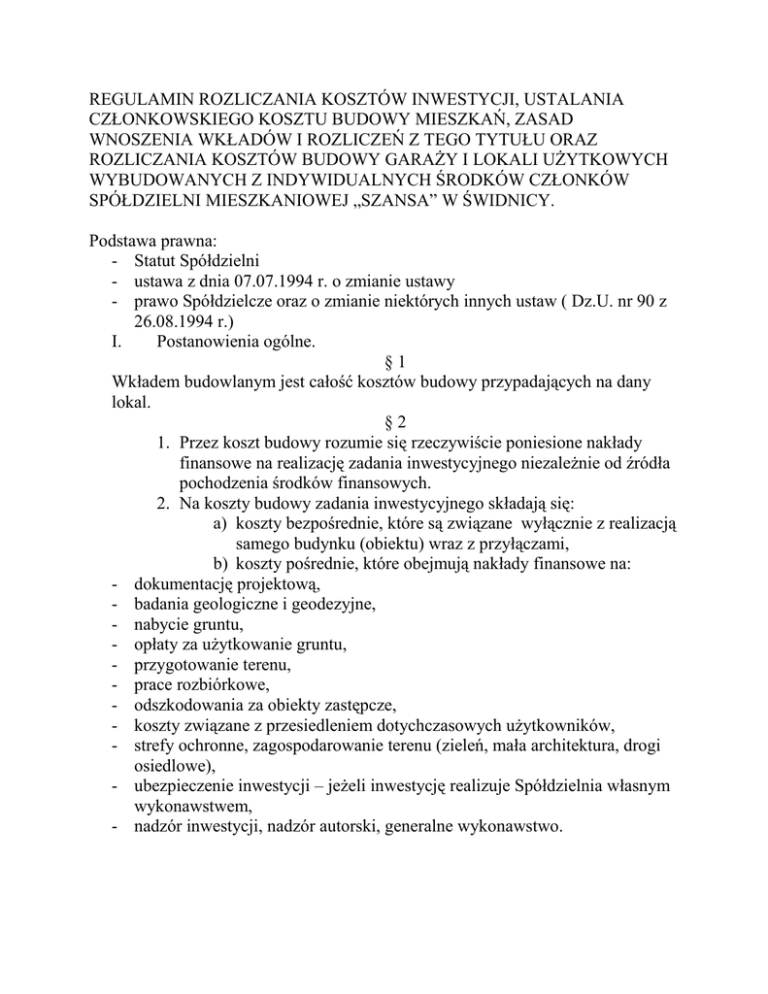 REGULAMIN ROZLICZANIA KOSZTÓW INWESTYCJI, USTALANIA CZŁONKOWSKIEGO KOSZTU BUDOWY MIESZKAŃ, ZASAD WNOSZENIA WKŁADÓW I ROZLICZEŃ Z TEGO TYTUŁU ORAZ ROZLICZANIA KOSZTÓW BUDOWY GARAŻY I LOKALI UŻYTKOWYCH WYBUDOWANYCH Z INDYWIDUALNYCH ŚRODKÓW CZŁONKÓW SPÓŁDZIELNI MIESZKANIOWEJ „SZANSA” W ŚWIDNICY. Podstawa prawna: - Statut Spółdzielni - ustawa z dnia 07.07.1994 r. o zmianie ustawy - prawo Spółdzielcze oraz o zmianie niektórych innych ustaw ( Dz.U. nr 90 z 26.08.1994 r.) I. Postanowienia ogólne. §1 Wkładem budowlanym jest całość kosztów budowy przypadających na dany lokal. §2 1. Przez koszt budowy rozumie się rzeczywiście poniesione nakłady finansowe na realizację zadania inwestycyjnego niezależnie od źródła pochodzenia środków finansowych. 2. Na koszty budowy zadania inwestycyjnego składają się: a) koszty bezpośrednie, które są związane wyłącznie z realizacją samego budynku (obiektu) wraz z przyłączami, b) koszty pośrednie, które obejmują nakłady finansowe na: - dokumentację projektową, - badania geologiczne i geodezyjne, - nabycie gruntu, - opłaty za użytkowanie gruntu, - przygotowanie terenu, - prace rozbiórkowe, - odszkodowania za obiekty zastępcze, - koszty związane z przesiedleniem dotychczasowych użytkowników, - strefy ochronne, zagospodarowanie terenu (zieleń, mała architektura, drogi osiedlowe), - ubezpieczenie inwestycji – jeżeli inwestycję realizuje Spółdzielnia własnym wykonawstwem, - nadzór inwestycji, nadzór autorski, generalne wykonawstwo. §3 Jeżeli zadanie inwestycyjne jest wieloobiektowe (kilka budynków) koszty pośrednie rozlicza się proporcjonalnie do sumy powierzchni użytkowej mieszkań każdego budynku. §4 1. Zadaniem inwestycyjnym podlegającym rozliczaniu z członkami jest taki zakres inwestycji, który umożliwia przekazanie mieszkań lub lokali użytkowych do dyspozycji członkom. 2. Określając wielkość zadania inwestycyjnego należy uwzględnić warunki techniczne, technologiczne i organizacyjne dopuszczenia obiektu do eksploatacji. II. Ustalenie członkowskiego kosztu budowy oraz wkładu mieszkaniowego i budowlanego z nowych inwestycji. §5 1. koszty budowy i wkłady budowlane i garażowe ustala się dwuetapowo: a) wstępnie przy podziale lokali, w oparciu o planowany członkowski koszt budowy, wynikający ze zbiorowego zestawienia kosztów zadania inwestycyjnego ( może podlegać aktualizacji), b) ostatecznie po końcowym rozliczeniu zadania inwestycyjnego, nie później jak w ciągu 90 dni po zakończeniu jego rozliczenia. Ostateczne rozliczenie uwzględnia wszystkie poniesione koszty budowy. Jednostką rozliczeniową jest m2 powierzchni użytkowej lokalu. W przypadku, gdy budynek mieszkalny jest realizowany łącznie z budowanymi w parterze lokalami handlowymi lub usługowymi, koszt 1 m2 pow. użytkowej zostaje obliczony odrębnie na część mieszkalną i lokale użytkowe z zastosowaniem metod kosztorysowania. 2. Wstępny członkowski koszt budowy 1 m2 powierzchni użytkowej podlega zatwierdzeniu przez Radę Nadzorcza. 3. Członkowski koszt budowy lokalu ustala się mnożąc członkowski koszt budowy 1 m2 przez powierzchnię danego lokalu. 4. Wyliczony członkowski koszt budowy jest korygowany współczynnikami atrakcyjności z tytułu położenia lokalu na różnych kondygnacjach, które wynoszą: a) dla budynków 3- kondygnacyjnych: - parter – 0,90 - I piętro – 1,10 - II piętro – 1,00 b) dla budynków 4- kondygnacyjnych: - parter – 0,90 - I piętro – 1,10 - II piętro – 1,05 - III piętro – 0,95 c) dla budynków 5- kondygnacyjnych: - parter – 0,90 - I piętro- 1,10 - II piętro- 1,10 - III piętro – 1,00 - IV piętro- 0,90 §6 Wymagany wkład członek zobowiązany jest wnieść w terminach i wielkości ustalonej przez Radę Nadzorczą. §7 Ustanowiony w oparciu o postanowienia niniejszego regulaminu członkowski koszt budowy jest podstawą do: 1) ustalania wkładów budowlanych i zaliczek na te wkłady, 2) rozliczeń z członkami z tytułu wniesionych wkładów, o których mowa w pkt. 1, 3) ustalenia miesięcznych obciążeń z tytułu spłaty kredytu, 4) rozliczenia z bankiem kredytów zaciągniętych na realizację inwestycji. §8 Jeżeli w wyniku „ostatecznego” rozliczenia kosztów budowy powstanie różnica pomiędzy „wstępnie” ustaloną wysokością zaliczki na wkład budowlany lub wkładu budowlanego, kosztami rzeczywistymi na przydzielony członkowi lokal, rozliczenie z tego tytułu przeprowadzi Zarząd Spółdzielni po rozliczeniu ostatniego zadania niekubaturowego. III. Wkłady na mieszkania z nowych inwestycji. §9 1) Wkłady budowlane na mieszkania własnościowe ustala się wstępnie przed rozpoczęciem realizacji inwestycji. 2) Zaliczkę na wkład budowlany wnosi się w wysokości nie mniej niż 20% inwestycji. Pozostałą część członek może wnosić systemem ratalnym lub jednorazowo zaciągając kredyt hipoteczny bądź komercyjny. 3) Stosownie do zaangażowania w budowę środków własnych członka, Spółdzielnia oblicza odsetki od kredytu pobranego na realizację, które wpływają na wysokość tylko tej części kosztów pośrednich przypadających na dane mieszkanie. 4) Ostateczne rozliczenie następuje po ustaleniu rzeczywistego członkowskiego kosztu budowy z zachowaniem terminu określonego w § 5 § 10 Szczegółowe zasady i terminy wnoszenia wpłat na wkład mieszkaniowy lub budowlany określa umowa zawarta pomiędzy Zarządem Spółdzielni a członkiem zakwalifikowanym do przydziału mieszkania. IV. Zasady rozliczeń wkładów za lokale zwalniane. § 11 Jeżeli prawo do lokalu wygasło przed 26.09.1994 r. ( przed terminem wejścia w życie ustawy nowelizującej Prawo Spółdzielcze) rozliczenie wkładów dokonuje się na podstawie przepisów dotychczasowych, a po tej dacie na podstawie niniejszego regulaminu. § 12 1. W razie wygaśnięcia własnościowego prawa do lokalu Spółdzielnia zwraca osobie uprawnionej 