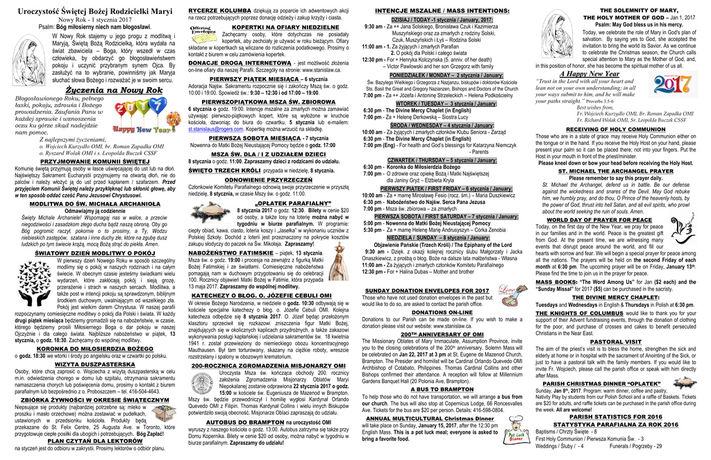 Uroczystość Świętej Bożej Rodzicielki Maryi Nowy Rok - 1 stycznia 2017 Psalm: Bóg miłosierny niech nam błogosławi. W Nowy Rok stajemy u jego progu z modlitwą i Maryją, Świętą Bożą Rodzicielką, która wydała na świat zbawiciela – Boga, który wszedł w czas człowieka, by obdarzyć go błogosławieństwem pokoju i uczynić przybranym synem Ojca. By zasłużyć na to wybranie, powinniśmy jak Maryja słuchać słowa Bożego i rozważać je w swoim sercu. Życzenia na Nowy Rok Błogosławionego Roku, pełnego łaski, pokoju, zdrowia i Bożego prowadzenia. Zaufania Panu w każdej sprawie i wznoszenia oczu ku górze skąd nadejdzie nam pomoc. Z najlepszymi życzeniami, o. Wojciech Kurzydło OMI, br. Roman Zapadka OMI o. Ryszard Wolak OMI i s. Leopolda Buczek CSSF PRZYJMOWANIE KOMUNII ŚWIĘTEJ Komunię świętą przyjmują osoby w łasce uświęcającej do ust lub na dłoń. Najświętszy Sakrament Eucharystii przyjmujemy na otwartą dłoń, nie do palców i należy włożyć ją do ust przed kapłanem / szafarzem. Przed przyjęciem Komunii Świętej należy przyklęknąć lub skłonić głowę, aby w ten sposób oddać cześć Panu Jezusowi Chrystusowi. MODLITWA DO ŚW. MICHAŁA ARCHANIOŁA Odmawiajmy ją codziennie Święty Michale Archaniele! Wspomagaj nas w walce, a przeciw niegodziwości i zasadzkom złego ducha bądź naszą obroną. Oby go Bóg pogromić raczył, pokornie o to prosimy, a Ty, Wodzu niebieskich zastępów, szatana i inne duchy złe, które na zgubę dusz ludzkich po tym świecie krążą, mocą Bożą strąć do piekła. Amen. ŚWIATOWY DZIEŃ MODLITWY O POKÓJ W pierwszy dzień Nowego Roku w sposób szczególny modlimy się o pokój w naszych rodzinach i na całym świecie. W obecnym czasie jesteśmy świadkami wielu wydarzeń, które zakłócają pokój i sieją grozę, przerażenie i strach w naszych sercach. Modlitwa, a także post w intencji pokoju są sprawdzonym, biblijnym środkiem duchowym, uwalniającym od wszelkiego zła. Pokój jest wielkim darem Chrystusa. W naszej parafii rozpoczynamy comiesięczne modlitwy o pokój dla Polski i świata. W każdy drugi piątek miesiąca będziemy gromadzili się na nabożeństwie, w czasie, którego będziemy prosili Miłosiernego Boga o dar pokoju w naszej Ojczyźnie i dla całego świata. Najbliższe nabożeństwo w piątek, 13 stycznia, o godz. 18:30. Zachęcamy do wspólnej modlitwy. KORONKA DO MIŁOSIERDZIA BOŻEGO o godz. 18:30 we wtorki i środy po angielsku oraz w czwartki po polsku. WIZYTA DUSZPASTERSKA Osoby, które chcą zaprosić o. Wojciecha z wizytą duszpasterską w celu m.in. odwiedzenia chorego w domu lub szpitalu, otrzymania sakramentu namaszczenia chorych lub poświęcenia domu, prosimy o kontakt z biurem parafialnym lub bezpośrednio z o. Proboszczem – tel. 416-504-4643. ZBIÓRKA ŻYWNOŚCI W OKRESIE ŚWIĄTECZNYM Niepsujące się produkty (najbardziej potrzebne są: mleko w proszku i masło orzechowe) można zostawiać w pudełkach, ustawionych w przedsionku kościoła. Produkty będą przekazane do St. Felix Centre, 25 Augusta Ave. w Toronto, które przygotowuje ciepłe posiłki dla ubogich i potrzebujących. Bóg Zapłać! PLAN CZYTAŃ DLA LEKTORÓW na styczeń jest do odbioru w zakrystii. Prosimy lektorów o odbiór planu. RYCERZE KOLUMBA dziękują za poparcie ich adwentowych akcji na rzecz potrzebujących poprzez donację odzieży i zakup krzyży i ciasta. KOPERTKI NA OFIARY NIEDZIELNE Zachęcamy osoby, które dotychczas nie posiadały kopertek, aby zechciały je używać w roku bieżącym. Ofiary składane w kopertkach są wliczane do rozliczenia podatkowego. Prosimy o kontakt z biurem w celu zamówienia kopertek. DONACJE DROGĄ INTERNETOWĄ - jest możliwość złożenia on-line ofiary dla naszej Parafii. Szczegóły na stronie: www.stanislaw.ca. PIERWSZY PIĄTEK MIESIĄCA – 6 stycznia Adoracja Najśw. Sakramentu rozpocznie się i zakończy Mszą św. o godz. 10:00 i 19:00. Spowiedź św.: 9:30 – 12:30 i od 17:00 – 19:00. PIERWSZOPIĄTKOWA MSZA ŚW. ZBIOROWA 6 stycznia o godz. 19:00. Intencje mszalne za zmarłych można zamawiać używając pierwszo-piątkowych kopert, które są wyłożone w kruchcie kościoła, dzwoniąc do biura do czwartku, 5 stycznia lub e-mailem: [email protected]. Kopertkę można wrzucić na składkę. PIERWSZA SOBOTA MIESIĄCA - 7 stycznia Nowenna do Matki Bożej Nieustającej Pomocy będzie o godz. 17:00 MSZA ŚW. DLA / I Z UDZIAŁEM DZIECI 8 stycznia o godz. 11:00. Zapraszamy dzieci z rodzicami do udziału. ŚWIĘTO TRZECH KRÓLI przypada w niedzielę, 8 stycznia. ODNOWIENIE PRZYRZECZEŃ Członkowie Komitetu Parafialnego odnowią swoje przyrzeczenie w przyszłą niedzielę, 8 stycznia, w czasie Mszy św. o godz. 11:00. „OPŁATEK PARAFIALNY” 8 stycznia 2017 o godz. 12:30. Bilety w cenie $20 od osoby, a także losy na loterię można nabyć w tygodniu w biurze parafialnym. W programie: ciepły obiad, kawa, ciasto, loteria koszy i „Jasełka” w wykonaniu uczniów z Polskiej Szkoły. Dochód z loterii jest przeznaczony na pokrycie kosztów zakupu słodyczy do paczek na Św. Mikołaja. Zapraszamy! NABOŻEŃSTWO FATIMSKIE – piątek, 13 stycznia. Msza św. o godz. 19:00 i procesja na zewnątrz z figurką Matki Bożej Fatimskiej i ze światłami. Comiesięczne nabożeństwa pomagają nam w duchowym przygotowaniu się do celebracji 100. Rocznicy objawień Matki Bożej w Fatimie, która przypada 13 maja 2017. Zapraszamy do wspólnej modlitwy. KATECHEZY O BŁOG. O. JÓZEFIE CEBULI OMI W okresie Bożego Narodzenia, w niedziele o godz. 10:30 odbywają się w kościele specjalne katechezy o błog. o. Józefie Cebuli OMI. Kolejna katecheza odbędzie się 8 stycznia 2017. O. Józef będąc przełożonym klasztoru sprzeciwił się rozkazowi zniszczenia figur Matki Bożej, znajdujących się w okolicznych kaplicach przydrożnych, a także zakazowi wykonywania posługi kapłańskiej i udzielania sakramentów św. 18 kwietnia 1941 r. został przewiezi
