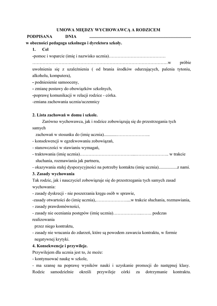 UMOWA MIĘDZY WYCHOWAWCĄ A RODZICEM PODPISANA DNIA ............................................................................................. w obecności pedagoga szkolnego i dyrektora szkoły. 1. Cel -pomoc i wsparcie (imię i nazwisko ucznia)………………………………… …………………………………………………………………………………w próbie uwolnienia się z uzależnienia ( od brania środków odurzających, palenia tytoniu, alkoholu, komputera), - podniesienie samooceny, - zmianę postawy do obowiązków szkolnych, -poprawę komunikacji w relacji rodzice - córka. -zmiana zachowania ucznia/uczennicy 2. Lista zachowań w domu i szkole. Zarówno wychowawca, jak i rodzice zobowiązują się do przestrzegania tych samych zachowań w stosunku do (imię ucznia)............………………….. - konsekwencji w egzekwowaniu zobowiązań, - stanowczości w stawianiu wymagań, - traktowania (imię ucznia)………………………………...………………….. w trakcie słuchania, rozmawiania jak partnera, - okazywania stałej dyspozycyjności na potrzeby kontaktu (imię ucznia).................z nami. 3. Zasady wychowania Tak rodzic, jak i nauczyciel zobowiązuje się do przestrzegania tych samych zasad wychowania: - zasady dyskrecji - nie poszerzania kręgu osób w sprawie, -zasady otwartości do (imię ucznia),…………………....w trakcie słuchania, rozmawiania, - zasady prawdomówności, - zasady nie oceniania postępów (imię ucznia)………………..……. podczas realizowania przez niego kontraktu, - zasady nie wracania do zdarzeń, które są powodem zawarcia kontraktu, w formie negatywnej krytyki. 4. Konsekwencje i przywileje. Przywilejem dla ucznia jest to, że może: - kontynuować naukę w szkole, - ma szansę na poprawę wyników nauki i uzyskanie promocji do następnej klasy. Rodzic samodzielnie określi przywileje córki za dotrzymanie kontraktu. Konsekwencją niedotrzymania kontraktu będzie decyzja dyrektora szkoły podjęta po zakończeniu czasu trwania umowy, czyli (data)…………….......................……. 5. Zobowiązania obu stron Rodzic zobowiązuje się do: - wcześniejszego powiadomienia szkoły o przewidywanej nieobecności córki /syna w szkole, - kontaktu telefonicznego w każdy (dzień tygodnia)……………………............................, w godz…………………………………………......................….. / pokój nauczycielski lub gabinet pedagoga / dyrektora szkoły/, - osobistego kontaktu z: wychowawcą ( jak często)….......................………………….….., pedagogiem szkolnym ( jak często)………………………………..............................…...... Wychowawca zobowiązuje się do: - telefonicznego powiadomienia rodzica w razie nieusprawiedliwionej nieobecności (imię ucznia) ……........................…………....................................................………….w szkole, - powiadomienia rodzica o złamaniu kontraktu. 6. Czas obowiązywania umowy. Umowa pomiędzy wychowawcą a rodzicem trwa od dnia podpisania do (data)……........... Podpis rodzica ………………………………… Podpis wychowawcy ………………………………. Miejsce, data…………………….....................…………………………………..……………..