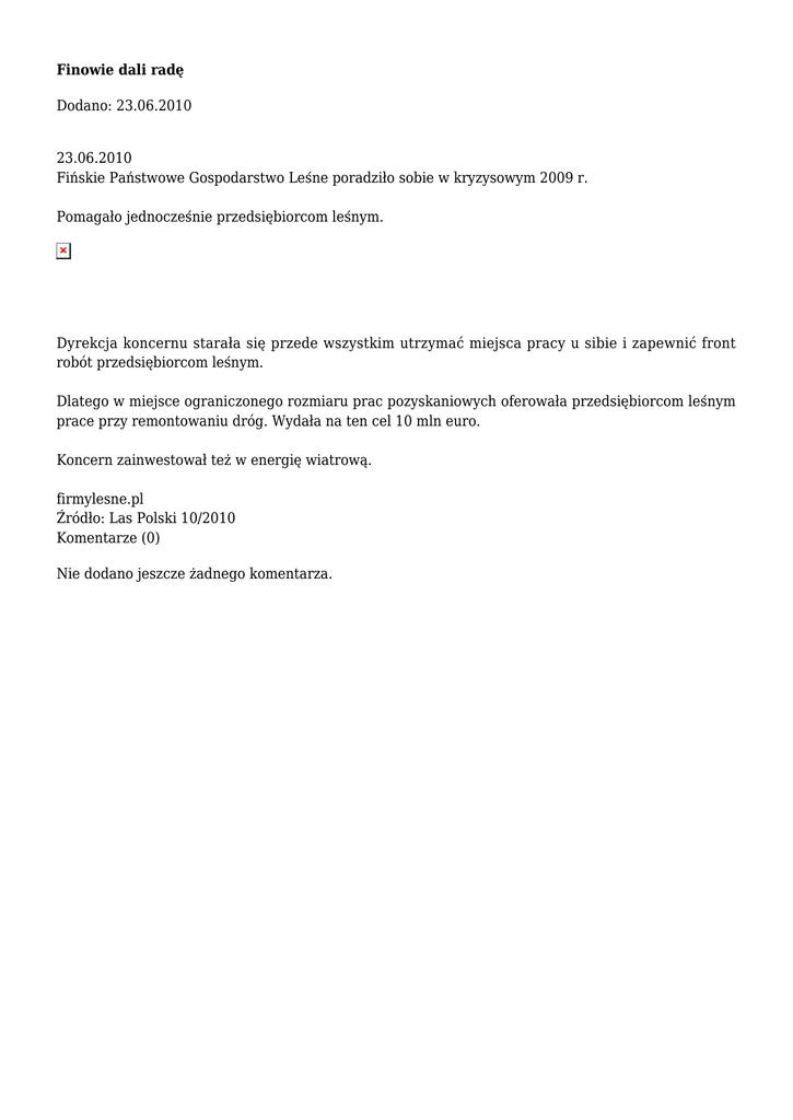 Finowie dali radę Dodano: 23.06.2010 23.06.2010 Fińskie Państwowe Gospodarstwo Leśne poradziło sobie w kryzysowym 2009 r. Pomagało jednocześnie przedsiębiorcom leśnym. Dyrekcja koncernu starała się przede wszystkim utrzymać miejsca pracy u sibie i zapewnić front robót przedsiębiorcom leśnym. Dlatego w miejsce ograniczonego rozmiaru prac pozyskaniowych oferowała przedsiębiorcom leśnym prace przy remontowaniu dróg. Wydała na ten cel 10 mln euro. Koncern zainwestował też w energię wiatrową. firmylesne.pl Źródło: Las Polski 10/2010 Komentarze (0) Nie dodano jeszcze żadnego komentarza.
