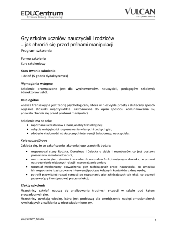 Gry szkolne uczniów, nauczycieli i rodziców – jak chronić się przed próbami manipulacji Program szkolenia Forma szkolenia Kurs szkoleniowy Czas trwania szkolenia 1 dzień (5 godzin dydaktycznych) Wymagania wstępne Szkolenie przeznaczone jest dla wychowawców, nauczycieli, pedagogów szkolnych i dyrektorów szkół. Cele ogólne Analiza transakcyjna jest teorią psychologiczną, która w niezwykle prosty i skuteczny sposób wyjaśnia stosunki międzyludzkie. Zastosowana do opisu sposobu komunikowania się pozwala chronić się przed próbami manipulacji. Szkolenie ma na celu: zapoznanie uczestników z teorią analizy transakcyjnej; nabycie umiejętności rozpoznawania własnych i cudzych gier; zdobycie wiadomości nt skutecznych interwencji świadomego nauczyciela; Cele szczegółowe Zakłada się, że po zakończeniu szkolenia jego uczestnik będzie: rozpoznawał stany Rodzica, Dorosłego i Dziecka u siebie i rozmówców, co jest postawą poszerzenia samoświadomości ; znał znaczenie gier, rytuałów i procedur dla normalnie funkcjonującego człowieka, co pozwoli na zrozumienie niejasnych relacji i wprowadzanie zmian; rozumiał mechanizmy prowadzenia gier zakłócających pracę nauczyciela, co umożliwi ich rozpoznanie i zastosowanie interwencji podczas kolejnych kontaktów z daną osobą; potrafił przewidzieć rozwój sytuacji po rozpoznaniu gier zakłócających tok lekcji, co pozwoli przerwać grę i kontynuować pracę na lekcji; Efekty szkolenia Uczestnicy szkoleń nauczą się analizowania trudnych sytuacji w szkole pod kątem prowadzonych gier. Uczestnicy uzyskają wiedzę, która jest podstawą dla zmniejszenie napięć emocjonalnych wynikających z uwikłania w nieuświadomione gry. programGRY_Szk.doc 1 Tematyka zajęć i plan szkolenia Temat 1. Moja wewnętrzna gra – głos Rodzica, Dorosłego i Dziecka: Czym jest analiza transakcyjna? Analiza struktury osobowości; Pozycje życiowe – Ja-Ty; 2. Sposoby budowania relacji między nauczycielem rodzicem i uczniem: Wycofanie; Rytuały; Procedura; Rozgrywki; Gry; Intymność; 3. Gry psychologiczne – analiza zjawiska: Czym jest gra psychologiczna? Przebieg gry; Korzyści z gier; 4. Przegląd gier: Gry zakłócające spokój; Gry ratownicze; Gry wdzięczności; Gry upokarzające; Gry kusicielskie; Gry erotyczne; 5. Sposoby radzenia sobie z grami: Odmowa rozpoczęcia gry; Przerwanie gry; Znaczenie antytezy; Wyraźne określenie obowiązków; programGRY_Szk.doc 2