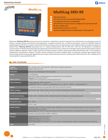 Rejestracja danych MultiLog SRD-99 rejestrator danych do 8 wejść 0/4-20 mA lub Pt100/Pt500/Pt1000 2 przekaźniki elektroniczne (optoMOS) port USB Host do zapisu danych i konfiguracji w pamięciach flash RS-485 / Modbus RTU wyświetlanie pomiarów w °C lub °F darmowe oprogramowanie konfiguracyjne i rejestrujące PC Rejestrator MultiLog SRD-99 przeznaczony jest do rejestracji i wyświetlania wartości bieżących lub uśrednionych oraz prezentacji w formie wykresu trendów różnych parametrów technologicznych. Urządzenie posiada max. 8 wejść pomiarowych: czujniki Pt 100/500 /1000 lub sygnały prądowe 0/4-20 mA; 1 wejście impulsowe (cyfrowe) sterujące procesem rejestracji oraz 1 port USB Host do przechowywania danych w pamięci flash. MultiLog SRD-99 wyposażony jest w 2 wyjścia przekaźnikowe 24V AC (35V DC) / 200 mA, dla obciążenia o charakterze rezystancyjnym. Podstawową funkcją wyjść jest sygnalizacja stanów alarmowych, jednak menu konfiguracyjne pozwala wykorzystać je także w różnych układach regulacji. Każde z wyjść może być sterowane jednym kanałem lub grupą kanałów pomiarowych (od 1 do 8 kanałów) z indywidualnie nastawianymi progami. Ponadto istnieje możliwość sterowania obydwu wyjść na podstawie wskazań tego samego kanału pomiarowego (lub tej samej grupy). Sygnalizacja stanu wyjść zrealizowana jest w postaci 2 pól opisanych odpowiednio R1 i R2, znajdujących się w lewym górnym rogu wyświetlacza LCD. DANE TECHNICZNE Zasilanie Pobór mocy 19V ÷ 50V DC; 16V ÷ 35V AC lub 85 ÷ 260V AC/DC, wszystkie separowane typowo 7VA; max 12 VA Wyświetlacz graficzny LCD, podświetlany 128 x 64 punktów Wejścia 1, 4 lub 8 wejść: RTD: Pt100, Pt500, Pt1000 (podpięcie 2-przewodowe lub 3-przewodowe) prądowe: 0-20 mA lub 4-20 mA 1 wejście 24 V, transoptorowe, izolowane galwanicznie Wejście cyfrowe wejścia prądowe: ± 9999 + przecinek wejścia RTD: -100,0°C ÷ +600,0°C z rozdzielczością 0,1°C / -148,0°F ÷ +999,9°F z rozdzielczością 0,1°F Wyjścia 2 przekaźniki elektroniczne typ NO (ER1, ER2) 24V AC (35V DC) / 200 mA Wyjście zasilające tylko wersja z 0/4 - 20 mA: 24V DC + 5% / max. 200 mA, nieseparowane od wejść pomiarowych Parametry rejestracji danych 1 s / 2 s / 5 s / 10 s / 15 s / 20 s / 30 s / 1 min / 2 min / 5 min / 10 min / 15 min / 20 min / 30 min / 60 min Interfejs komunikacyjny RS-485, 1200 ÷ 115200 bit/s, 8N1 oraz 8N2, Modbus RTU (izolowany od wejść pomiarowych) Pamięć danych 2 MB (ponad 500 000 pomiarów) w wersji bez USB; 8 MB (ponad 2 000 000 pomiarów) w wersji z portem USB Host Temperatura pracy 0°C ÷ +50°C Temperatura składowania -10°C ÷ +70°C Stopień ochrony wersja bez USB: IP 65 (front), dostępne opcje: dodatkowa ramka IP 65 uszczelniająca wycięcie w panelu, drzwiczki STD-99 z kluczykiem (patrz: akcesoria) wersja z USB: a) IP 40, b) IP 54 (po zastosowaniu drzwiczek transparentnych z kluczykiem STD-99, patrz: akcesoria) Obudowa tablicowa; materiał obudowy: NORYL - GFN2S E1 Wymiary obudowa (WxHxD): 96 x 96 x 100 mm otwór montażowy: 90,5 x 90,5 mm głębokość montażowa: min. 102 mm grubość płyty tablicy: standardowo 7 mm, inna zależnie od zastosowanego uchwytu montażowego (patrz: Akcesoria) Waga max. 420 g SIMEX Sp. z o.o., ul. Wielopole 11, 80-556 Gdańsk, tel. (+48) 58 762-07-77, fax 58 762-07-70, www.simex.pl KKATAPL_v1.16.061 Zakres pomiarowy SRD-99.1 Rejestracja danych WYMIARY 8 102 mm 96 mm 90,5 mm 96 mm } konektory: rozłączne (wersja I) stałe (wersja RTD) 90,5 mm Wymiary zewnętrzne Widok z boku Wymiary otworu montażowego PRZYKŁADOWY SPOSÓB PODŁĄCZENIA 1 2 L N 4 5 6 7 9 10 11 12 13 14 n.c. DIN- DIN+ 85-260V AC 50/60Hz 12VA ER1 ER2 wejście cyfrowe DATA+ DATAGND-RS RS 485 Uwaga! Zaciski GND i AGND nie są separowane GND 1 2 L N 85-260V AC 50/60Hz 12VA 5 4 6 7 9 10 11 12 13 14 n.c. DIN- DIN+ ER1 ER2 wejście cyfrowe DATA+ DATAGND-RS RS 485 15 16 17 18 19 20 21 22 23 24 25 26 zaciski łączeniowe (zwarte) 15 16 17 18 19 20 21 22 23 24 25 26 AIN5 GND +24V +24V AIN6 AIN7 AIN8 27 28 29 30 31 32 33 34 35 36 37 38 27 28 29 30 31 32 33 34 35 36 37 38 AIN2 AIN4 AIN6 AIN8 AIN1 AIN3 AIN5 AIN7 AGND AIN1 wejścia prądowe AIN2 AIN3 AIN4 AIN1 - AIN8: wejścia Pt100/500/1000 wersja z wejściami prądowymi wersja z wejściami Pt PRZYKŁADOWY WYGLĄD WYŚWIETLACZA Możliwy jest opis alfanumeryczny (słowny) indywidualnie każdego z rejestrowanych kanałów. Menu wspomagane pełnymi opisami słownymi powoduje, że proces konfiguracji urządzenia jest bardzo łatwy. Historia przebiegu w czasie Aktualna wartość sygnału pomiarowego wysokość cyfr 18 mm Menu główne Podgląd 8 kanałów jednocześnie Informacja o urządzeniu Parametry rejestracji SPOSÓB ZAMAWIANIA ilość wejść: 1 4 8 opcje: 00 : brak 01 : ramka IP 65 (wersja bez USB) 0B : port USB Host rodzaj wejść: 1 : 0/4-20 mA 3 : RTD (Pt100, Pt500, Pt1000) zasilanie: 3 : 24V AC/DC 4 : 85V - 260V AC/DC SIMEX Sp. z o.o., ul. Wielopole 11, 80-556 Gdańsk, tel. (+48) 58 762-07-77, fax 58 762-07-70, www.simex.pl KKATAPL_v1.16.061 SRD-99-XX28-1-X-XX1 SRD-99.2 Akcesoria do rejestratorów DRZWICZKI ZABEZPIECZAJĄCE MASKOWNICE 144 mm STD-99 Drzwiczki transparentne o stopniu ochrony IP 54, z kluczykiem, do mierników w obudowie 96 x 96 mm 90,5 mm 98 mm 100 mm SMP-1414/99 maskownica 144 x 144 mm do montażu urządzeń w obudowie 96 x 96 mm 90,5 mm 144 mm UCHWYTY MONTAŻOWE / ADAPTORY SPH-07 uchwyty montażowe do paneli o grubości 1÷7 mm (2 szt.) dostarczane standardowo w komplecie z urządzeniem SPH-45 uchwyty montażowe do paneli o grubości 1÷45 mm (2 szt.) SRH-99 adaptor do mocowania na szynie DIN TS-35 urządzeń w obudowie 96 x 96 mm (2 szt.) SPH-05 uchwyty montażowe do paneli o grubości 1÷5 mm (2 szt.) OPROGRAMOWANIE WSPOMAGAJĄCE Loggy Soft umożliwia wizualizację, archiwizowanie oraz drukowanie wyników pomiarów (np. przebiegów temperatury, wilgotności, ciśnienia) zarejestrowanych w pamięci urządzeń typu SRD. S-Toolkit umo