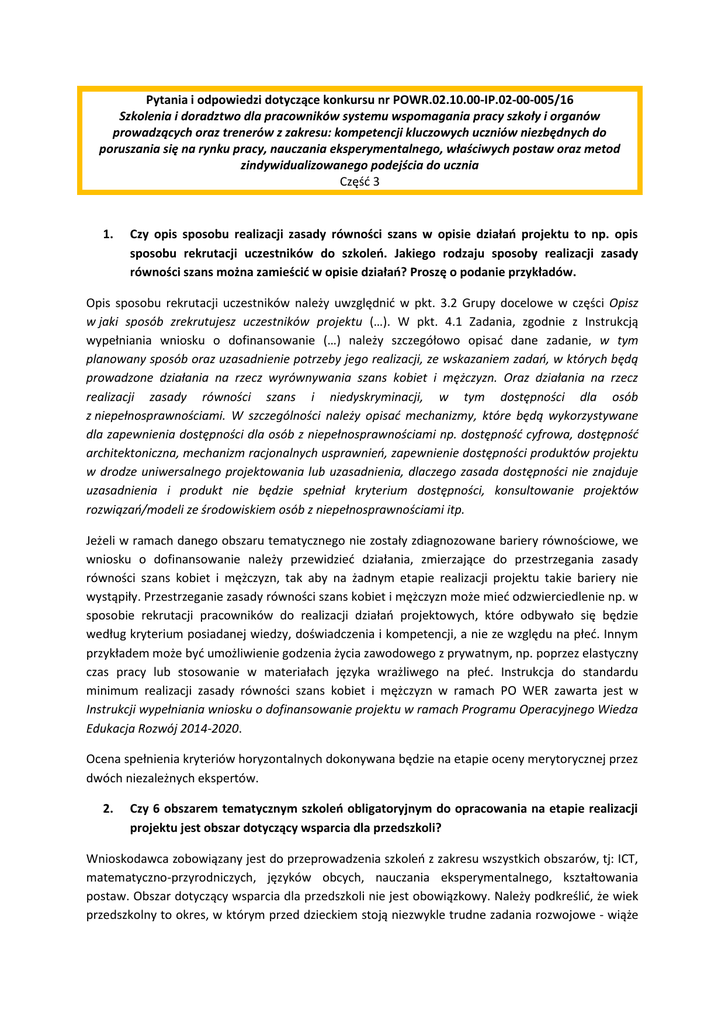 Pytania i odpowiedzi dotyczące konkursu nr POWR.02.10.00-IP.02-00-005/16 Szkolenia i doradztwo dla pracowników systemu wspomagania pracy szkoły i organów prowadzących oraz trenerów z zakresu: kompetencji kluczowych uczniów niezbędnych do poruszania się na rynku pracy, nauczania eksperymentalnego, właściwych postaw oraz metod zindywidualizowanego podejścia do ucznia Część 3 1. Czy opis sposobu realizacji zasady równości szans w opisie działań projektu to np. opis sposobu rekrutacji uczestników do szkoleń. Jakiego rodzaju sposoby realizacji zasady równości szans można zamieścić w opisie działań? Proszę o podanie przykładów. Opis sposobu rekrutacji uczestników należy uwzględnić w pkt. 3.2 Grupy docelowe w części Opisz w jaki sposób zrekrutujesz uczestników projektu (…). W pkt. 4.1 Zadania, zgodnie z Instrukcją wypełniania wniosku o dofinansowanie (…) należy szczegółowo opisać dane zadanie, w tym planowany sposób oraz uzasadnienie potrzeby jego realizacji, ze wskazaniem zadań, w których będą prowadzone działania na rzecz wyrównywania szans kobiet i mężczyzn. Oraz działania na rzecz realizacji zasady równości szans i niedyskryminacji, w tym dostępności dla osób z niepełnosprawnościami. W szczególności należy opisać mechanizmy, które będą wykorzystywane dla zapewnienia dostępności dla osób z niepełnosprawnościami np. dostępność cyfrowa, dostępność architektoniczna, mechanizm racjonalnych usprawnień, zapewnienie dostępności produktów projektu w drodze uniwersalnego projektowania lub uzasadnienia, dlaczego zasada dostępności nie znajduje uzasadnienia i produkt nie będzie spełniał kryterium dostępności, konsultowanie projektów rozwiązań/modeli ze środowiskiem osób z niepełnosprawnościami itp. Jeżeli w ramach danego obszaru tematycznego nie zostały zdiagnozowane bariery równościowe, we wniosku o dofinansowanie należy przewidzieć działania, zmierzające do przestrzegania zasady równości szans kobiet i mężczyzn, tak aby na żadnym etapie realizacji projektu takie bariery nie wystąpiły. Przestrzeganie zasady równości szans kobiet i mężczyzn może mieć odzwierciedlenie np. w sposobie rekrutacji pracowników do realizacji działań projektowych, które odbywało się będzie według kryterium posiadanej wiedzy, doświadczenia i kompetencji, a nie ze względu na płeć. Innym przykładem może być umożliwienie godzenia życia zawodowego z prywatnym, np. poprzez elastyczny czas pracy lub stosowanie w materiałach języka wrażliwego na płeć. Instrukcja do standardu minimum realizacji zasady równości szans kobiet i mężczyzn w ramach PO WER zawarta jest w Instrukcji wypełniania wniosku o dofinansowanie projektu w ramach Programu Operacyjnego Wiedza Edukacja Rozwój 2014-2020. Ocena spełnienia kryteriów horyzontalnych dokonywana będzie na etapie oceny merytorycznej przez dwóch niezależnych ekspertów. 2. Czy 6 obszarem tematycznym szkoleń obligatoryjnym do opracowania na etapie realizacji projektu jest obszar dotyczący wsparcia dla przedszkoli? Wnioskodawca zobowiązany jest do przeprowadzenia szkoleń z zakresu wszystkich obszarów, tj: ICT, matematyczno-przyrodniczych, języków obcych, nauczania eksperymentalnego, kształtowania postaw. Obszar dotyczący wsparcia dla przedszkoli nie jest obowiązkowy. Należy podkreślić, że wiek przedszkolny to okres, w którym przed dzieckiem stoją niezwykle trudne zadania rozwojowe - wiąże się on z przygotowaniem się do pójścia do szkoły. Naturalne procesy, jakim podlega dziecko w okresie przedszkolnym, pozwalają na jego stymulację w kierunku kształtowania kompetencji kluczowych – tworzenie się podwalin pod poszczególnymi kompetencjami kluczowymi jest naturalnie powiązane z procesami rozwojowymi dziecka. W związku z powyższym, uwzględnienie w działaniach projektowych wsparcia przedszkoli wydaje się działaniem istotnym, stanowiącym wartość dodaną każdego projektu. 3. Czy istnieje obostrzenie co do minimalnej liczby uczestników danej grupy (na poszczególna kompetencje) czy zależy to wyłącznie od założeń organizacyjnych projektu? Nie ma warunku dotyczącego minimalnej liczby uczestników danej grupy. Biorąc pod uwagę efektywność prowadzonych szkoleń, zaleca się szkolenia w grupach składających się maksymalnie z 20 osób. 4. W jaki sposób należy rekrutować trenerów do prowadzenia szkoleń? Rekrutacja trenerów do prowadzenia szkoleń powinna odbywać się w sposób konkurencyjny i według kryteriów merytorycznych stanowiących załącznik nr 15 do regulaminu konkursu. 5. Czy zasięg oddziaływania projektu obejmuje cały kraj (wybór w generatorze)? Tak, w generatorze, w pkt. 1.8 wniosku o dofinansowanie należy wybrać cała Polska. 6. Czy wkładem własnym może być koszt sali, hotelu należącego do podmiotu powiązanego? Jeżeli tak to jakim dokumentem można to wnieść do projektu (np. oświadczenie, nota?) Tak. Wkładem własnym mogą być pomieszczenia, które należą do wnioskodawcy i będą wykorzystywane w ramach projektu. Zgodnie z Wytycznymi w zakresie kwalifikowalności wydatków w ramach Europejskiego Funduszu Rozwoju Regionalnego, Europejskiego Funduszu Społecznego oraz Funduszu Spójności na lata 2014-2020 wkładem własnym nie może być wkład niepieniężny, który w ciągu 7 poprzednich lat (10 lat dla nieruchomości) był współfinansowany ze środków unijnych lub/oraz dotacji z krajowych środków publicznych (podwójne finansowanie). Do zestawienia pytań i odpowiedzi zostały dołączone interpretacje Instytucji Zarządzającej PO WER dotyczące wkładu własnego, które mogą stanowić pomocniczy przy tworzeniu wniosku o dofinansowanie. 7. Jaka terminologia obowiązuje w nazewnictwie osób, które będą szkolone? Osoby szkolone to pracownicy instytucji systemu wspomagania, tj. pracownicy placówek doskonalenia nauczycieli, poradni psychologiczno-pedagogicz