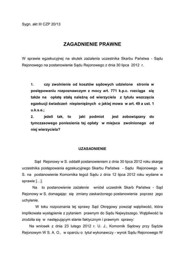 Sygn. akt III CZP 20/13 ZAGADNIENIE PRAWNE W sprawie egzekucyjnej na skutek zażalenia uczestnika Skarbu Państwa - Sądu Rejonowego na postanowienie Sądu Rejonowego z dnia 30 lipca 2012 r. czy zwolnienie od kosztów sądowych udzielone 1. stronie w postępowaniu rozpoznawczym z mocy art. 771 k.p.c. rozciąga się także na opłatę stałą należną od wierzyciela z tytułu wszczęcia egzekucji świadczeń niepieniężnych o jakiej mowa w art. 49 a ust. 1 u.k.s.e.; jeżeli 2. tak, to jaki podmiot jest zobowiązany do tymczasowego poniesienia tej opłaty w miejsce zwolnionego od niej wierzyciela? UZASADNIENIE Sąd Rejonowy w S. oddalił postanowieniem z dnia 30 lipca 2012 roku skargę uczestnika postępowania egzekucyjnego Skarbu Państwa - Sądu Rejonowego w S. na postanowienie Komornika tegoż Sądu z dnia 12 lipca 2012 roku wydane w sprawie […]. Na to postanowienie zażalenie wniósł uczestnik Skarb Państwa - Sąd Rejonowy w S. domagając się zmiany zaskarżonego postanowienia poprzez jego uchylenie. W toku rozpoznania tej sprawy Sąd Okręgowy powziął wątpliwość, która implikowała wystąpienie z pytaniem prawnym do Sądu Najwyższego. Wątpliwość ta zrodziła się w następującym stanie faktycznym i prawnym sprawy: Na wniosek z dnia 23 lutego 2012 r. U. J., Komornik Sądowy przy Sądzie Rejonowym W S. A. O., w oparciu o tytuł wykonawczy - wyrok Sądu Rejonowego W S. z dnia 04 grudnia 2009 r. w sprawie […] wszczął przeciwko dłużnikowi G. S. postępowanie egzekucyjne w celu wyegzekwowania świadczenia polegającego na opróżnieniu lokalu mieszkalnego położonego w S. przy ul. P. […]. Zarządzeniem z dnia 27 lutego 2012 r. Komornik Sądowy A. O. wezwał wierzyciela do usunięcia braków wniosku, w tym do uiszczenia opłaty stałej od wniosku w kwocie 5645,32 zł. Postanowieniem z dnia 22 marca 2012 r. w sprawie […] Sąd skargi – Sąd Rejonowy W S. uchylił czynność komornika z dnia 27 lutego 2012 r. w postaci wezwania do usunięcia braków wniosku i ustalił opłatę egzekucyjną na kwotę 1129,06 zł, a także zwolnił wierzycielkę od ponoszenia kosztów w postępowaniu egzekucyjnym. Postanowieniem z dnia 23 kwietnia 2012 r. Sąd Rejonowy, na wniosek komornika, dokonał w sprawie […] wykładni punktu I. postanowienia z dnia 22 marca 2012 r. w ten sposób, że wyjaśnił, iż wysokość opłaty stałej w nim wskazana dotyczy jedynie sytuacji, w której wniosek egzekucyjny dotyczy opróżnienia jednego pomieszczenia, natomiast w przypadku rozszerzenia wniosku egzekucyjnego przez wierzycielkę Komornik Sądowy będzie uprawniony do pobrania od wierzycielki dalszych opłat stałych, stosownie do treści art. 51 ust. 1 pkt. 3 ustawy o komornikach sądowych i egzekucji, a następnie obciążenia nimi dłużnika. Sąd Rejonowy oddalił wniosek w pozostałej części. Pismem z dnia 08 maja 2012 roku Komornik Sądowy przy Sądzie Rejonowym w S. A. O. wystąpił w sprawie […] do Prezesa Sądu, przy którym działa – Sądu Rejonowego w S. o wyasygnowanie kwoty 1129,60 zł tytułem opłaty stałej za opróżnienie pomieszczenia oraz 113 zł tytułem wydatków. Zarządzeniem z dnia 17 maja 2012 r. Prezes wezwanego Sądu odmówił przekazania kwoty 1129,06 zł tytułem opłaty stałej za opróżnienie lokalu z rzeczy i osób uzasadniając, że należność ta nie należy do kategorii wydatków podlegających pokryciu przez Sąd Rejonowy na podstawie art. 40 ust. 3 ustawy z dnia 29 sierpnia 1997 r. o komornikach sądowych i egzekucji. Zarządzeniem z dnia 28 maja 2012 r. Komornik Sądowy A. O. zwrócił wniosek wierzyciela o wszczęcie postępowania egzekucyjnego. Na skutek skargi wierzyciela, postanowieniem z dnia 03 lipca 2012 r. Sąd egzekucyjny w sprawie […] uchylił zarządzenie z dnia 28 maja 2012 r. i polecił komornikowi Sądowemu przy Sądzie Rejonowym w S. A. O. wydanie postanowienia obciążającego opłatą stałą w kwocie 1129.06 zł Skarb Państwa - Sąd Rejonowy w S. W wykonaniu polecenia Sądu - komornik postanowieniem z dnia 12 lipca 2012 r. ustalił opłatę stałą za opróżnienie pomieszczenia z rzeczy i osób zgodnie z wnioskiem egzekucyjnym wierzyciela - w wysokości 1129,06 zł i obciążył powyższą opłatą Skarb Państwa - Sąd Rejonowy W S. To postanowienie w drodze skargi na czynność komornika zaskarżył wzmiankowany uczestnik postępowania - obciążony jego kosztami Sąd Rejonowy w S. Sąd egzekucyjny - Sąd Rejonowy w S. skargę oddalił argumentując tą decyzję w pierwszym rzędzie linią orzeczniczą Sądu Okręgowego w S. […] sygnalizując jednocześnie w motywach decyzji pogląd, że rozciągnięcie regulacji art. 771 k.p.c. na art. 49 a ustawy o komornikach sądowych i egzekucji jest nieuzasadnione. Sąd Rejonowy stanął na stanowisku, że zwolnienie od kosztów sądowych udzielone w postępowaniu rozpoznawczym rozciąga się na postępowanie egzekucyjne prowadzone przez komornika, ale z zastrzeżeniem uregulowań zawartych w ustawie o komornikach sądowych i egzekucji. Sąd Rejonowy zauważył, że komornik nie jest pracownikiem sądu a swoją działalność utrzymuje z opłat egzekucyjnych. Sąd I instancji dostrzegł związek pomiędzy art. 40 ust.3 u.k.s.e. a art. 771 k.p.c. wskazując, że norma ta daje podstawę do zaliczkowania przez Skarb Państwa na poczet wydatków, w miejsce zwolnionego od kosztów egzekucji wierzyciela. Z brzmienia art. 40 ust. 3 u.k.s.e. Sąd Rejonowy wywiódł, że osoba zwolniona w postępowaniu rozpoznawczym od opłat nie korzysta dobrodziejstwa wskazanej regulacji. Sąd I instancji odwołał się także do art. 49.ust.3 u.k.s.e. dowodząc, że gdyby art. 771 k.p.c. miał zastosowanie w sprawach o egzekucję świadczeń niepieniężnych w zakresie opłat regulacja ta była by zbędna. Sąd Rejonowy odwołał się do wyroku Trybunału Konstytucyjnego z dnia 14 maja 2009 roku K 21/08 (DZ. U. z 2009 r.; Nr 81; poz.687) oraz wyroku Trybunału Konstytucyjnego z dnia 02 czerwca 1999 sy