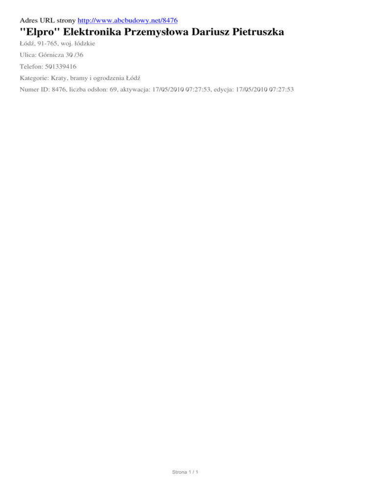 Adres URL strony http://www.abcbudowy.net/8476 "Elpro" Elektronika Przemysłowa Dariusz Pietruszka Łódź, 91-765, woj. łódzkie Ulica: Górnicza 30 /36 Telefon: 501339416 Kategorie: Kraty, bramy i ogrodzenia Łódź Numer ID: 8476, liczba odsłon: 69, aktywacja: 17/05/2010 07:27:53, edycja: 17/05/2010 07:27:53 Strona 1 / 1