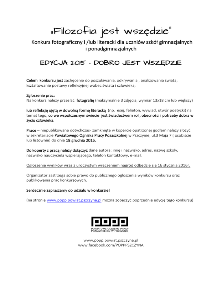 „Filozofia jest wszędzie” Konkurs fotograficzny i /lub literacki dla uczniów szkół gimnazjalnych i ponadgimnazjalnych EDYCJA 2015 – DOBRO JEST WSZĘDZIE Celem konkursu jest zachęcenie do poszukiwania, odkrywania , analizowania świata; kształtowanie postawy refleksyjnej wobec świata i człowieka; Zgłoszenie prac: Na konkurs należy przesłać fotografię (maksymalnie 3 zdjęcia, wymiar 13x18 cm lub większy) lub refleksję ujętą w dowolną formę literacką (np. esej, felieton, wywiad, utwór poetycki) na temat tego, co we współczesnym świecie jest świadectwem roli, obecności i potrzeby dobra w życiu człowieka. Prace – niepublikowane dotychczas- zamknięte w kopercie opatrzonej godłem należy złożyć w sekretariacie Powiatowego Ogniska Pracy Pozaszkolnej w Pszczynie, ul.3 Maja 7 ( osobiście lub listownie) do dnia 18 grudnia 2015. Do koperty z pracą należy dołączyć dane autora: imię i nazwisko, adres, nazwę szkoły, nazwisko nauczyciela wspierającego, telefon kontaktowy, e-mail. Ogłoszenie wyników wraz z uroczystym wręczeniem nagród odbędzie się 16 stycznia 2016r. Organizator zastrzega sobie prawo do publicznego ogłoszenia wyników konkursu oraz publikowania prac konkursowych. Serdecznie zapraszamy do udziału w konkursie! (na stronie www.popp.powiat.pszczyna.pl można zobaczyć poprzednie edycję tego konkursu) www.popp.powiat.pszczyna.pl www.facebook.com/POPPPSZCZYNA