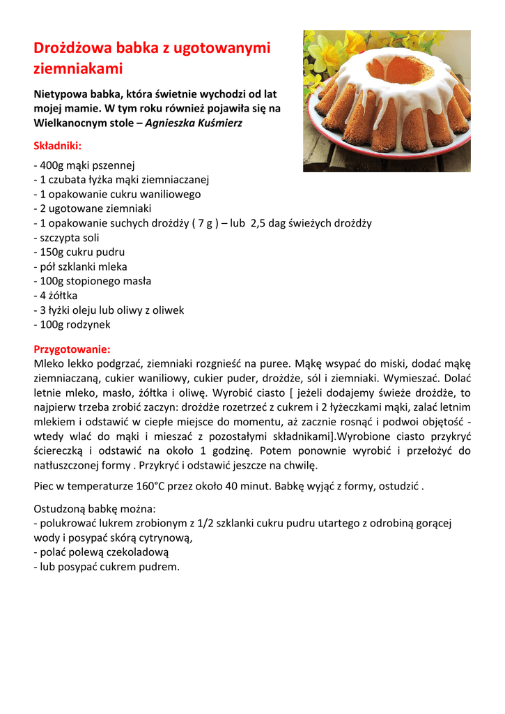 Drożdżowa babka z ugotowanymi ziemniakami Nietypowa babka, która świetnie wychodzi od lat mojej mamie. W tym roku również pojawiła się na Wielkanocnym stole – Agnieszka Kuśmierz Składniki: - 400g mąki pszennej - 1 czubata łyżka mąki ziemniaczanej - 1 opakowanie cukru waniliowego - 2 ugotowane ziemniaki - 1 opakowanie suchych drożdży ( 7 g ) – lub 2,5 dag świeżych drożdży - szczypta soli - 150g cukru pudru - pół szklanki mleka - 100g stopionego masła - 4 żółtka - 3 łyżki oleju lub oliwy z oliwek - 100g rodzynek Przygotowanie: Mleko lekko podgrzać, ziemniaki rozgnieść na puree. Mąkę wsypać do miski, dodać mąkę ziemniaczaną, cukier waniliowy, cukier puder, drożdże, sól i ziemniaki. Wymieszać. Dolać letnie mleko, masło, żółtka i oliwę. Wyrobić ciasto [ jeżeli dodajemy świeże drożdże, to najpierw trzeba zrobić zaczyn: drożdże rozetrzeć z cukrem i 2 łyżeczkami mąki, zalać letnim mlekiem i odstawić w ciepłe miejsce do momentu, aż zacznie rosnąć i podwoi objętość wtedy wlać do mąki i mieszać z pozostałymi składnikami].Wyrobione ciasto przykryć ściereczką i odstawić na około 1 godzinę. Potem ponownie wyrobić i przełożyć do natłuszczonej formy . Przykryć i odstawić jeszcze na chwilę. Piec w temperaturze 160°C przez około 40 minut. Babkę wyjąć z formy, ostudzić . Ostudzoną babkę można: - polukrować lukrem zrobionym z 1/2 szklanki cukru pudru utartego z odrobiną gorącej wody i posypać skórą cytrynową, - polać polewą czekoladową - lub posypać cukrem pudrem. Muffiny (babeczki) pomarańczowe Oryginalny przepis pochodzi ze stronu Kwestia Smaku i z pewnymi modyfikacjami od lat jest bardzo często wykonywany przeze mnie i zjadany ze smakiem przez wszystkich. W tym roku również na Wielkanoc pojawiły się u mnie w domu muffinki (pomarańczowe i czekoladowe) i jako pierwsze z wszystkich ciast zniknęły Przepis ten pozwala na różne wariacje i umieszczanie w cieście przeróżnych dodatków – rodzynek, skórek cytrynowych i pomarańczowych, posiekanych owoców kandyzowanych, suszonej żurawiny, jagód, gruszek, wiśni, kawałków czekolady… i wielu innych. Babeczki można też dekorować na bardzo wiele sposobów – Agnieszka Kuśmierz Składniki: Ok. 30 SZTUK - 600 g mąki pszennej - 4 łyżeczki proszku do pieczenia - 300 g cukru - szczypta soli - sok z połowy pomarańczy - skórki pomarańczowe i rodzynki - 2 opakowaniu cukru wanilinowego - 4 jajka - 500 ml jogurtu, kefiru, maślanki - 250 g masła, roztopionego Przygotowanie: - Masło roztopić i wystudzić - Formę na muffiny wyłożyć papilotkami. Piekarnik nagrzać do 190 stopni C. - Do jednej miski przesiać mąkę razem z proszkiem do pieczenia, wymieszać, dodać cukier, sól, skórkę z cytryny i cukier waniliowy, ponownie wymieszać. - W drugiej misce rozmieszać jajka z jogurtem, kefirem, sokiem pomarańczowym oraz roztopionym i ostudzonym masłem. Krótko zmiksować. - Mokre składniki wlać do sypkich i delikatnie wymieszać łyżką tylko do połączenia się składników. Ciasto może pozostać lekko grudkowate. - Wyłożyć do papilotek i piec przez około 30 minuty. Po wystudzeniu można je dekorować lukrem, polewą lub różnego typu kremami i posypkami, ale i bez tego są pyszne Jeśli chcemy zrobić muffiny czekoladowe wystarczy nie dodawać soku i skórek z pomarańczy – zamiast tego do suchych składników dodajemy pokruszoną czekoladę (może być biała, mleczna lub gorzka) i 2 łyżki kakao Babka Tulipan Przepis pochodzi od naszej wolontariuszki Małgosi – a ona ma go od swojej… „niedoszłej teściowej” ;) Niedoszła teściowa jest już przeszłością, ale przepis na tą nietypową babkę piaskową pozostał. Składniki: - 7 jaj - 1 szklanka cukru - 2 szklanki mąki - 8 łyżek oleju - 2 łyżeczki proszku do pieczenia - 2 łyżeczki kakao - 1 kisiel wiśniowy - pół szklanki suchego maku Przygotowanie : Margarynę ucieramy z cukrem i żółtkami, dołączyć olej, dodać mąkę z proszkiem do pieczenia i na koniec delikatnie dodać ubitą pianę z białek. Ciasto dzielimy na cztery części : - do części pierwszej dodać mak, - do drugiej dodajemy kakao i mieszamy, - część trzecia pozostaje „biała” – nic do niej nie dodajemy, - do części czwartej dodajemy kisiel i mieszamy. Formę wysmarować tłuszczem, ciasto kłaść łyżką do blachy kolejnymi warstwami. Piec około godziny w temperaturze 180 stopni. Po wystygnięciu udekorować babkę kolorowym lukrem lub cukrem pudrem. Jaja pieczarkowe (faszerowane) Oczywiście na Wielkanoc nie może zabraknąć potraw z jajek, a ten przepis na jajka faszerowane dostaliśmy od naszej wolontariuszki Eweliny. Składniki : - 10 jajek - 20 dag pieczarek - szczypiorek - majonez - pieprz, sól - 1 łyżka oleju - odrobina słodkiej papryki - zioła prowansalskie Przygotowanie : Jajka ugotować na twardo, wystudzić, obrać i przeciąć na połówki. Wyjąć żółtka, przełożyć do osobnego naczynia i rozgnieść widelcem. Pieczarki po obraniu zetrzeć na tarce na dużych oczkach, przesmażyć na oleju. Ostudzić, połączyć z żółtkami, dodać drobno pokrojony szczypiorek i majonez ( do połączenia wszystkich składników, niewielka ilość ) Wypełnić połówki jaj farszem, ułożyć na liściach sałaty i udekorować szczypiorkiem oraz rzodkiewką. Sałatka wielowarzywna Przepis na taką sałatkę jest znany chyba w każdym domu i jest obecna na różnego rodzaju świętach i uroczystościach rodzinnych – nie tylko Wielkanocnych Sałatka zwana jest też przez niektórych „bałaganem” ;) Składniki: - 4 jabłka - 4 średnie ziemniaki - 2 pietruszki - średnia cebula - 5 jajek gotowanych - 5 większych ogórków najlepiej kiszonych - 5 większych marchewek - puszka kukurydzy - puszka groszku - majonez - pieprz, sól do smaku Sposób przygotowania: Warzywa: marchew, pietruszkę i ziemniaki gotujemy na wolnym ogniu w łupinkach. Gdy b