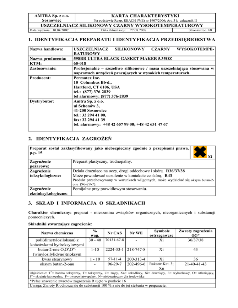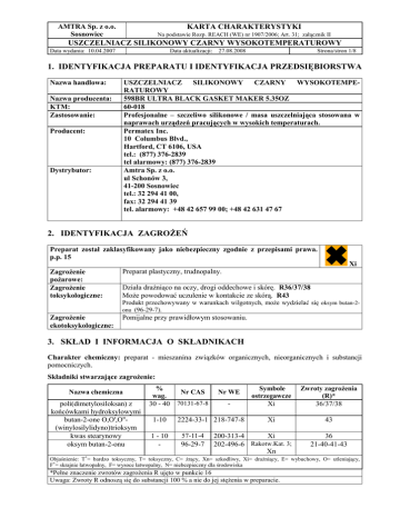 AMTRA Sp. z o.o. Sosnowiec KARTA CHARAKTERYSTYKI Na podstawie Rozp. REACH (WE) nr 1907/2006; Art. 31; załącznik II USZCZELNIACZ SILIKONOWY CZARNY WYSOKOTEMPERATUROWY Data wydania: 10.04.2007 Data aktualizacji: 27.08.2008 Strona/stron 1/8 1. IDENTYFIKACJA PREPARATU I IDENTYFIKACJA PRZEDSIĘBIORSTWA Nazwa handlowa: USZCZELNIACZ SILIKONOWY CZARNY WYSOKOTEMPERATUROWY 598BR ULTRA BLACK GASKET MAKER 5.35OZ 60-018 Profesjonalne – szczeliwo silikonowe / masa uszczelniająca stosowana w naprawach urządzeń pracujących w wysokich temperaturach. Permatex Inc. 10 Columbus Blvd., Hartford, CT 6106, USA tel.: (877) 376-2839 tel alarmowy: (877) 376-2839 Amtra Sp. z o.o. ul Schonów 3, 41-200 Sosnowiec tel.: 32 294 41 00, fax: 32 294 41 39 tel. alarmowy: +48 42 657 99 00; +48 42 631 47 67 Nazwa producenta: KTM: Zastosowanie: Producent: Dystrybutor: 2. IDENTYFIKACJA ZAGROśEŃ Preparat został zaklasyfikowany jako niebezpieczny zgodnie z przepisami prawa. p.p. 15 Xi ZagroŜenie poŜarowe: ZagroŜenie toksykologiczne: Preparat plastyczny, trudnopalny. Działa draŜniąco na oczy, drogi oddechowe i skórę. R36/37/38 MoŜe powodować uczulenie w kontakcie ze skórą. R43 Produkt przechowywany w warunkach wilgotnych, moŜe wydzielać się oksym butan-2onu (96-29-7). ZagroŜenie ekotoksykologiczne: Pomijalne przy prawidłowym stosowaniu. 3. SKŁAD I INFORMACJA O SKŁADNIKACH Charakter chemiczny: preparat - mieszanina związków organicznych, nieorganicznych i substancji pomocniczych. Składniki stwarzające zagroŜenie: Nazwa chemiczna poli(dimetylosiloksan) z końcówkami hydroksylowymi butan-2-one O,O',O''(winylosilylidyno)trioksym kwas stearynowy oksym butan-2-onu % wag. 30 - 40 1-10 1 - 10 - Nr CAS Nr WE 70131-67-8 - 2224-33-1 218-747-8 57-11-4 96-29-7 Symbole ostrzegawcze Xi Zwroty zagroŜenia (R)* 36/37/38 Xi 43 200-313-4 Xi 202-496-6 Rakotw.Kat. 3; Xn 36 21-40-41-43 Objaśnienie: T+= bardzo toksyczny, T= toksyczny, C= Ŝrący, Xn= szkodliwy, Xi= draŜniący, E= wybuchowy, O= utleniający, F+= skrajnie łatwopalny, F= wysoce łatwopalny, N= niebezpieczny dla środowiska *Pełne znaczenie zwrotów zagroŜenia R ujęto w punkcie 16 Uwaga: Zwroty R odnoszą się do substancji 100 % a nie do jej stęŜenia w preparacie. AMTRA Sp. z o.o. Sosnowiec KARTA CHARAKTERYSTYKI Na podstawie Rozp. REACH (WE) nr 1907/2006; Art. 31; załącznik II USZCZELNIACZ SILIKONOWY CZARNY WYSOKOTEMPERATUROWY Data wydania: 10.04.2007 Data aktualizacji: 27.08.2008 Strona/stron 2/8 Ponadto w skład preparatu wchodzą: węglan wapnia Ŝywica polibutylenowa, homopolimer otrzymany na bazie but-1-enu i but-2-enu czarny węgiel 40 - 50 10 - 20 471-34-1 207-439-9 9003-29-6 500-004-7 - = 0,1 – 1 1333-86-4 215-609-9 - - 4. PIERWSZA POMOC Następstwa wdychania: • Wyprowadzić poszkodowana osobę na świeŜe powietrze. UłoŜyć w wygodnej pozycji. Zapewnić ciepło i spokój. • W przypadku wystąpienia takiej potrzeby - wykonać sztuczne oddychanie lub w razie potrzeby podać tlen - najlepiej jeśli tego dokona osoba przeszkolona. Chronić przed utratą ciepła. • Zapewnić pomoc lekarską. Następstwa połknięcia: • Przepłukać usta wodą, dać do wypicia 2-3 szklanki wody, skontaktować się z lekarzem lub centrum toksykologicznym. Nie wywoływać wymiotów. W przypadku samoczynnego wystąpienia wymiotów, ułoŜyć głowę tak, aby nie dopuścić do zachłyśnięcia. • W razie potrzeby przetransportować do szpitala. Choremu zapewnić spokój, leŜenie i ciepło. Kontakt z oczami: • Usunąć szkła kontaktowe. Przemyć zanieczyszczone oczy większą ilością letniej wody przez 15 minut, przy wywiniętych powiekach. Co pewien czas nakładać górną na dolną powiekę. Przykryć oczy opatrunkiem. • W razie potrzeby zapewnić pomoc okulisty. Kontakt ze skórą: • Zdjąć zanieczyszczone ubranie i buty. Oczyścić mechanicznie zanieczyszczoną skórę, przemyć duŜą ilością wody a następnie wodą z łagodnym mydłem. Nie uŜywać jakichkolwiek rozpuszczalników lub rozcieńczalników. • W przypadku gdy podraŜnienie skóry nie przemija, skonsultować się z lekarzem dermatologiem. 5. POSTĘPOWANIE W PRZYPADKU POśARU Preparat plastyczny, trudnopalny. • pianę gaśniczą (odporną na alkohol) • ditlenek węgla (CO2) • proszek gaśniczy, • mgłę wodną. Środki gaśnicze, jakich Nie stosować zwartych strumieni wody. nie naleŜy stosować: Mały poŜar gasić gaśnicą pianową lub ditlenkiem węgla, duŜy poŜar gasić Gaszenie poŜaru: pianą gaśniczą odporną na alkohol lub rozproszoną wodą. Opary strącać mgłą wodną. Pojemniki naraŜone na działania ognia lub wysokiej temperatury chłodzić wodą i w miarę moŜliwości usunąć z zagroŜonego obszaru. Pełne wyposaŜenie ochronne. Sprzęt ochronny Aparaty izolujące drogi oddechowe. straŜaków: Czarne dymy zawierające niebezpieczne produkty spalania, w tym tlenek i Produkty spalania: ditlenek węgla, tlenki azotu. W wyniku podgrzewania produktu wytwarzają się mieszaniny wybuchowe. Uwaga dodatkowa: Do zbierania rozlanej cieczy uŜywać materiały absorbujące. Chronić kanalizację, wody powierzchniowe i grunt przed zanieczyszczeniem. ZagroŜenia poŜarowe: Środki gaśnicze: AMTRA Sp. z o.o. Sosnowiec KARTA CHARAKTERYSTYKI Na podstawie Rozp. REACH (WE) nr 1907/2006; Art. 31; załącznik II USZCZELNIACZ SILIKONOWY CZARNY WYSOKOTEMPERATUROWY Data wydania: 10.04.2007 Data aktualizacji: 27.08.2008 Strona/stron 3/8 6. POSTĘPOWANIE W PRZYPADKU NIEZAMIERZONEGO UWOLNIENIA DO ŚRODOWISKA Środki ochrony indywidualnej: Metody oczyszczania: Zabezpieczenie środowiska: Ubrania ochronne ze zwartej tkaniny, rękawice z tworzywa nitrylowego lub neoprenowego, buty z tworzywa neoprenowego, okulary ochronne w szczelnej obudowie, ochrony dróg oddechowych (filtr cząsteczkowy oznaczony kolorem białym i symbolem P2 oraz filtr par oznaczonym kolorem brązowym i literą A). Usunąć wszelkie potencjalne źródła zapłonu, zabezpieczyć uszkodzone opako