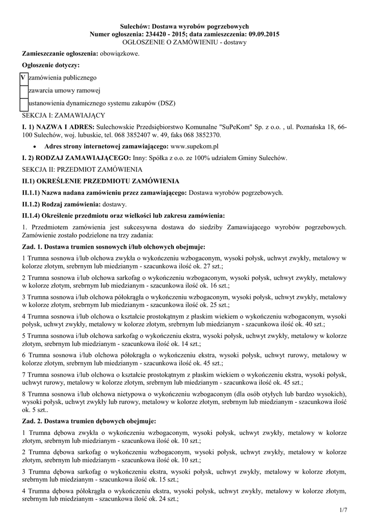 Sulechów: Dostawa wyrobów pogrzebowych Numer ogłoszenia: 234420 - 2015; data zamieszczenia: 09.09.2015 OGŁOSZENIE O ZAMÓWIENIU - dostawy Zamieszczanie ogłoszenia: obowiązkowe. Ogłoszenie dotyczy: V zamówienia publicznego zawarcia umowy ramowej ustanowienia dynamicznego systemu zakupów (DSZ) SEKCJA I: ZAMAWIAJĄCY I. 1) NAZWA I ADRES: Sulechowskie Przedsiębiorstwo Komunalne "SuPeKom" Sp. z o.o. , ul. Poznańska 18, 66100 Sulechów, woj. lubuskie, tel. 068 3852407 w. 49, faks 068 3852370. Adres strony internetowej zamawiającego: www.supekom.pl I. 2) RODZAJ ZAMAWIAJĄCEGO: Inny: Spółka z o.o. ze 100% udziałem Gminy Sulechów. SEKCJA II: PRZEDMIOT ZAMÓWIENIA II.1) OKREŚLENIE PRZEDMIOTU ZAMÓWIENIA II.1.1) Nazwa nadana zamówieniu przez zamawiającego: Dostawa wyrobów pogrzebowych. II.1.2) Rodzaj zamówienia: dostawy. II.1.4) Określenie przedmiotu oraz wielkości lub zakresu zamówienia: 1. Przedmiotem zamówienia jest sukcesywna dostawa do siedziby Zamawiającego wyrobów pogrzebowych. Zamówienie zostało podzielone na trzy zadania: Zad. 1. Dostawa trumien sosnowych i/lub olchowych obejmuje: 1 Trumna sosnowa i/lub olchowa zwykła o wykończeniu wzbogaconym, wysoki połysk, uchwyt zwykły, metalowy w kolorze złotym, srebrnym lub miedzianym - szacunkowa ilość ok. 27 szt.; 2 Trumna sosnowa i/lub olchowa sarkofag o wykończeniu wzbogaconym, wysoki połysk, uchwyt zwykły, metalowy w kolorze złotym, srebrnym lub miedzianym - szacunkowa ilość ok. 16 szt.; 3 Trumna sosnowa i/lub olchowa półokrągła o wykończeniu wzbogaconym, wysoki połysk, uchwyt zwykły, metalowy w kolorze złotym, srebrnym lub miedzianym - szacunkowa ilość ok. 25 szt.; 4 Trumna sosnowa i/lub olchowa o kształcie prostokątnym z płaskim wiekiem o wykończeniu wzbogaconym, wysoki połysk, uchwyt zwykły, metalowy w kolorze złotym, srebrnym lub miedzianym - szacunkowa ilość ok. 40 szt.; 5 Trumna sosnowa i/lub olchowa sarkofag o wykończeniu ekstra, wysoki połysk, uchwyt zwykły, metalowy w kolorze złotym, srebrnym lub miedzianym - szacunkowa ilość ok. 14 szt.; 6 Trumna sosnowa i/lub olchowa półokrągła o wykończeniu ekstra, wysoki połysk, uchwyt rurowy, metalowy w kolorze złotym, srebrnym lub miedzianym - szacunkowa ilość ok. 45 szt.; 7 Trumna sosnowa i/lub olchowa o kształcie prostokątnym z płaskim wiekiem o wykończeniu ekstra, wysoki połysk, uchwyt rurowy, metalowy w kolorze złotym, srebrnym lub miedzianym - szacunkowa ilość ok. 45 szt.; 8 Trumna sosnowa i/lub olchowa nietypowa o wykończeniu wzbogaconym (dla osób otyłych lub bardzo wysokich), wysoki połysk, uchwyt zwykły lub rurowy, metalowy w kolorze złotym, srebrnym lub miedzianym - szacunkowa ilość ok. 5 szt.. Zad. 2. Dostawa trumien dębowych obejmuje: 1 Trumna dębowa zwykła o wykończeniu wzbogaconym, wysoki połysk, uchwyt zwykły, metalowy w kolorze złotym, srebrnym lub miedzianym - szacunkowa ilość ok. 10 szt.; 2 Trumna dębowa sarkofag o wykończeniu wzbogaconym, wysoki połysk, uchwyt zwykły, metalowy w kolorze złotym, srebrnym lub miedzianym - szacunkowa ilość ok. 10 szt.; 3 Trumna dębowa sarkofag o wykończeniu ekstra, wysoki połysk, uchwyt zwykły, metalowy w kolorze złotym, srebrnym lub miedzianym - szacunkowa ilość ok. 15 szt.; 4 Trumna dębowa półokrągła o wykończeniu ekstra, wysoki połysk, uchwyt zwykły, metalowy w kolorze złotym, srebrnym lub miedzianym - szacunkowa ilość ok. 24 szt.; 1/7 5 Trumna dębowa półokrągła o wykończeniu ekstra, wysoki połysk, uchwyt rurowy, metalowy w kolorze złotym, srebrnym lub miedzianym - szacunkowa ilość ok. 10 szt.; 6 Trumna dębowa o kształcie prostokątnym z płaskim wiekiem o wykończeniu ekstra, wysoki połysk, uchwyt zwykły, metalowy w kolorze złotym, srebrnym lub miedzianym - szacunkowa ilość ok. 15 szt.; 7 Trumna dębowa nietypowa o wykończeniu wzbogaconym (dla osób otyłych lub bardzo wysokich), wysoki połysk, uchwyt zwykły lub rurowy, metalowy w kolorze złotym, srebrnym lub miedzianym - szacunkowa ilość ok. 3 szt.; 8 Trumna dębowa ekskluzywna z ekstra wykończeniem wewnętrznym i zewnętrznym, wysoki połysk, uchwyt zwykły lub rurowy, metalowy w kolorze złotym, srebrnym lub miedzianym - szacunkowa ilość ok. 25 szt.; 9 Trumna dębowa ekskluzywna z ekstra wykończeniem wewnętrznym i zewnętrznym o kształcie ośmiokątnym, wysoki połysk, uchwyt zwykły lub rurowy, metalowy w kolorze złotym, srebrnym lub miedzianym - szacunkowa ilość ok. 10 szt. Zad. 3. Dostawa pozostałych wyrobów pogrzebowych obejmuje: 1 Trumna dziecięca biała do 65cm, uchwyt zwykły, metalowy w kolorze złotym, srebrnym lub miedzianym szacunkowa ilość ok. 10 szt.; 2 Trumna dziecięca biała do 1,00m, uchwyt zwykły, metalowy w kolorze złotym, srebrnym lub miedzianym szacunkowa ilość ok. 2 szt.; 3 Trumna dziecięca biała do 1,20m, uchwyt zwykły, metalowy w kolorze złotym, srebrnym lub miedzianym szacunkowa ilość ok. 1 szt.; 4 Trumna dziecięca biała do 1,50m, uchwyt zwykły, metalowy w kolorze złotym, srebrnym lub miedzianym szacunkowa ilość ok. 1 szt.; 5 Trumna kremacyjna - szacunkowa ilość ok. 10 szt.; 6 Obudowa na grób sosnowa, lakierowana, trwale i dokładnie zakonserwowana tj. dokładne bejcowanie i lakierowanie drewna - szacunkowa ilość ok. 100 szt.; 7 Obudowa na grób dębowa, lakierowana, z ekstra wykończeniem, trwale i dokładnie zakonserwowana tj. dokładne bejcowanie i lakierowanie drewna - szacunkowa ilość ok. 110 szt.; 8 Krzyż nagrobny sosnowy i/lub olchowy, lakierowany z wizerunkiem, trwale i dokładnie zakonserwowany tj. dokładne bejcowanie i lakierowanie drewna - szacunkowa ilość ok. 200 szt.; 9 Krzyż nagrobny dębowy, lakierowany z wizerunkiem, z ekstra wykończeniem, trwale i dokładnie zakonserwowany tj. dokładne bejcowanie i lakierowanie drewna - szacunkowa ilość ok. 120 szt.; 10 Trumna ekshumacyjna do 1,00m - szacunkowa ilość ok. 10 szt. 2. Wszystkie trumny muszą: -posiadać standar