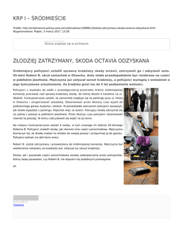 KRP I – ŚRÓDMIEŚCIE Źródło: http://srodmiescie.policja.waw.pl/rs/aktualnosci/38960,Zlodziej-zatrzymany-skoda-octavia-odzyskana.html Wygenerowano: Piątek, 3 marca 2017, 13:28 Strona znajduje się w archiwum. ZŁODZIEJ ZATRZYMANY, SKODA OCTAVIA ODZYSKANA Śródmiejscy policjanci ustalili sprawcę kradzieży skody octavii, zatrzymali go i odzyskali auto. 45-letni Robert B. ukrył samochód w Otwocku. Auto miało prawdopodobnie być rozebrane na części w pobliskim Józefowie. Mężczyzna już usłyszał zarzut kradzieży, a policjanci wystąpią z wnioskiem o jego tymczasowe aresztowanie. Za kradzież grozi mu do 5 lat pozbawienia wolności. Policjanci z wydziału do walki z przestępczością przeciwko mieniu śródmiejskiej komendy pracowali nad sprawą kradzieży skody, do której doszło 4 kwietnia na ul. Okólnik. Funkcjonariusze ustalili, że samochód znajduje się na parkingu przy ul. Hożej w Otwocku i zorganizowali zasadzkę. Obserwowali przez dłuższy czas wjazd do podziemnego garażu budynku i okolice. W poniedziałek wieczorem policjanci zauważyli, jak skoda wyjeżdża z parkingu. Pojechali więc za autem. Kierujący skodą zatrzymał się na jednej z posesji w pobliskim Józefowie. Przez dłuższy czas policjanci obserwowali również tę posesję. W końcu zdecydowali się wejść na jej teren. Na miejscu funkcjonariusze zastali 4 osoby, w tym znanego im dobrze 45-letniego Roberta B. Policjanci znaleźli skodę, jak również inne części samochodowe. Mężczyzna tłumaczył się, że skodę znalazł na drodze do swojej posesji i przepchnął ją do garażu. Policjanci jednak nie dali temu wiary. Robert B. został zatrzymany i przewieziony do śródmiejskiej komendy. Mężczyzna był wielokrotnie notowany za kradzieże aut. Usłyszał już zarzut kradzieży. Skoda, jak i pozostałe części samochodowe zostały zabezpieczone przez policjantów, którzy będą sprawdzać, czy Robert B. nie dopuścił się podobnych przestępstw. ah Ocena: 0/5 (0) Tweetnij