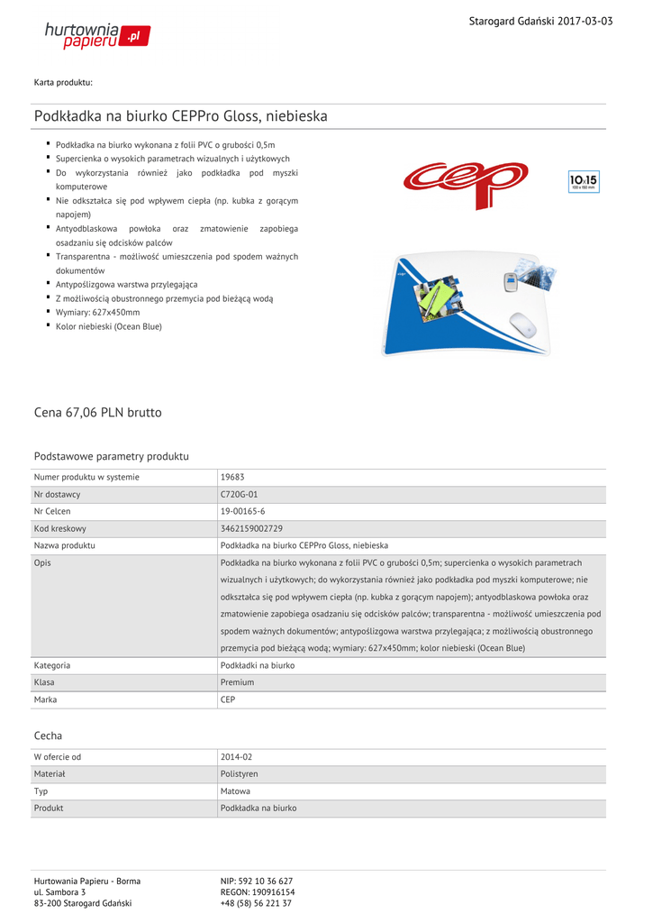 Starogard Gdański 2017-03-03 Karta produktu: Podkładka na biurko CEPPro Gloss, niebieska Podkładka na biurko wykonana z folii PVC o grubości 0,5m Supercienka o wysokich parametrach wizualnych i użytkowych Do wykorzystania również jako podkładka pod myszki komputerowe Nie odkształca się pod wpływem ciepła (np. kubka z gorącym napojem) Antyodblaskowa powłoka oraz zmatowienie zapobiega osadzaniu się odcisków palców Transparentna - możliwość umieszczenia pod spodem ważnych dokumentów Antypoślizgowa warstwa przylegająca Z możliwością obustronnego przemycia pod bieżącą wodą Wymiary: 627x450mm Kolor niebieski (Ocean Blue) Cena 67,06 PLN brutto Podstawowe parametry produktu Numer produktu w systemie 19683 Nr dostawcy C720G-01 Nr Celcen 19-00165-6 Kod kreskowy 3462159002729 Nazwa produktu Podkładka na biurko CEPPro Gloss, niebieska Opis Podkładka na biurko wykonana z folii PVC o grubości 0,5m; supercienka o wysokich parametrach wizualnych i użytkowych; do wykorzystania również jako podkładka pod myszki komputerowe; nie odkształca się pod wpływem ciepła (np. kubka z gorącym napojem); antyodblaskowa powłoka oraz zmatowienie zapobiega osadzaniu się odcisków palców; transparentna - możliwość umieszczenia pod spodem ważnych dokumentów; antypoślizgowa warstwa przylegająca; z możliwością obustronnego przemycia pod bieżącą wodą; wymiary: 627x450mm; kolor niebieski (Ocean Blue) Kategoria Podkładki na biurko Klasa Premium Marka CEP Cecha W ofercie od 2014-02 Materiał Polistyren Typ Matowa Produkt Podkładka na biurko Hurtowania Papieru - Borma ul. Sambora 3 83-200 Starogard Gdański NIP: 592 10 36 627 REGON: 190916154 +48 (58) 56 221 37 Starogard Gdański 2017-03-03 Karta katalogowa produktu cd. Podkładka na biurko CEPPro Gloss, niebieska Wymiary Grubość (mm) 0,5 Wymiary (mm) 627x450 Wspólny słownik zamówień CPV 39263000-3 Wyposażenie biurek Certyfikaty Nowy produkt w ofercie Standard Hit Standard Kolor Kolor Niebieski Pozostałe zdjęcia produktu Serdecznie zapraszamy do współpracy Hurtowania Papieru - Borma zespół. Hurtowania Papieru - Borma ul. Sambora 3 83-200 Starogard Gdański NIP: 592 10 36 627 REGON: 190916154 +48 (58) 56 221 37