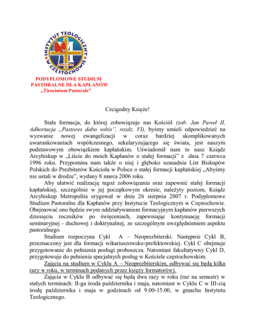 PODYPLOMOWE STUDIUM PASTORALNE DLA KAPŁANÓW „Tirocinium Pastorale” Czcigodny Księże! Stała formacja, do której zobowiązuje nas Kościół (zob. Jan Paweł II, Adhortacja „Pastores dabo vobis”, rozdz. VI), byśmy umieli odpowiedzieć na wyzwanie nowej ewangelizacji w coraz bardziej skomplikowanych uwarunkowaniach współczesnego, sekularyzującego się świata, jest naszym podstawowym obowiązkiem kapłańskim. Uświadomił nam to nasz Ksiądz Arcybiskup w „Liście do moich Kapłanów o stałej formacji” z dnia 7 czerwca 1996 roku. Przypomina nam także o niej i głęboko uzasadnia List Biskupów Polskich do Prezbiterów Kościoła w Polsce o stałej formacji kapłańskiej „Abyśmy nie ustali w drodze”, wydany 8 marca 2006 roku. Aby ułatwić realizację tegoż zobowiązania oraz zapewnić stałej formacji kapłańskiej, szczególnie w jej początkowym okresie, należyty poziom, Ksiądz Arcybiskup Metropolita erygował w dniu 26 sierpnia 2007 r. Podyplomowe Studium Pastoralne dla Kapłanów przy Instytucie Teologicznym w Częstochowie. Obejmować ono będzie swym oddziaływaniem formacyjnym kapłanów pierwszych dziesięciu roczników po święceniach, zapewniając kontynuację formacji seminaryjnej - duchowej i doktrynalnej, ze szczególnym uwzględnieniem aspektu pastoralnego. Studium rozpoczyna Cykl A – Neoprezbiterski. Następnie Cykl B, przeznaczony jest dla formacji wikariuszowsko-prefektowskiej. Cykl C obejmuje przygotowanie do pełnienia posługi proboszcza. Natomiast fakultatywny Cykl D, przygotowuje do pełnienia specjalnych posług w Kościele częstochowskim. Zajęcia na studium w Cyklu A – Neoprezbiterskim, odbywać się będą kilka razy w roku, w terminach podanych przez księży formatorów). Zajęcia w Cyklu B odbywać się będą dwa razy w roku (raz na semestr) w stałych terminach: II-ga środa października i maja, natomiast w Cyklu C w III-cią środę października i maja w godzinach od 9.00-15.00, w gmachu Instytutu Teologicznego. Jeżeli księżom wypadałyby w tych terminach jakieś inne zajęcia duszpasterskie w parafii czy katechetyczne w szkole, są oni zwolnieni z nich przez Księdza Arcybiskupa. Winni jednak poinformować oficjalnie i z wyprzedzeniem czasowym, o tym fakcie, zarówno proboszcza, jak i dyrektora placówki oświatowej, w której są zatrudnieni, kierując do tego ostatniego prośbę o zwolnienie lub urlop bezpłatny. Do uczestnictwa w zajęciach Studium zobowiązani są wszyscy kapłani wyświęceni w ostatnich dziesięciu, za wyjątkiem skierowanych na studia stacjonarne. Kapłani, którzy ukończyli studia licencjackie, nie są zobowiązani do uczestnictwa w spotkaniach cyklu B (od 2-5 lat po święceniach), natomiast nie są oni zwolnieni z Cyklu C (6-10), przygotowującego ich do posługi proboszczowskiej. Kapłani uczestniczący w zajęciach Studium otrzymają na pierwszych zajęciach indeksy, które będą obowiązywały do 10 roku formacji włącznie. Odnotowana będzie w nich nie tylko obecność oraz zaliczenie każdego kolejnego roku formacji, ale także udział w innych obowiązkowych i fakultatywnych spotkaniach formacyjnych (sympozja, zjazdy, rejonówki), a także w dorocznych rekolekcjach kapłańskich. Zaliczenie dziesięcioletniej formacji pastoralnej będzie wymagane nieodzownie do wejścia w grono kandydatów na proboszcza. Brak obecności na obowiązkowych zajęciach raz na semestr, będzie skutkowało koniecznością uzyskania indywidualnego zaliczenia i wpisu do indeksu od prowadzących wykłady i ćwiczenia. Pozostałe, szczegółowe informacje dotyczące funkcjonowania Studium zostaną podane w czasie pierwszych zajęć, w gmachu Instytutu Teologicznego. Zapraszając Czcigodnego Księdza na pierwsze zajęcia w ramach Studium, oczekuję obecności oraz pozdrawiam w Panu DYREKTOR STUDIUM KS. DR HAB. MARIAN DUDA Częstochowa, 15 września 2009 r.
