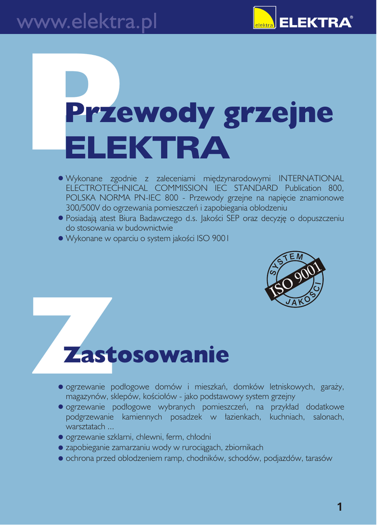 P Przewody grzejne Wykonane zgodnie z zaleceniami międzynarodowymi INTERNATIONAL ELECTROTECHNICAL COMMISSION IEC STANDARD Publication 800, POLSKA NORMA PN-IEC 800 - Przewody grzejne na napięcie znamionowe 300/500V do ogrzewania pomieszczeń i zapobiegania oblodzeniu Posiadają atest Biura Badawczego d.s. Jakości SEP oraz decyzję o dopuszczeniu do stosowania w budownictwie Wykonane w oparciu o system jakości ISO 9001 Z Zastosowanie ogrzewanie podłogowe domów i mieszkań, domków letniskowych, garaży, magazynów, sklepów, kościołów - jako podstawowy system grzejny ogrzewanie podłogowe wybranych pomieszczeń, na przykład dodatkowe podgrzewanie kamiennych posadzek w łazienkach, kuchniach, salonach, warsztatach ... ogrzewanie szklarni, chlewni, ferm, chłodni zapobieganie zamarzaniu wody w rurociągach, zbiornikach ochrona przed oblodzeniem ramp, chodników, schodów, podjazdów, tarasów 1 Z Zalety ogrzewania podłogowego KOMFORT cała obsługa systemu grzejnego ograniczona do ustawienia lub zaprogramowania odpowiedniej temperatury za pomocą regulatora równomierna temperatura w całym pomieszczeniu niska temperatura powierzchni grzejnej ciepła posadzka w krótkim czasie ESTETYKA instalacja grzewcza całkowicie niewidoczna uniknięcie brudnych pomieszczeń takich jak kotłownia ZDROWIE idealne warunki cieplne; równomiernie nagrzane ściany i sufit, temperatura w całym pomieszczeniu wyrównana BEZPIECZEŃSTWO przewód na całej swej długości ekranowany ekran skutecznie uziemiony lub zerowany podłączenie przewodu poprzez wyłącznik różnicowoprądowy eliminuje zagrożenia KOSZTY wyjątkowo niski koszt instalacji systemu w porównaniu z systemami tradycyjnymi niskie koszty eksploatacji dzięki precyzyjnej regulacji temperatury GWARANCJA 10 lat 2 R Rodzaje przewodów grzejnych Jednożyłowe i dwużyłowe przewody grzejne ELEKTRA produkowane są w gotowych zestawach o długości od 4 do 318 m i mocy od 70 do 4500 W. Przewody wykonane są na napięcie znamionowe 220/230V, 50/60 Hz. PRZEWODY DWUŻYŁOWE (jednostronnie zasilane) Tabela 1 10 W/m RODZAJ PRZEWODU 17 W/m RODZAJ PRZEWODU DWUŻYŁOWY DŁUGOŚĆ PRZEWODU MIN. MOC ZESTAWU OZNACZENIE m VCD 10/70 VCD 10/90 VCD 10/110 VCD 10/130 VCD 10/170 VCD 10/200 VCD 10/230 VCD 10/260 VCD 10/310 VCD 10/360 VCD 10/410 VCD 10/460 VCD 10/550 VCD 10/710 VCD 10/900 VCD 10/1100 VCD 10/1220 VCD 10/1470 VCD 10/1560 VCD 10/1730 VCD 10/1900 VCD 10/2070 VCD 10/2250 7 9 11 13 17 20 23 26 31 36 41 46 55 71 90 110 122 147 156 173 190 207 225 DWUŻYŁOWY DŁUGOŚĆ PRZEWODU MIN. MOC ZESTAWU W OZNACZENIE m 70 90 110 130 170 200 230 260 310 360 410 460 550 710 900 1100 1220 1470 1560 1730 1900 2070 2250 VCD 17/100 VCD 17/135 VCD 17/170 VCD 17/220 VCD 17/255 VCD 17/285 VCD 17/340 VCD 17/390 VCD 17/460 VCD 17/530 VCD 17/595 VCD 17/710 VCD 17/915 VCD 17/1170 VCD 17/1425 VCD 17/1595 VCD 17/1920 VCD 17/2040 VCD 17/2260 VCD 17/2480 VCD 17/2720 VCD 17/2920 6 8 10 13 15 17 20 23 27 31 35 42 54 69 84 94 113 120 133 146 160 172 25 W/m RODZAJ PRZEWODU DWUŻYŁOWY DŁUGOŚĆ PRZEWODU MIN. MOC ZESTAWU W OZNACZENIE m W 100 135 170 220 255 285 340 390 460 530 595 710 915 1170 1425 1595 1920 2040 2260 2480 2720 2920 VCD 25/100 VCD 25/175 VCD 25/250 VCD 25/300 VCD 25/350 VCD 25/400 VCD 25/475 VCD 25/550 VCD 25/650 VCD 25/700 VCD 25/875 VCD 25/1100 VCD 25/1425 VCD 25/1750 VCD 25/1925 VCD 25/2250 VCD 25/2450 VCD 25/2750 VCD 25/3000 VCD 25/3250 VCD 25/3550 4 7 10 12 14 16 19 22 26 28 35 44 57 70 77 90 98 110 120 130 142 100 175 250 300 350 400 475 550 650 700 875 1100 1425 1750 1925 2250 2450 2750 3000 3250 3550 UWAGA! Podane w tabeli wartości mogą się różnić o 5%. Zakres stosowania przewodów 25 W/m (patrz tabela 2 - str. 6) wyłącznie na zewnątrz pomieszczeń - podjazdy, chodniki, itp. 3 PRZEWODY JEDNOŻYŁOWE (dwustronnie zasilane) c.d. Tabeli 1 10 W/m RODZAJ PRZEWODU JEDNOŻYŁOWY DŁUGOŚĆ PRZEWODU MIN. MOC ZESTAWU OZNACZENIE m W 7 10 12 15 18 23 28 32 37 44 51 58 64 78 101 127 155 173 208 220 245 269 294 318 70 95 120 145 180 230 280 320 370 440 510 580 640 780 1010 1270 1550 1730 2080 2200 2450 2690 2940 3180 VC 10/70 VC 10/95 VC 10/120 VC 10/145 VC 10/180 VC 10/230 VC 10/280 VC 10/320 VC 10/370 VC 10/440 VC 10/510 VC 10/580 VC 10/640 VC 10/780 VC 10/1010 VC 10/1270 VC 10/1550 VC 10/1730 VC 10/2080 VC 10/2200 VC 10/2450 VC 10/2690 VC 10/2940 VC 10/3180 15 W/m RODZAJ PRZEWODU JEDNOŻYŁOWY DŁUGOŚĆ PRZEWODU MIN. MOC ZESTAWU OZNACZENIE m W 6 8 10 12 15 19 23 26 30 36 42 48 53 64 83 104 127 141 170 180 200 220 240 260 90 120 150 180 220 285 345 390 450 540 630 720 795 960 1240 1560 1900 2110 2550 2700 3000 3300 3600 3900 VC 15/90 VC 15/120 VC 15/150 VC 15/180 VC 15/220 VC 15/285 VC 15/345 VC 15/390 VC 15/450 VC 15/540 VC 15/630 VC 15/720 VC 15/795 VC 15/960 VC 15/1240 VC 15/1560 VC 15/1900 VC 15/2110 VC 15/2550 VC 15/2700 VC 15/3000 VC 15/3300 VC 15/3600 VC 15/3900 20 W/m RODZAJ PRZEWODU JEDNOŻYŁOWY DŁUGOŚĆ PRZEWODU MIN. MOC ZESTAWU OZNACZENIE m W 5 7 9 10 13 16 20 23 26 31 36 41 46 55 71 90 110 123 146 156 173 190 207 225 100 140 170 205 255 320 400 460 520 620 720 820 920 1100 1420 1800 2200 2460 2920 3120 3460 3800 4140 4500 VC 20/100 VC 20/140 VC 20/170 VC 20/205 VC 20/255 VC 20/320 VC 20/400 VC 20/460 VC 20/520 VC 20/620 VC 20/720 VC 20/820 VC 20/920 VC 20/1100 VC 20/1420 VC 20/1800 VC 20/2200 VC 20/2460 VC 20/2920 VC 20/3120 VC 20/3460 VC 20/3800 VC 20/4140 VC 20/4500 UWAGA! Podane w tabeli wartości mogą się różnić o 5%. ZESTAWY GRZEJNE ELEKTRA produkowane są w gotowych kompletach przygotowanych do układania; odmierzone, sprawdzone i połączone oryginalnie z 2,5 m ,, przewodem ,,zimnym (2 x 1,5 mm2) - przewody jednożyłowe (dwustronnie zasilane) ,, lub z 2,5 m przewodem ,,zimnym (3 x 1,5 mm2) - w przypadku zestawów dwużyłowych (jednostronnie zasilanych). UWAGA: W pomieszczeniach mieszkalnych zaleca się stosowanie przewodów dwużyłowych (jednostronnie zasilanych typu VCD). 4 R Regulacja temperatury Nieodzownym elementem systemu