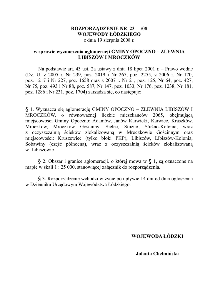 ROZPORZĄDZENIE NR 23 /08 WOJEWODY ŁÓDZKIEGO z dnia 19 sierpnia 2008 r. w sprawie wyznaczenia aglomeracji GMINY OPOCZNO – ZLEWNIA LIBISZÓW I MROCZKÓW Na podstawie art. 43 ust. 2a ustawy z dnia 18 lipca 2001 r. – Prawo wodne (Dz. U. z 2005 r. Nr 239, poz. 2019 i Nr 267, poz. 2255, z 2006 r. Nr 170, poz. 1217 i Nr 227, poz. 1658 oraz z 2007 r. Nr 21, poz. 125, Nr 64, poz. 427, Nr 75, poz. 493 i Nr 88, poz. 587, Nr 147, poz. 1033, Nr 176, poz. 1238, Nr 181, poz. 1286 i Nr 231, poz. 1704) zarządza się, co następuje: § 1. Wyznacza się aglomerację GMINY OPOCZNO – ZLEWNIA LIBISZÓW I MROCZKÓW, o równoważnej liczbie mieszkańców 2065, obejmującą miejscowości Gminy Opoczno: Adamów, Janów Karwicki, Karwice, Kraszków, Mroczków, Mroczków Gościnny, Sielec, Stużno, Stużno-Kolonia, wraz z oczyszczalnią ścieków zlokalizowaną w Mroczkowie Gościnnym oraz miejscowości: Kruszewiec (tylko bloki PKP), Libiszów, Libiszów-Kolonia, Sobawiny (część północna), wraz z oczyszczalnią ścieków zlokalizowaną w Libiszowie. § 2. Obszar i granice aglomeracji, o której mowa w § 1, są oznaczone na mapie w skali 1 : 25 000, stanowiącej załącznik do rozporządzenia. § 3. Rozporządzenie wchodzi w życie po upływie 14 dni od dnia ogłoszenia w Dzienniku Urzędowym Województwa Łódzkiego. WOJEWODA ŁÓDZKI Jolanta Chełmińska UZASADNIENIE do rozporządzenia Wojewody Łódzkiego w sprawie wyznaczenia aglomeracji GMINY OPOCZNO – ZLEWNIA LIBISZÓW I MROCZKÓW W celu wypełnienia zobowiązań Rzeczypospolitej Polskiej, przyjętych w Traktacie Akcesyjnym Polski do Unii Europejskiej, w części dotyczącej dyrektywy 91/271/EWG w sprawie oczyszczania ścieków komunalnych, został sporządzony przez Ministerstwo Środowiska, a następnie zatwierdzony przez rząd RP w dniu 16 grudnia 2003 r., Krajowy program oczyszczania ścieków komunalnych (KPOŚK), który określa plan inwestycyjny w dziedzinie gospodarki wodno-ściekowej, jaki musi zostać zrealizowany przez Polskę, aby osiągnąć wymagane efekty ekologiczne. Program ten zawiera wykaz aglomeracji oraz niezbędnych przedsięwzięć w zakresie budowy, rozbudowy i/lub modernizacji zbiorczych sieci kanalizacyjnych oraz oczyszczalni ścieków komunalnych, także terminy ich realizacji dla wywiązania się z zobowiązań wobec Unii Europejskiej. Ustawa z dnia 18 lipca 2001 r. Prawo wodne (Dz. U. z 2005 r. Nr 239, poz. 2019 ze zm.) wprowadziła w art. 43 ust. 2 definicję aglomeracji, czyli terenu, na którym zaludnienie lub działalność gospodarcza są wystarczająco skoncentrowane, aby ścieki komunalne były zbierane i przekazywane do oczyszczalni ścieków komunalnych. Aglomeracje o wielkości powyżej 2000 równoważnych mieszkańców powinny być wyposażone zgodnie z ww. ustawą w kanalizację i oczyszczalnie ścieków. Artykuł 43 ust. 2a ustawy Prawo wodne z dnia 18 lipca 2001 r. zobowiązuje wojewodów do wyznaczania granic i obszarów aglomeracji, wykazanych w KPOŚK, w drodze aktu prawa miejscowego, po zasięgnięciu opinii zarządu województwa i zainteresowanych gmin. Z dniem 1 stycznia 2005 r. weszło w życie rozporządzenie Ministra Środowiska z dnia 22 grudnia 2004 r. w sprawie sposobu wyznaczania obszaru i granic aglomeracji ( Dz. U. Nr 283, poz. 2841 oraz z 2006 r. Nr 199, poz. 1468), które określa sposób postępowania przy ich wyznaczaniu. Przy piśmie z dnia 26.05.2008 roku Wójt Gminy Opoczno przedłożył do Wojewody projekt planu aglomeracji pod nazwą „Plan Aglomeracji Gminy – Zlewnia Libiszów i Mroczków”. Projekt planu, po zweryfikowaniu przez Wojewodę, pod kątem spełnienia wymogów określonych w rozporządzeniu Ministra Środowiska z dnia 22 grudnia 2004 r., został zgodnie z § 4. ust. 2 cyt. wyżej rozporządzenia, pozytywnie zaopiniowany Uchwałą Nr 895/08 Zarządu Województwa Łódzkiego z dnia 25.06.2008 roku oraz Uchwałą Nr XIX/176/08 Rady Miejskiej w Opocznie z dnia 6.06.2008 roku. Gmina Opoczno położona jest w południowo-wschodniej części województwa łódzkiego, na styku ważnych, historycznie ukształtowanych szlaków komunikacyjnych: drogi krajowej S 12 i Centralnej Magistrali Kolejowej. Dogodne połączenia komunikacyjne zapewnia ponadto sieć dróg wojewódzkich oraz linie kolejowe Koluszki – Skarżysko Kamienna i Tomaszów Mazowiecki. Gmina i miasto Opoczno tworzą gminę miejsko-wiejską położoną w powiecie opoczyńskim. Sąsiaduje z gminami Sławno, Białaczów, Gowarczów (woj. Świętokrzyskie), Gielniów (woj. Mazowieckie), Drzewica, Inowłódz i Poświętne. Teren gminy położony jest w całości w dorzeczu Wisły, w prawej zlewni Pilicy. Sieć hydrograficzną tworzą następujące cieki wodne: − Drzewiczka – z dopływami Wąglanką i ciekiem spod Libiszowa − Słomianka – z dopływem Giełzówką Gospodarka gminy opiera się przede wszystkim na produkcji materiałów budowlanych. Obecnie działają dwie fabryki płytek ceramicznych: „OPOCZNO S.A.” - największy producent w Polsce - oraz „CERAMIKA PARADYŻ SP. Z O.O.”. Do innych ważnych producentów należy „OPTEX S.A.” (włókiennictwo), Z.U.W „Wojciechowski” i Z.P.M. „Stępień” - reprezentujący branżę spożywczą. Ogółem w gminie zarejestrowanych jest 2245 podmiotów gospodarczych. Sieć wodociągowa o długości 195,3 km w całości zaspokaja potrzeby mieszkańców. Opiera się na komunalnych ujęciach wód podziemnych w Opocznie, Kraśnicy i Mroczkowie Gościnnym. Wykonane są również ujęcia w Sitowej i Januszewicach, jednak nie są obecnie eksploatowane. Ponadto na terenie gminy funkcjonuje kilka zakładowych ujęć wody. Łączna długość sieci kanalizacyjnej wynosi 82,9 km, w tym 59,9 km w mieście. Długość przyłączy kanalizacji sanitarnej wynosi 31,3 km, w tym 25 km w mieście. Do sieci kanalizacji sanitarnej podłączonych jest 1880 budynków, w tym 1635 na terenie Opoczna. Do skanalizowanych miejscowości należą: Opoczno, Mroczków, Mroczk