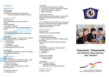 Programm Środa 6.03.2013 18.00 przyjazd 19.00 kolacja 20.00 spotkanie zapoznawczo-integracyjne, informacje dotyczące przebiegu szkolenia czwartek, 7.03.2013 08.00 śniadanie 09.00 Wprowadzenie do tematyki „Praca w zespole polsko-niemieckim“ Ćwiczenie „Tangram“ Podsumowanie oraz wpływ metody na pracę w zespole 10.30 przerwa na kawę 11.00 Normy kulturowe w Polsce i w Niemczech 13.00 obiad 15.00 Metoda projektu - Co to jest? Jak rozumiane jest to pojęcie w Polsce i w Niemczech? Wprowadzenie Praca w grupie Prezentacje Współudział młodzieży (w międzyczasie przerwa na kawę) 18.30 kolacja 20.00 Prezentacja partnerstw szkolnych / wyników spotkań polsko-niemieckich piątek, 8.03.2013 08.00 śniadanie 09.00 Style kierowania, relacja nauczyciel - uczeń Metoda „Bauernhof“ (gospodarstwo rolne) Różnice kulturowe Różnice indywidualne Jak radzić sobie z tymi różnicami w zespole dwunarodo-wym? 10.30 przerwa na kawę 11.00 Giełda metod 13.00 obiad 14.00 Współudział i aktywizacja młodzieży Partycypacja na etapie przygotowania projektu Aktywne uczestnictwo w spotkaniu Metody aktywizacji 15.30 przerwa na kawę 16.00 Współpraca pomiędzy polskimi i niemieckimi szkołami, wykraczajaca poza ramy spotkania młodzieży. Ok. 17.30 Babski pobór do PGR - impreza lokalna w Karczmie z okazji dnia kobiet z kolacją, występem zespołu muzycznego oraz atrakcjami. Wstęp dla Pań i Panów Sobota, 9.03.2013 08.00 śniadanie 09.00 Procedury wspierania PNWM 10:30 przerwa na kawę 10.45 Komunikacja w zespole Metoda „Wie groß ist Pawel?“ (Jakiego wzrostu jest Paweł?) Podsumowanie oraz wpływ metody na pracę w zespole 13.00 obiad 15.00 konflikty i sposoby ich rozwiązywania w zespole polsko-niemieckim Wprowadzenie Przykłady 16.30 przerwa na kawę 17.00 praca w grupach Podsumowanie 18.30 kolacja 20.00 ewaluacja szkolenia wręczenie certyfikatów zakończenie oraz wieczór pożegnalny niedziela, 10.03.2013 śniadanie i wyjazd Teamwork - Dreamwork 06-10.03.2013, Nowe Kramsko (woj. lubuskie) Stowarzyszenie Gmin RP Euroregion Sprewa-NysaBóbr we współpracy z Polsko-Niemiecką Współpracą Młodzieży (PNWM) zaprasza Państwa serdecznie do udziału w szkoleniu: Teamwork − Dreamwork Numer konta, na który należy przelać opłatę za uczestnictwo zostanie Państwu podany wraz z potwierdzeniem uczestnictwa. Osoby kontaktowe Mieczysław Kijewski (Euroregion), tel. 068 455 80 53 e-mail: [email protected] Dominika Gaik (PNWM), tel. 22 518 89 38, e-mail: [email protected] Warunki uczestnictwa Prosimy, aby na szkolenie zgłaszały się jedynie te osoby, które mogą uczestniczyć w całym szkoleniu (od środy do soboty wieczorem włącznie). Zaświadczenia o ukończeniu szkolenia wydamy osobom, które pozostaną do końca szkolenia. Czy Państwo także o tym marzą? Polscy i niemieccy nauczyciele jako „drużyna marzeń“ podczas wymiany szkolnej? Nie możemy obiecać Państwu zrealizowania wszystkich marzeń, możemy jednak zaoferować szkolenie, które pomoże zbliżyć się do tego celu. Szkolenie jest skierowane do nauczycieli, którzy mają już doświadczenia w polsko-niemieckiej wymianie szkolnej i chcą, wraz ze swoimi koleżankami i kolegami ze szkół partnerskich, pracować nad doskonaleniem współ-pracy w dwunarodowych zespołach. Temat i metody Kwoka czy przewodnik stada? – różne style kierowania. Konflikt czy nowe doświadczenie? Co robić, a czego nie? – normy kulturowe w Pol-sce i w Niemczech Co właściwie oznacza (w Niemczech i w Polsce) praca metodą projektu? Od kryzysu do sukcesu – rozwiązywanie konflik-tów w zespole. Komunikacja w zespole Udzielaj się! Ale może nie za bardzo? – współudział młodzieży jako główna zasada działania Termin 6 - 10 marca 2013 Miejsce szkolenia Karczma Taberska 66-111 Nowe Kramsko, Janowiec 1 (gm. Babimost) http://www.karczmataberska.pl Zapewniamy transport z Zielonej Góry do miejsca szkolenia i z powrotem. Organizator Stowarzyszenie Gmin RP Euroregion Sprewa-Nysa-Bóbr Polsko-Niemiecka Współpraca Młodzieży (PNWM) Zakwaterowanie Zostaną Państwo zakwaterowani w pokojach dwuosobowych lub w apartamentach dwupokojowych (po dwie osoby w pokoju). Nie ma możliwosci rezerwacji pokojów jednoosobowych. Zgłoszenia 08.02.2013 Zgłoszenia przyjmujemy do dnia 08.02.2013 wyłącznie poprzez formularz online na stronie: http://wiki.dpjw.org/webform/node/34 Do 12.02.2013 otrzymają Państwo informację wynikach rekrutacji (wyłącznie drogą mailową). o Szkolenie adresujemy głównie do polskich i niemieckich nauczycieli szkół partnerskich i takie zgłoszenia potraktowane zostana priorytetowo. Pozostałe miejsca rozdysponujemy pomiędzy osoby, które zgłosiły się bez partnera lub są spoza Euroregionu. Uczestnicy Maksymalnie 24 nauczycieli z Polski i Niemiec, którzy wraz ze swoim partnerem z Niemiec chcą wzbogadzić i udoskonalić swoją współpracę w polsko-niemieckiej wymianie szkolnej. Koszty szkolenia 100 PLN dla uczestników z Polski 30 Euro dla uczestników z Niemiec. Wpisowe obejmuje koszty zakwaterowania, pełne wyżywienie i koszty programu. Koszty dojazdu ponoszą uczestnicy we własnym zakresie. Prowadzący Natalia Krasowska; trenerka PNWM, koordynatorka projektów w stowarzyszeniu Aktion Zivilcourage e. V. Klaus Waiditschka; dyplomowany pedagog socjalny, trener PNWM, kierownik referatu międzynarodowej współpracy młodzieży w Stowarzyszeniu Pomocy Młodzieży i Pracy Społecznej (Verein für Jugendhilfe und Sozialarbeit e.V.). Czego mogą Państwo od nas oczekiwać? Szanujemy różnice, moderujemy i prowadzimy projekt razem tam, gdzie tylko jest to możliwe. Nie pracujemy w formie wykładów, lecz warsztatowo w małych grupach. Umożliwiamy wypowiadanie się i dyskusje na podstawie Państwa pedagogicznych kompetencji i doświadczeń. Dajemy Państwu możliwość samodzielnego wypróbowania wielu metod pracy w polsko-niemieckim zespole prowadzącym. Oferujemy forum, służące spotkaniom koleż