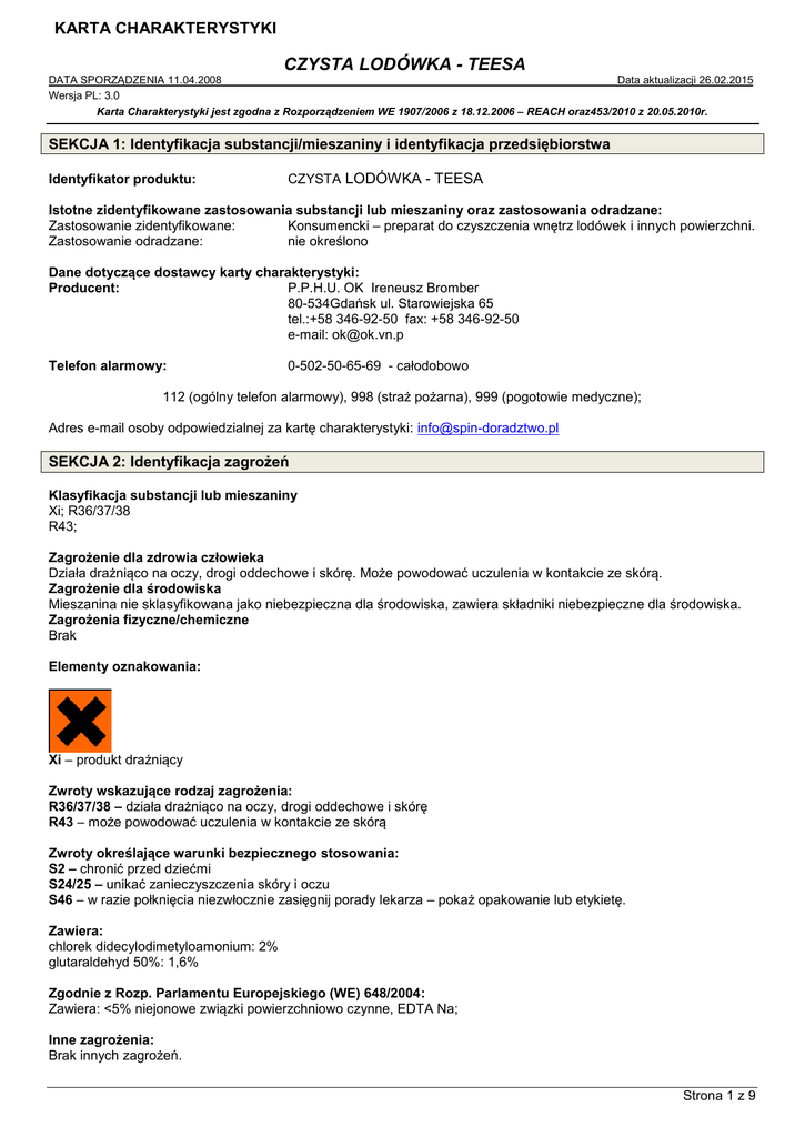 KARTA CHARAKTERYSTYKI CZYSTA LODÓWKA - TEESA DATA SPORZĄDZENIA 11.04.2008 Data aktualizacji 26.02.2015 Wersja PL: 3.0 Karta Charakterystyki jest zgodna z Rozporządzeniem WE 1907/2006 z 18.12.2006 – REACH oraz453/2010 z 20.05.2010r. SEKCJA 1: Identyfikacja substancji/mieszaniny i identyfikacja przedsiębiorstwa Identyfikator produktu: CZYSTA LODÓWKA - TEESA Istotne zidentyfikowane zastosowania substancji lub mieszaniny oraz zastosowania odradzane: Zastosowanie zidentyfikowane: Konsumencki – preparat do czyszczenia wnętrz lodówek i innych powierzchni. Zastosowanie odradzane: nie określono Dane dotyczące dostawcy karty charakterystyki: Producent: P.P.H.U. OK Ireneusz Bromber 80-534Gdańsk ul. Starowiejska 65 tel.:+58 346-92-50 fax: +58 346-92-50 e-mail: [email protected] Telefon alarmowy: 0-502-50-65-69 - całodobowo 112 (ogólny telefon alarmowy), 998 (straż pożarna), 999 (pogotowie medyczne); Adres e-mail osoby odpowiedzialnej za kartę charakterystyki: [email protected] SEKCJA 2: Identyfikacja zagrożeń Klasyfikacja substancji lub mieszaniny Xi; R36/37/38 R43; Zagrożenie dla zdrowia człowieka Działa drażniąco na oczy, drogi oddechowe i skórę. Może powodować uczulenia w kontakcie ze skórą. Zagrożenie dla środowiska Mieszanina nie sklasyfikowana jako niebezpieczna dla środowiska, zawiera składniki niebezpieczne dla środowiska. Zagrożenia fizyczne/chemiczne Brak Elementy oznakowania: Xi – produkt drażniący Zwroty wskazujące rodzaj zagrożenia: R36/37/38 – działa drażniąco na oczy, drogi oddechowe i skórę R43 – może powodować uczulenia w kontakcie ze skórą Zwroty określające warunki bezpiecznego stosowania: S2 – chronić przed dziećmi S24/25 – unikać zanieczyszczenia skóry i oczu S46 – w razie połknięcia niezwłocznie zasięgnij porady lekarza – pokaż opakowanie lub etykietę. Zawiera: chlorek didecylodimetyloamonium: 2% glutaraldehyd 50%: 1,6% Zgodnie z Rozp. Parlamentu Europejskiego (WE) 648/2004: Zawiera: <5% niejonowe związki powierzchniowo czynne, EDTA Na; Inne zagrożenia: Brak innych zagrożeń. Strona 1 z 9 KARTA CHARAKTERYSTYKI CZYSTA LODÓWKA - TEESA DATA SPORZĄDZENIA 11.04.2008 Data aktualizacji 26.02.2015 Wersja PL: 3.0 Karta Charakterystyki jest zgodna z Rozporządzeniem WE 1907/2006 z 18.12.2006 – REACH oraz453/2010 z 20.05.2010r. Brak informacji na temat spełnienia kryteriów PBT lub vPvB zgodnie z załącznikiem XIII rozporządzenia REACH. Odpowiednie badania nie były przeprowadzone. SEKCJA 3: Skład/informacja o składnikach Mieszaniny: Niebezpieczne składniki: Klasyfikacja CLP Identyfikator produktu Sól sodowa EDTA r-r 40% CAS: 64-02-8 WE: 200-573-9 Nr indeksowy: 607-428-00-2 Nr REACH: substancja podlega przepisom okresu przejściowego Chlorek didecylodimetyloamonium CAS: 7173-51-5 WE: 230-525-2 Nr indeksowy: 612-131-00-6 Nr REACH: substancja aktywna nie podlega obowiązkowi rejestracji glutaraldehyd 50% CAS: 111-30-8 WE: 203-856-6 Nr indeksowy: 605-022-00-X Nr REACH: substancja aktywna nie podlega obowiązkowi rejestracji Zawartość % Klasyfikacja wg 67/548/EWG Xn: R22 0,2 Klasa zagrożenia i kody kategorii Kody zwrotów wskazujących rodzaj zagrożenia Acute Tox. 4 Eye Dam.1 H302 H318 Acute Tox. 4 Skin Corr. 1B H302 H314 Acute Tox. 3 (*) Acute Tox. 3 (*) Skin Corr. 1B Resp. Sens. 1 Skin Sens. 1 Aquatic Acute 1 H331 H301 H314 H334 H317 H400 Flam.Liq.2 Eye Irrit.2 STOT SE 3 H225 H319 H336 Flam. Liq. 2 H225 Acute Tox. 4 Eye Dam. 1 H302 H318 Xi R41 Xn; R22 2 C; R34 T; R23/25 1,6 Alkohol izopropylowy CAS: 67-63-0 WE: 200-661-7 2 Nr indeksowy: 603-117-00-0 Nr REACH: substancja podlega przepisom okresu przejściowego Etanol CAS: 64-17-5 WE: 200-578-6 3 Nr indeksowy: Nr REACH: substancja podlega przepisom okresu przejściowego Oksyetylowany alkohol tłuszczowy C12-16 CAS: 68551-12-2 WE: polimer <1 Nr indeksowy : Nr REACH: substancja podlega przepisom okresu przejściowego Pełna treść zwrotów R i H w sekcji 16 C; R34 R42/43 N; R50 F; R11 Xi; R36 R67 F; R11 Xn; R22 Xi; R41 Strona 2 z 9 KARTA CHARAKTERYSTYKI CZYSTA LODÓWKA - TEESA DATA SPORZĄDZENIA 11.04.2008 Data aktualizacji 26.02.2015 Wersja PL: 3.0 Karta Charakterystyki jest zgodna z Rozporządzeniem WE 1907/2006 z 18.12.2006 – REACH oraz453/2010 z 20.05.2010r. SEKCJA 4: Środki pierwszej pomocy Uwagi ogólne: W pierwszej kolejności należy wyprowadzić poszkodowaną osobę z zanieczyszczonego środowiska. W razie wystąpienia problemów zdrowotnych, skontaktować się z lekarzem lub centrum toksykologicznym i przekazać informacje zawarte w karcie charakterystyki. W przypadku kontaktu ze skórą: Zdjąć zanieczyszczoną odzież Umyć zabrudzoną skórę wodą z mydłem, spłukać dokładnie wodą. W przypadku wystąpienia podrażnienia skontaktować się z lekarzem. W przypadku kontaktu z oczami: Przepłukać oczy przez kilkanaście minut (ok. 15) dużą ilością wody, trzymając powieki szeroko rozwarte. Unikać silnego strumienia, ze względu na niebezpieczeństwo uszkodzenia rogówki. W przypadku wystąpienia nieprzemijających podrażnień skontaktować się z lekarzem. Narażenie inhalacyjne: W razie zawrotów głowy lub nudności wyprowadzić poszkodowanego na świeże powietrze. W razie braku szybkiej poprawy skontaktować się z lekarzem. W przypadku połknięcia: Nie wywoływać wymiotów, wypłukać usta i podać do wypicia dużą ilością wody, w przypadku wystąpienia niepokojących, nieprzemijających objawów skontaktować się z lekarzem. Nigdy nie podawać niczego doustnie osobie nieprzytomnej. Najważniejsze ostre i opóźnione objawy oraz skutki narażenia: Układ oddechowy. Wdychanie stężonych par produktu może powodować podrażnienia błon śluzowych układu oddechowego, bóle i zawroty głowy, nudności, wymioty Przewód pokarmowy. Spożycie może wywołać podrażnienia błon śluzowych jamy ustnej, języka, gardła i dalszych odcinków przewodu pokarmowego, po wchłonięciu może wywołać nudności, wymioty, bóle 