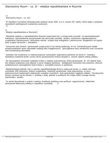 Starożytny Rzym - cz. II - władza republikańska w Rzymie Starożytny Rzym - cz. II W republice rzymskiej obowiązywało spisane około 450r. p.n.e. prawo XII tablic, które legło u podstaw wszystkich późniejszych systemów prawnych. Władza republikańska w Rzymie Oficjalnie władzę w republikańskim Rzymie inspirował lud, a swoją wolę wyrażał na zgromadzeniach ludowych. Zgromadzenie przyjmowało lub odrzucało uchwały senatu, wybierano najważniejszych urzędników państwowych. Wszystkie niemal urzędy były kolegialne i jednoroczne. Wyjątkiem od reguły były urzędy cenzorów i dyktatora. Cenzorów było dwóch i sprawowali urząd przez 5-cio letnią kadencję. W ich kompetencjach leżało przeprowadzanie spisu obywateli według klas majątkowych, sporządzanie listy senatorów oraz czuwanie nad moralnością obywateli. Dyktator był wybierany w nadzwyczajnych sytuacjach zagrożenia państwa na okres 6 miesięcy. Dyktatora wybierał senat i przez okres sprawowania funkcji skupiał w swoich rękach pełnię władzy. Do obowiązków konsulów należała troska o władzę wykonawczą, którą sprawowali. W ich rękach była też władza wojskowa oraz dbanie o życie religijne państwa. Zastępcami konsulów byli pretorzy, których podstawowym obowiązkiem była troska o porządek prawny w państwie. Najistotniejszą jednak rolę w ustroju republikańskiego Rzymu odgrywał senat, w skład, którego wchodziło 300 członków, byłych urzędników. Godność senatorska była dożywotnia, co przy jednorocznych kadencjach większości urzędów rzymskich było gwarantem ciągłości władzy. Teoretycznie konsul zwracał się do senatu z prośbą o radę, jednak w praktyce nie mógł zrobić niczego wbrew stanowisku senatu. To senat decydował o wojnie i pokoju, budżecie państwa oraz polityce zagranicznej i właściwie sprawował faktyczną władzę w republice rzymskiej. http://www.historia.azv.pl Kreator PDF Utworzono 3 March, 2017, 12:36