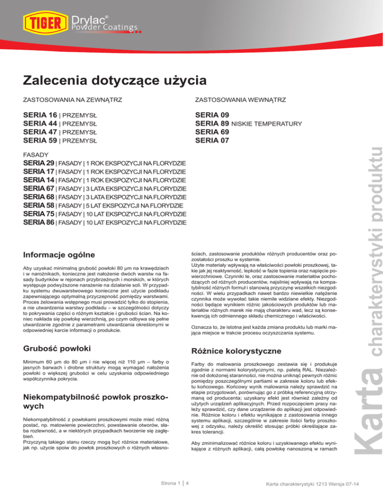 Zastosowania na zewnątrz Zastosowania wewnątrz Seria 16 | przemysł Seria 44 | przemysł Seria 47 | przemysł Seria 59 | przemysł Seria 09 Seria 89 niskie temperatury Seria 69 Seria 07 Fasady Seria 29 | fasady | 1 rok ekspozycji na Florydzie Seria 17 | fasady | 1 rok ekspozycji na Florydzie Seria 14 | fasady | 1 rok ekspozycji na Florydzie Seria 67 | fasady | 3 lata ekspozycji na Florydzie Seria 68 | fasady | 3 lata ekspozycji na Florydzie Seria 58 | fasady | 5 lat ekspozycji na Florydzie Seria 75 | fasady | 10 lat ekspozycji na Florydzie Seria 86 | fasady | 10 lat ekspozycji na Florydzie Informacje ogólne ściach, zastosowanie produktów różnych producentów oraz pozostałości proszku w systemie. Użyte materiały wpływają na właściwości powłoki proszkowej, takie jak jej reaktywność, lepkość w fazie topienia oraz napięcie powierzchniowe. Czynniki te, oraz zastosowanie materiałów pochodzących od różnych producentów, najsilniej wpływają na kompatybilność różnych formuł i stanowią przyczynę wszelkich niezgodności. W wielu przypadkach nawet bardzo niewielkie natężenie czynnika może wywołać takie niemile widziane efekty. Niezgodności będące wynikiem różnic jakościowych produktów lub materiałów różnych marek nie mają charakteru wad, lecz są konsekwencją ich odmiennego składu chemicznego i właściwości. Aby uzyskać minimalną grubość powłoki 80 µm na krawędziach i w narożnikach, konieczne jest nałożenie dwóch warstw na fasady budynków w rejonach przybrzeżnych i morskich, w których występuje podwyższone narażenie na działanie soli. W przypadku systemu dwuwarstwowego konieczne jest użycie podkładu zapewniającego optymalną przyczepność pomiędzy warstwami. Proces żelowania wstępnego musi prowadzić tylko do stopienia, a nie utwardzenia warstwy podkładu – w szczególności dotyczy to pokrywania części o różnym kształcie i grubości ścian. Na koniec nakłada się powłokę wierzchnią, po czym odbywa się pełne utwardzanie zgodnie z parametrami utwardzania określonymi w odpowiedniej karcie informacji o produkcie. Oznacza to, że istotna jest każda zmiana produktu lub marki mająca miejsce w trakcie procesu oczyszczania systemu. Grubość powłoki Różnice kolorystyczne Minimum 60 µm do 80 µm i nie więcej niż 110 µm – farby o jasnych barwach i drobne struktury mogą wymagać nałożenia powłoki o większej grubości w celu uzyskania odpowiedniego współczynnika pokrycia. Farby do malowania proszkowego zestawia się i produkuje zgodnie z normami kolorystycznymi, np. paletą RAL. Niezależnie od dołożonej staranności, nie można uniknąć pewnych różnic pomiędzy poszczególnymi partiami w zakresie koloru lub efektu końcowego. Końcowy wynik malowania należy sprawdzić na etapie przygotowań, porównując go z próbką referencyjną otrzymaną od producenta; uzyskany efekt jest również zależny od użytych urządzeń aplikacyjnych. Przed rozpoczęciem pracy należy sprawdzić, czy dane urządzenie do aplikacji jest odpowiednie. Różnice koloru i efektu wynikające z zastosowania innego systemu aplikacji, szczególnie w zakresie ilości farby proszkowej z odzysku, należy określić stosując próbki określające zakres tolerancji. Niekompatybilność powłok proszkowych Niekompatybilność z powłokami proszkowymi może mieć różną postać, np. matowienie powierzchni, powstawanie otworów, słaba rozlewność, a w niektórych przypadkach tworzenie się zagłębień. Przyczyną takiego stanu rzeczy mogą być różnice materiałowe, jak np. użycie spoiw do powłok proszkowych o różnych własno- Strona 1 Aby zminimalizować różnice koloru i uzyskiwanego efektu wynikające z różnych aplikacji, całą powłokę nanoszoną w ramach |4 Karta charakterystyki produktu Zalecenia dotyczące użycia Karta charakterystyki 1213 Wersja 07-14 W przypadku zginania już pomalowanych elementów należy przeprowadzić test przydatności na oryginalnych częściach przed rozpoczęciem produkcji seryjnej, gdyż na parametry gięcia mają wpływ czynniki takie, jak sposób działania zaginarki, rodzaj stopu, obróbka wstępna, promień zgięcia, warunki gięcia (środowiskowe), temperatura, grubość ścianek i powłoki, warunki utwardzania, kolor, czas przechowywania i inne. Mikroskopijne pęknięcia powłoki proszkowej mogą prowadzić do uszkodzeń w wyniku korozji. Nakładanie kolejnych warstw i/lub odświeżanie dokonywane w ramach zastosowań architektonicznych nie pozostaje w zgodności z wytycznymi jakościowymi publikowanymi przez GSB i QUALICOAT. Jeżeli jednak działania takie są przeprowadzane, wówczas należy zwrócić uwagę na odpowiednie przyleganie do podłoża, nieprawidłowości powłok oraz na składniki strukturalne i właściwości materiału. Przed ponownym malowaniem konieczne jest oszlifowanie powierzchni i oczyszczenie jej w celu usunięcia pyłu szlifierskiego. Podczas nakładania nowej warstwy należy postępować zgodnie z zaleceniami zawartymi w odpowiedniej karcie charakterystyki produktu. Trwałość – powłoka jednowarstwowa a dwuwarstwowa W przypadku zastosowań architektonicznych produkty oznaczone jako farby z efektem metalicznym do malowania dwuwarstwowego należy pokryć warstwą lakieru bezbarwnego przeznaczonego do tego rodzaju zastosowań. O trwałości decyduje przede wszystkim metoda i rodzaj aplikacji (jedno- lub dwuwarstwowa). Trwałość metalicznej powłoki proszkowej zależy od produktu. Należy ją uzgodnić z producentem uwzględniając wymagania specjalne, np. w zakresie odporności na ścieranie i zarysowanie, sposobu czyszczenia, stabilności koloru i odporności chemicznej. Wszystkie prace związane z odświeżaniem muszą być wykonywane przez firmę specjalistyczną w celu przywrócenia funkcjonalności powłoki i ogólnego efektu wizualnego w stopniu możliwie zgodnym ze stanem oryginalnym. W każdym przypadku należy najpierw przetestować 