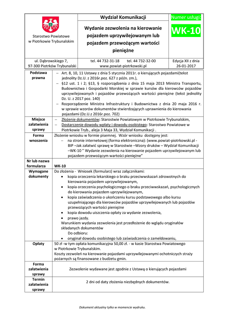 Wydział Komunikacji Numer usługi: Starostwo Powiatowe w Piotrkowie Trybunalskim Wydanie zezwolenia na kierowanie pojazdem uprzywilejowanym lub pojazdem przewożącym wartości pieniężne WK-10 ul. Dąbrowskiego 7, 97-300 Piotrków Trybunalski tel. 44 732-31-18 tel. 44 732-32-00 www.powiat-piotrkowski.pl Edycja XII z dnia 26-01-2017 Podstawa prawna Miejsce załatwienia sprawy Forma wnoszenia Nr lub nazwa formularza Wymagane dokumenty Opłaty Forma załatwienia sprawy Termin załatwienia sprawy Art. 8, 10, 11 Ustawy z dnia 5 stycznia 2011r. o kierujących pojazdami(tekst jednolity Dz.U. z 2016r.poz. 627 z późn. zm.), §12 ust. 1 i 2; §13, § rozporządzenia z dnia 15 maja 2013 Ministra Transportu, Budownictwa i Gospodarki Morskiej w sprawie kursów dla kierowców pojazdów uprzywilejowanych i pojazdów przewożących wartości pieniężne (tekst jednolity Dz. U. z 2017 poz. 140) Rozporządzenie Ministra Infrastruktury i Budownictwa z dnia 20 maja 2016 r. w sprawie wzorów dokumentów stwierdzających uprawnienia do kierowania pojazdami (Dz.U.z 2016r.poz. 702) Złożenie dokumentów: Starostwie Powiatowym w Piotrkowie Trybunalskim, Dostarczenie dowodu wpłaty i dowodu osobistego: Starostwo Powiatowe w Piotrkowie Tryb., aleja 3 Maja 33, Wydział Komunikacji . Złożenie wniosku w formie pisemnej. Wzór wniosku dostępny jest: na stronie internetowej (forma elektroniczna): (www.powiat-piotrkowski.pl BIP –Jak załatwić sprawę w Starostwie –Wzory druków – Wydział Komunikacji –WK-10 ” Wydanie zezwolenia na kierowanie pojazdem uprzywilejowanym lub pojazdem przewożącym wartości pieniężne” WK-10 Do złożenia - Wniosek (formularz) wraz załącznikami: kopia orzeczenia lekarskiego o braku przeciwwskazań zdrowotnych do kierowania pojazdem uprzywilejowanym, kopia orzeczenia psychologicznego o braku przeciwwskazań, psychologicznych do kierowania pojazdem uprzywilejowanym, kopia zaświadczenia o ukończeniu kursu podstawowego albo kursu uzupełniającego dla kierowców pojazdów uprzywilejowanych lub pojazdów przewożących wartości pieniężne kopia dowodu uiszczenia opłaty za wydanie zezwolenia, prawo jazdy. Warunkiem wydania zezwolenia jest przedłożenie do wglądu oryginałów składanych dokumentów Do odbioru: oryginał dowodu osobistego lub zaświadczenia o zameldowaniu, 50 zł -w tym opłata komunikacyjna 50,00 zł. - w kasie Starostwa Powiatowego w Piotrkowie Trybunalskim. Koszty zezwoleń na kierowanie pojazdami uprzywilejowanymi ochotniczych straży pożarnych są finansowane z budżetu gmin. Zezwolenie wydawane jest zgodnie z Ustawą o kierujących pojazdami 2 dni od daty złożenia niezbędnych dokumentów. Dokument aktualny tylko w momencie wydruku. Wydział Komunikacji Numer usługi: Starostwo Powiatowe w Piotrkowie Trybunalskim Wydanie zezwolenia na kierowanie pojazdem uprzywilejowanym lub pojazdem przewożącym wartości pieniężne WK-10 ul. Dąbrowskiego 7, 97-300 Piotrków Trybunalski tel. 44 732-31-18 tel. 44 732-32-00 www.powiat-piotrkowski.pl Edycja XII z dnia 26-01-2017 Tryb odwoławczy Informacje dodatkowe Odwołanie wnosi się w terminie 14 dni od daty otrzymania decyzji do Samorządowego Kolegium Odwoławczego w Piotrkowie Tryb., za pośrednictwem Starosty Piotrkowskiego. Warunkiem wydania zezwolenia jest przedłożenie do wglądu oryginałów składanych dokumentów Dokument aktualny tylko w momencie wydruku.